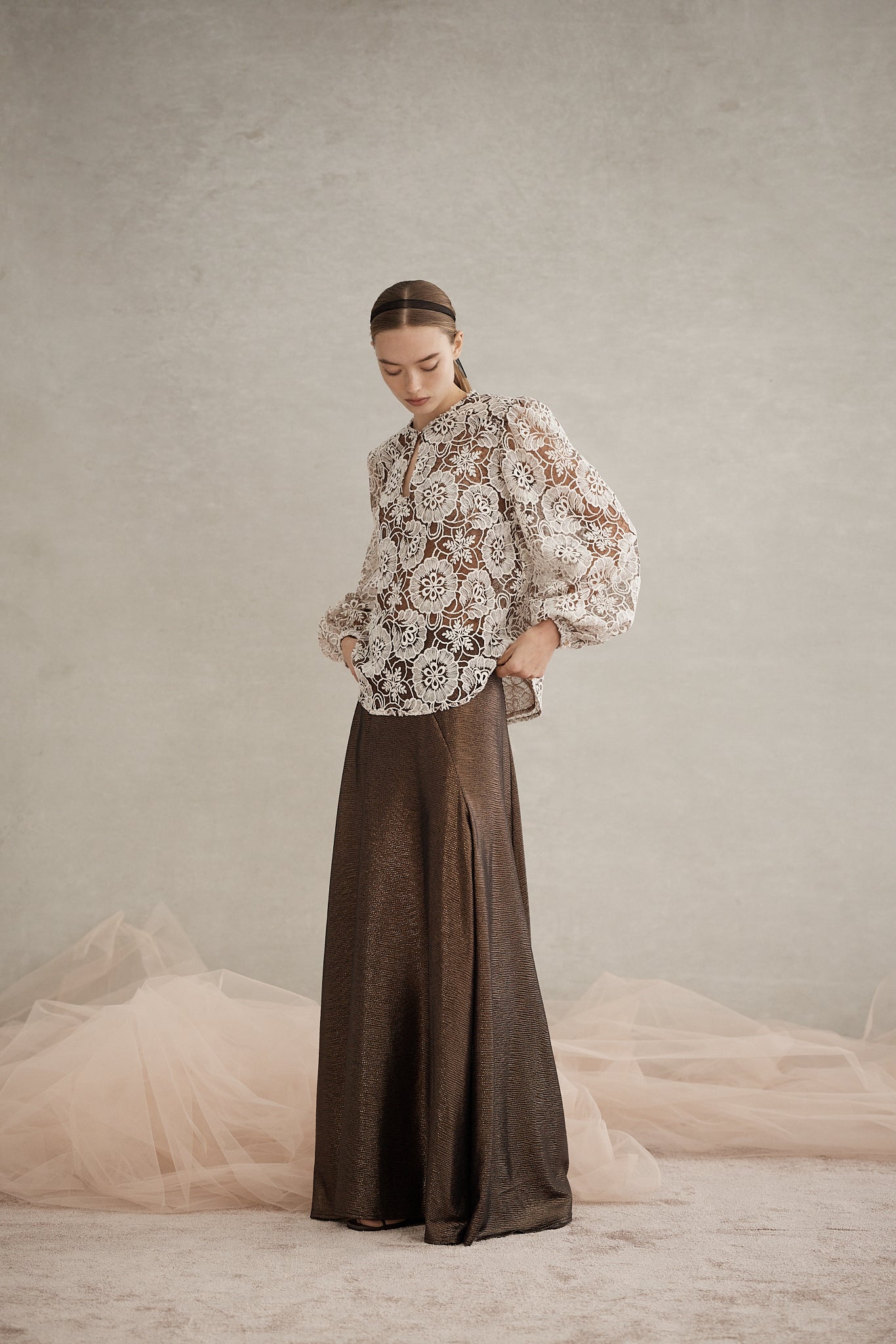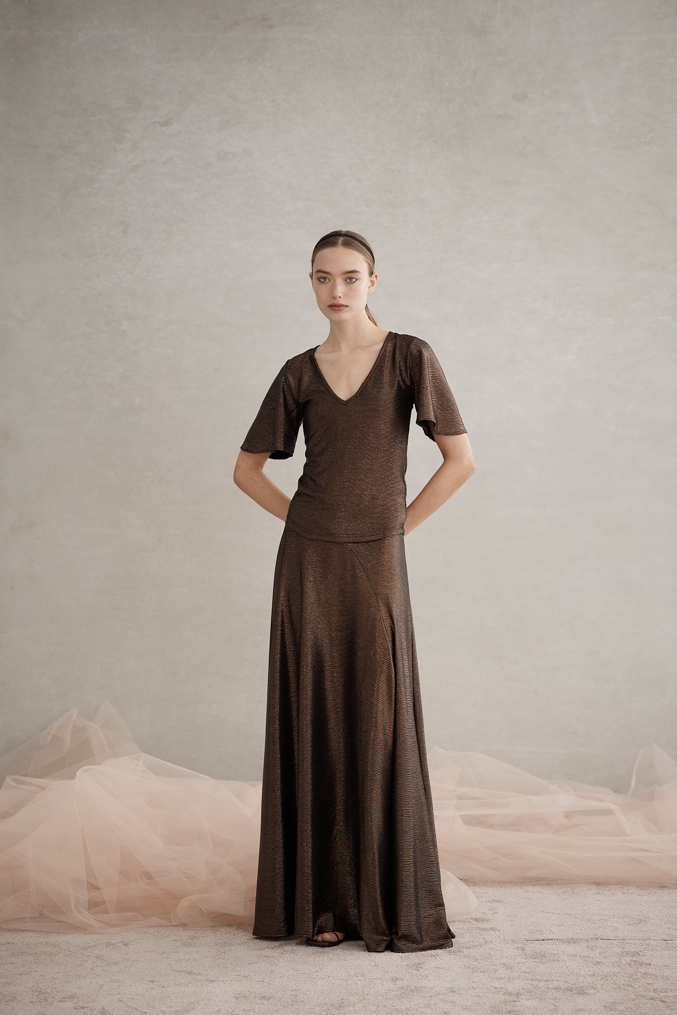 Our Fluted Como Maxi Skirt in rich Mocha is a fluid, feminine silhouette designed in our signature stretch metallic fabrication. The skirt features an easy pull-on elastic waistband, a fluted hemline and subtle side split.