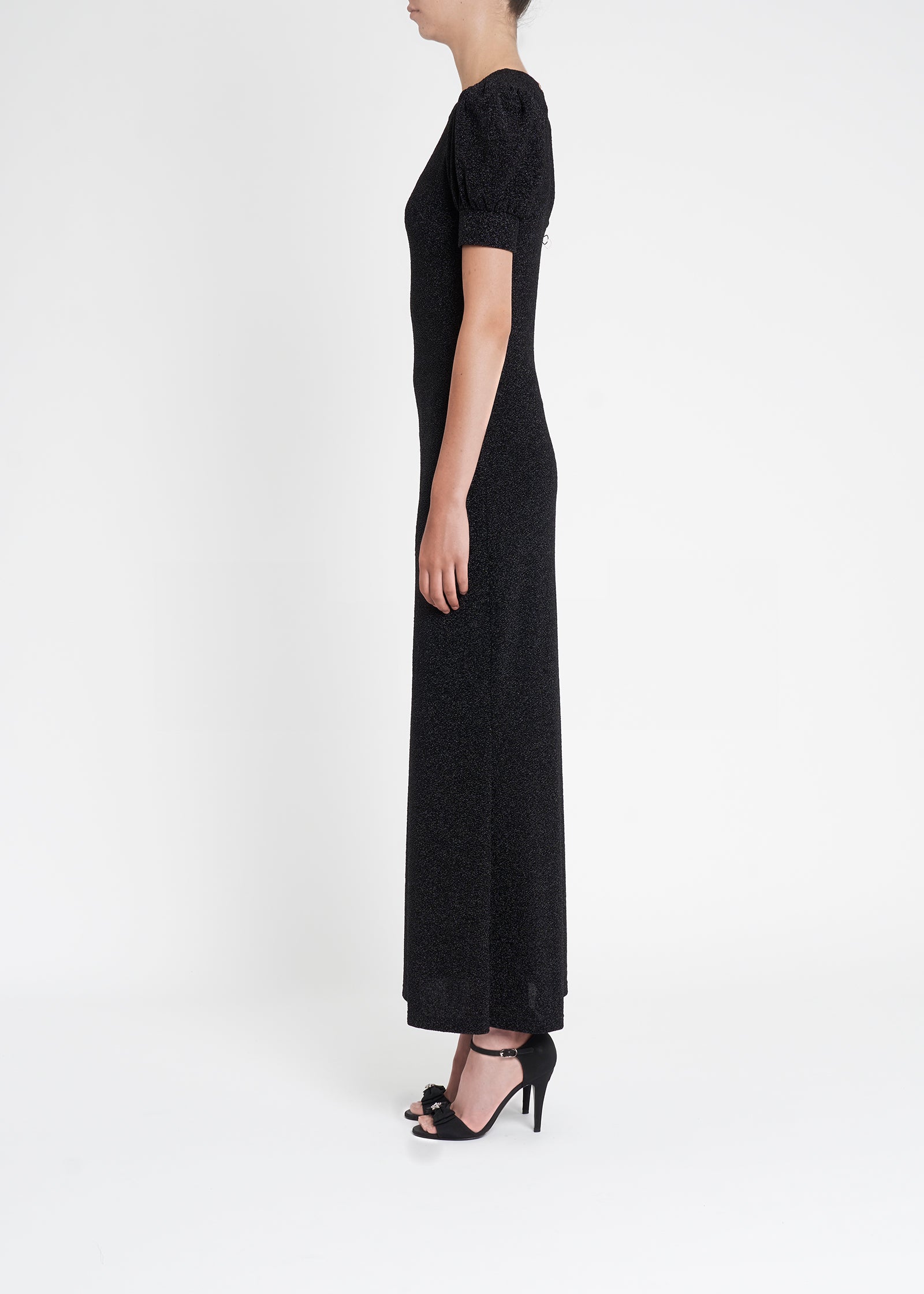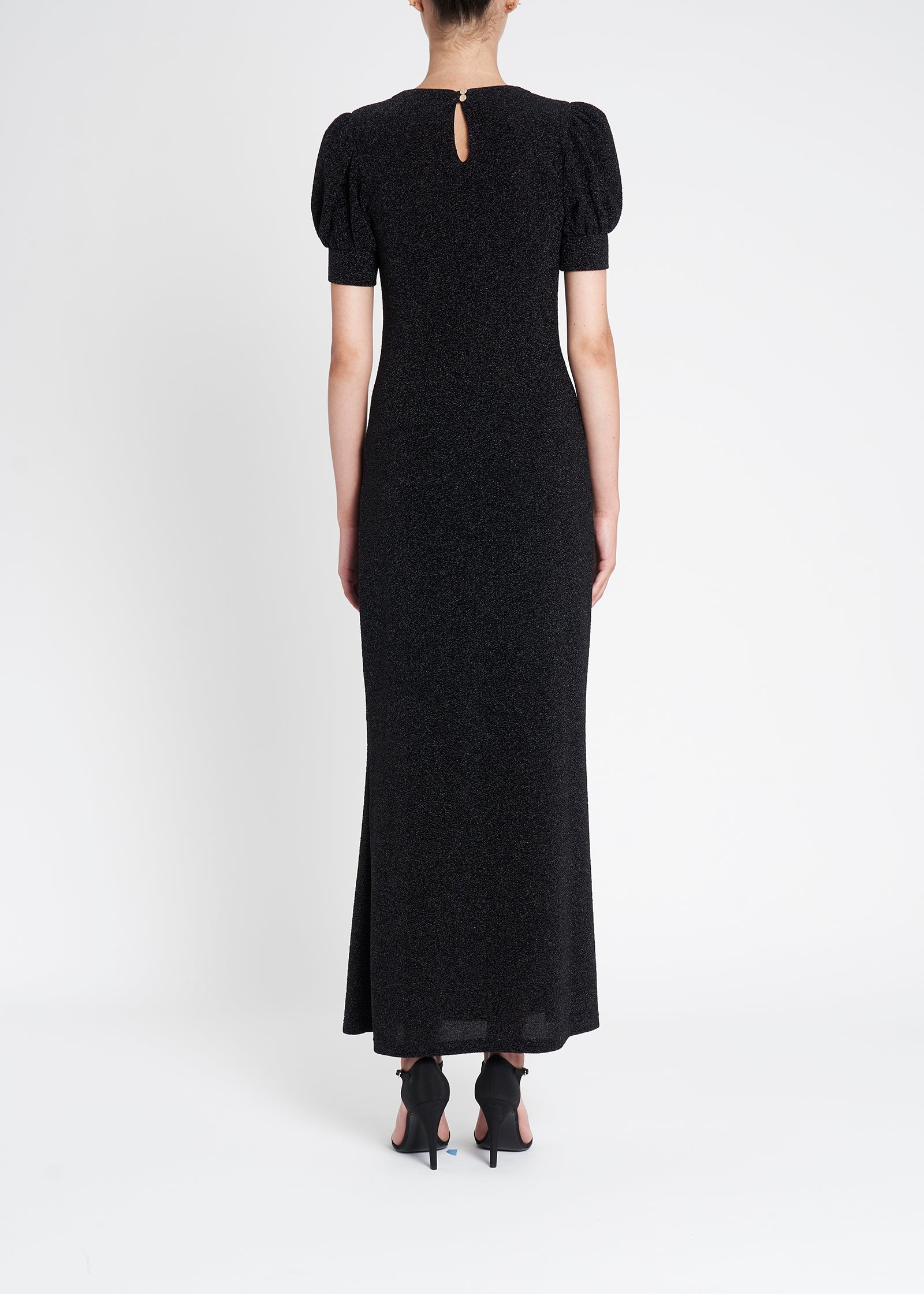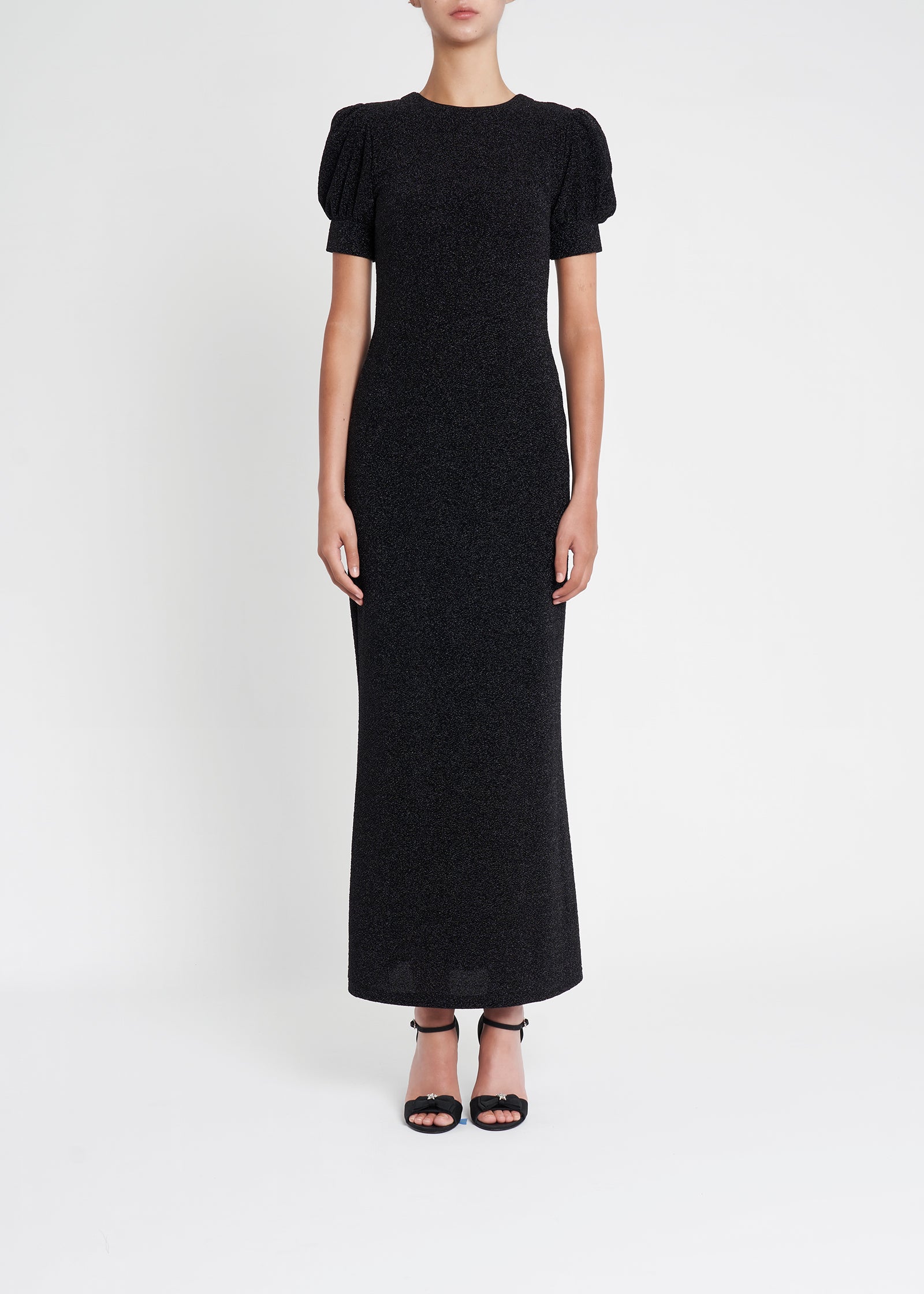 The Como MaxiDress in Black Metallic Knit is a fitted tube style mini dress featuring a round neckline with piping detail and dramatic puff sleeves.