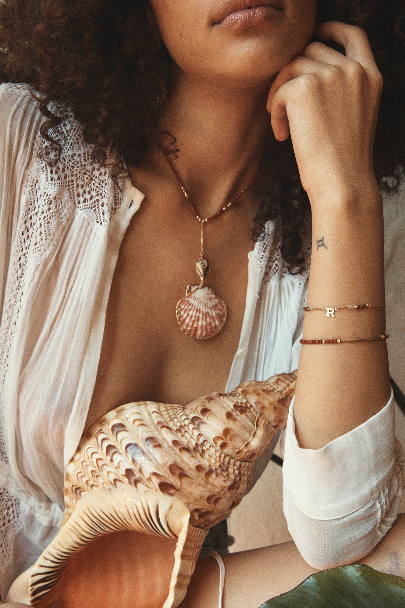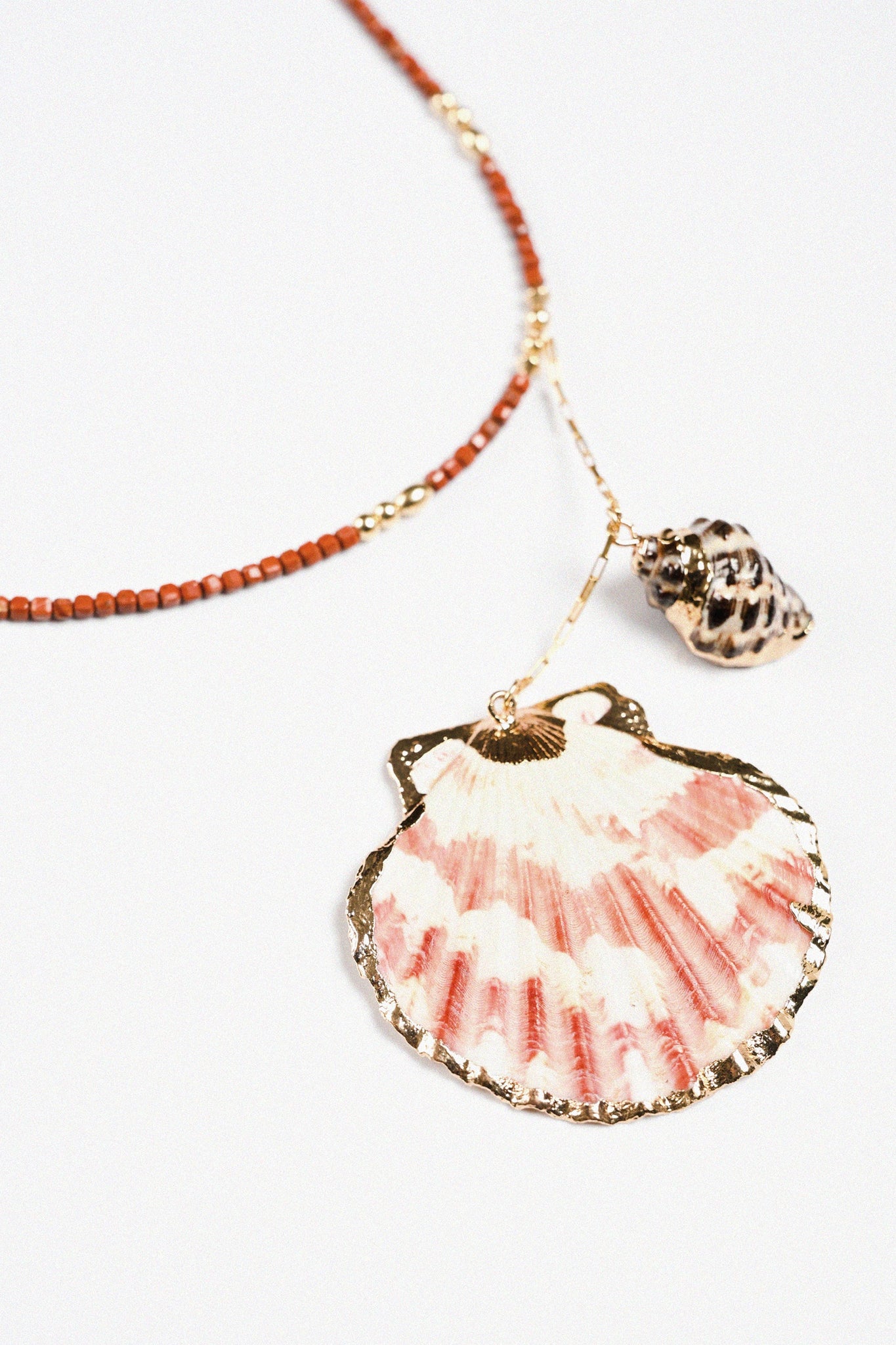 The cleopatra shell necklace showcases a refined string of jasper beads, centred by a bold shell.