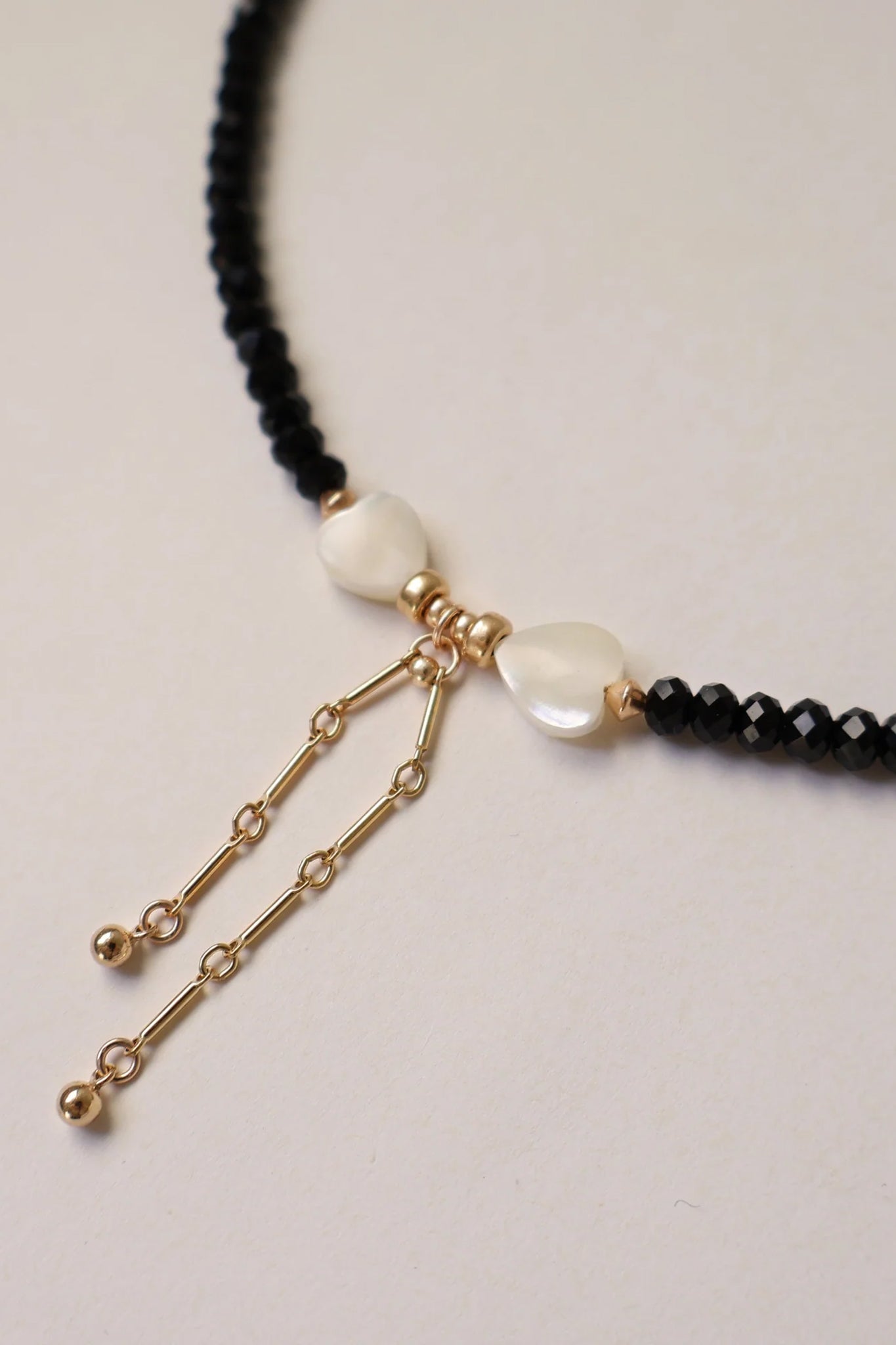 A statement Mother of Pearl and gold filled bow feature, surrounded by a string of black Malaysian Jade beads.