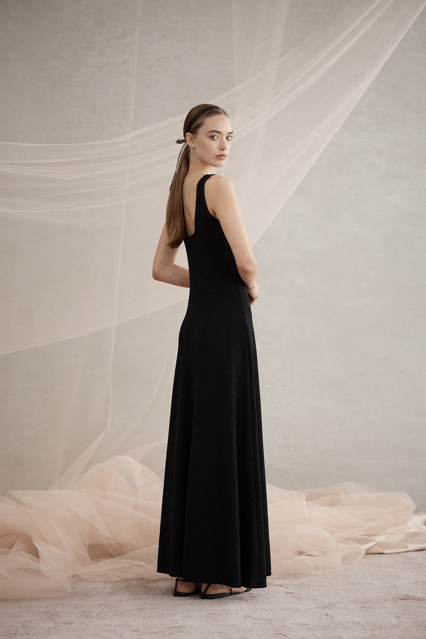 Bella Scooped Neck Fluted Maxi Dress | Black Metallic Knit