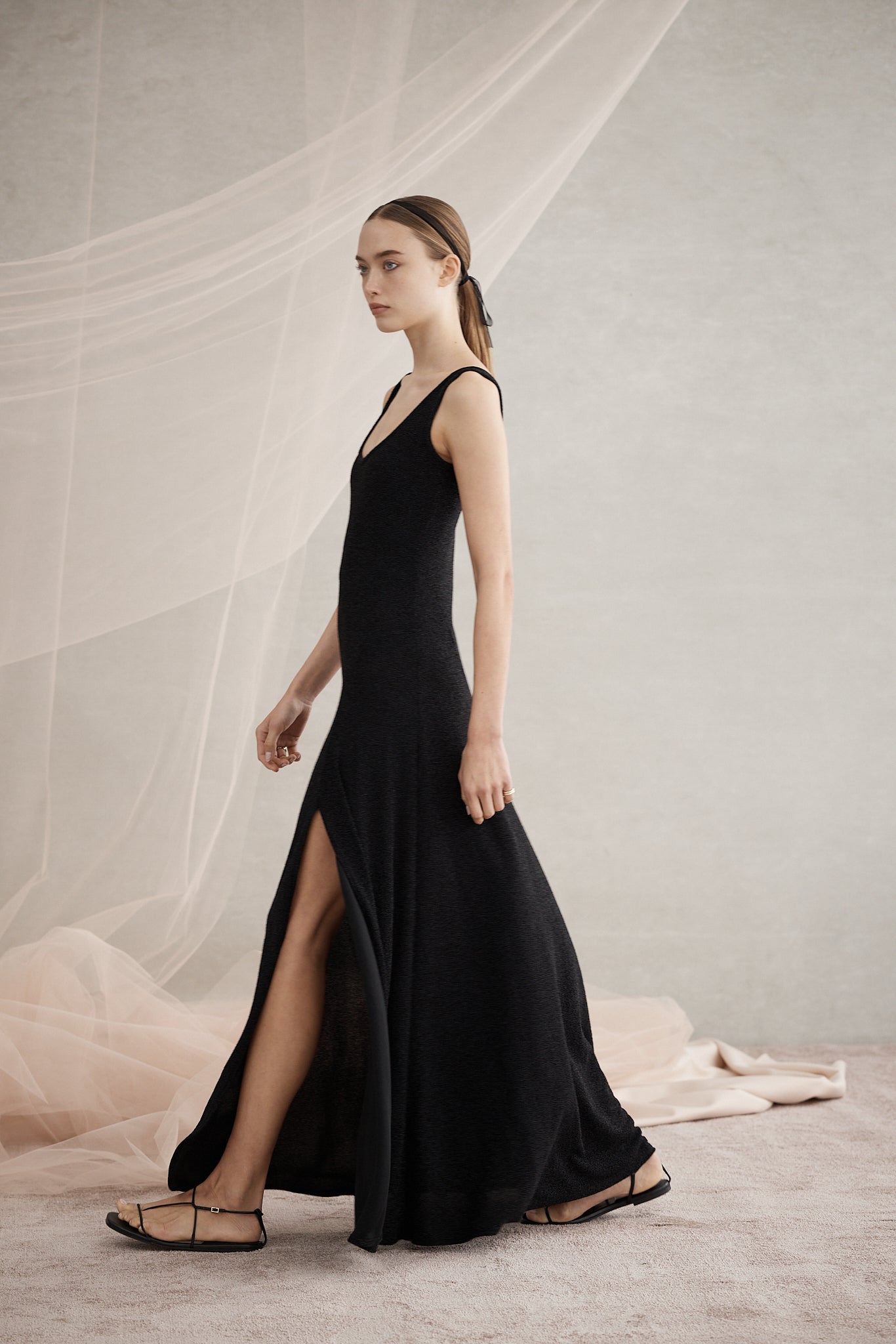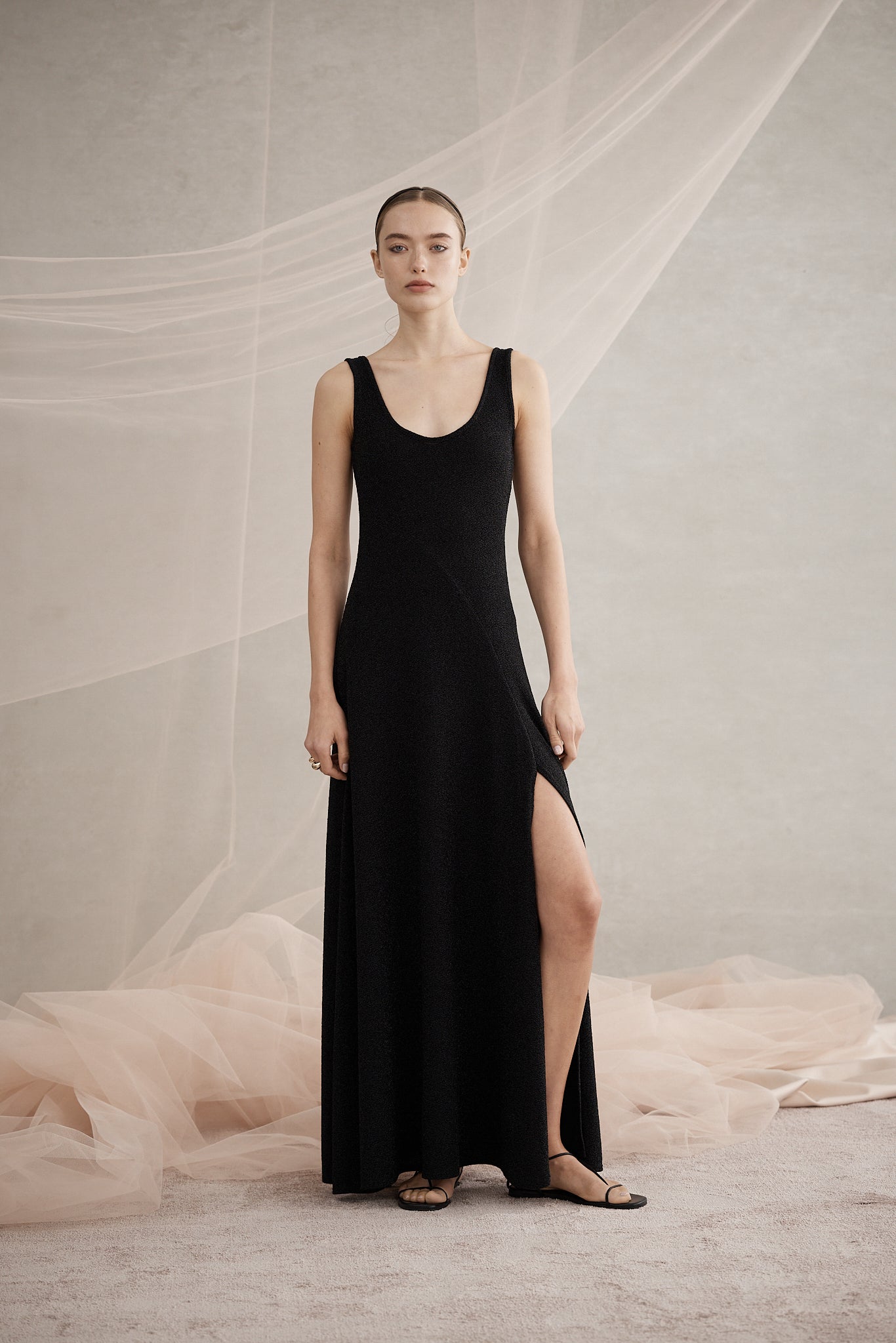 Designed for both glamour and comfort, this sleeveless dress features a gracefull scooped neckline, flattering fluted hem and a subtle front split that adds drama and movement.