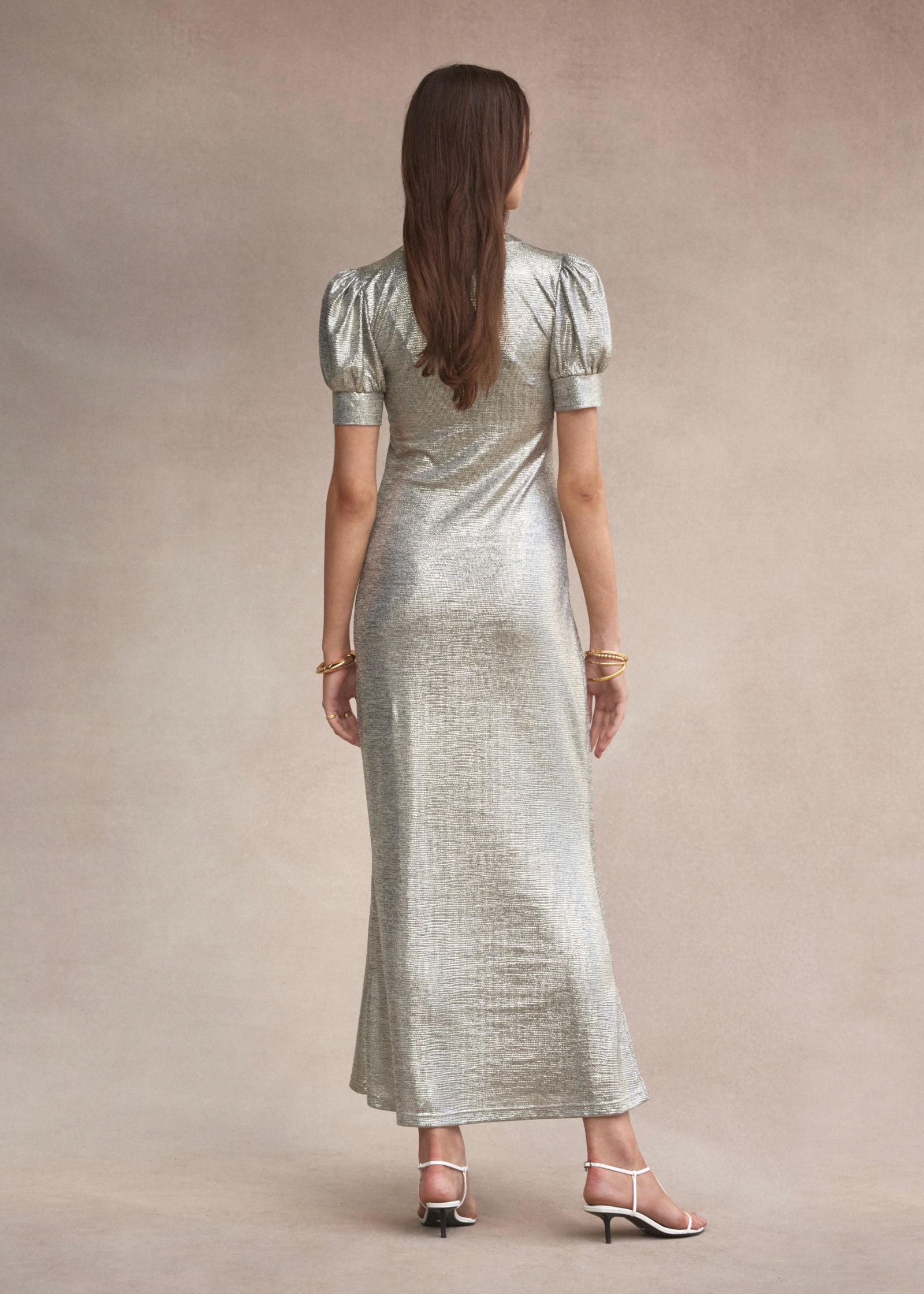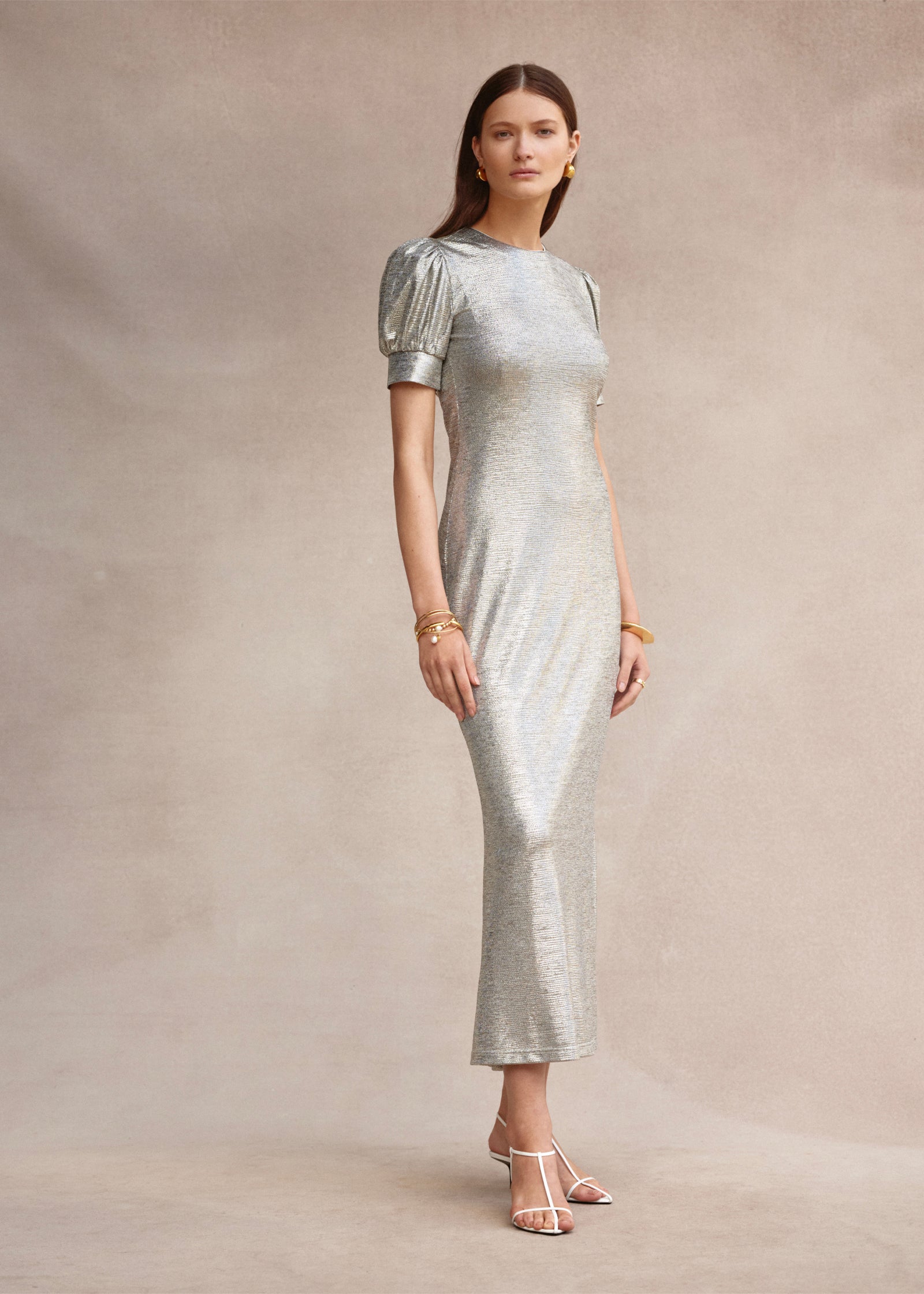 The Como Maxi Dress in Moonlight Silver Shimmer features a high, round neckline with piping detail, puff sleeves and a flared hemline. The dress is shaped through the waist and hip to create a flattering sheath dress that falls to a maxi hem line. Made in stretch metallic fabric that requires little or no ironing or steaming, the Como Maxi Dress is elegant, comfortable and easy to wear.