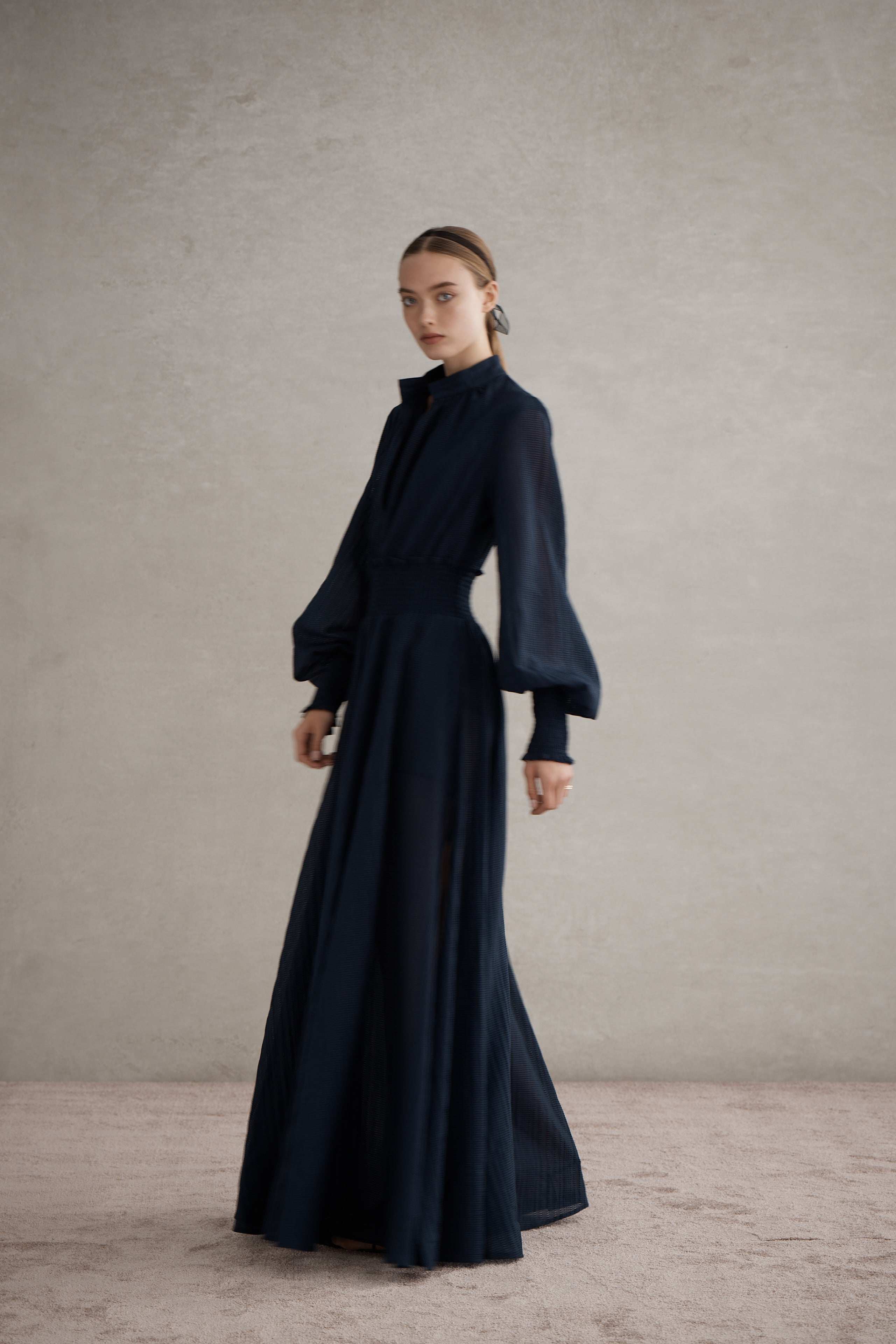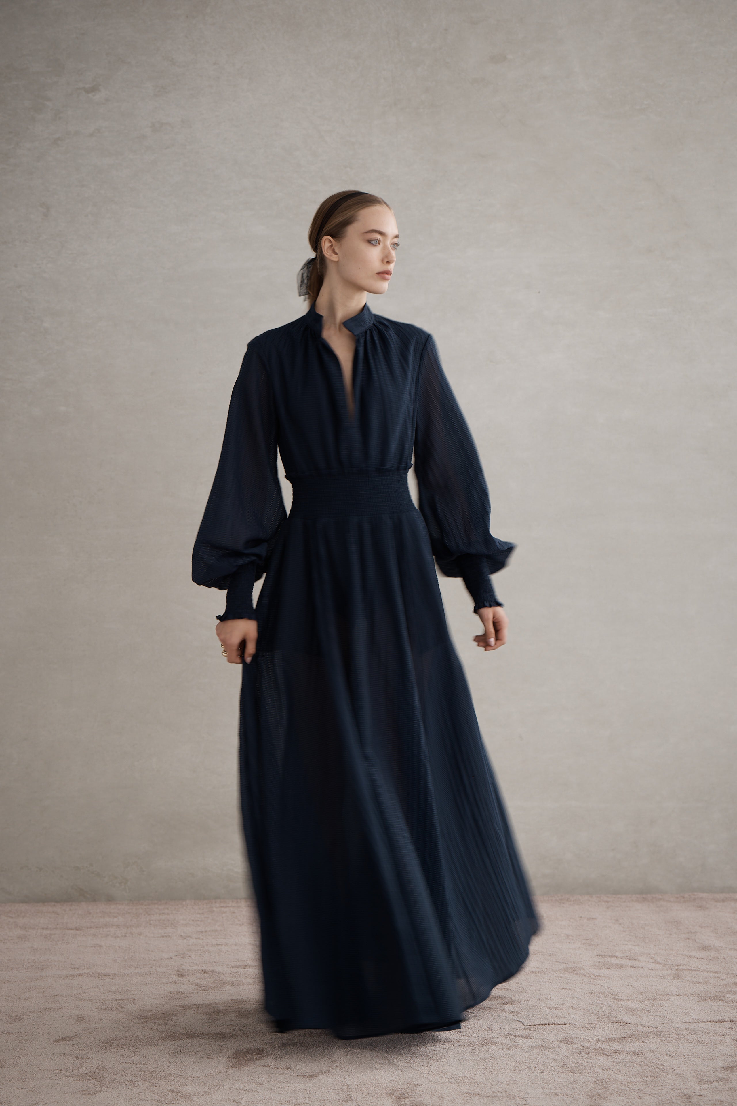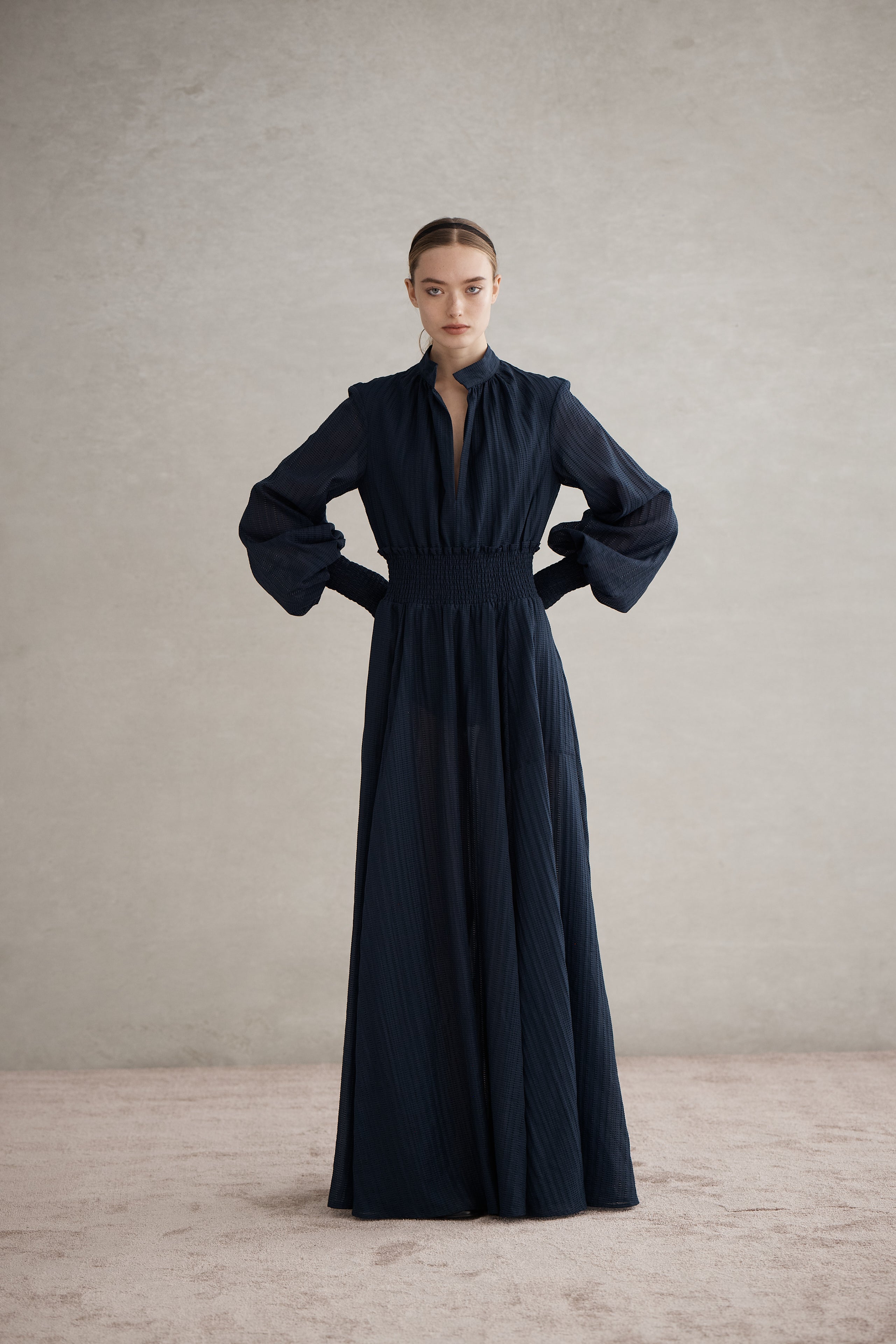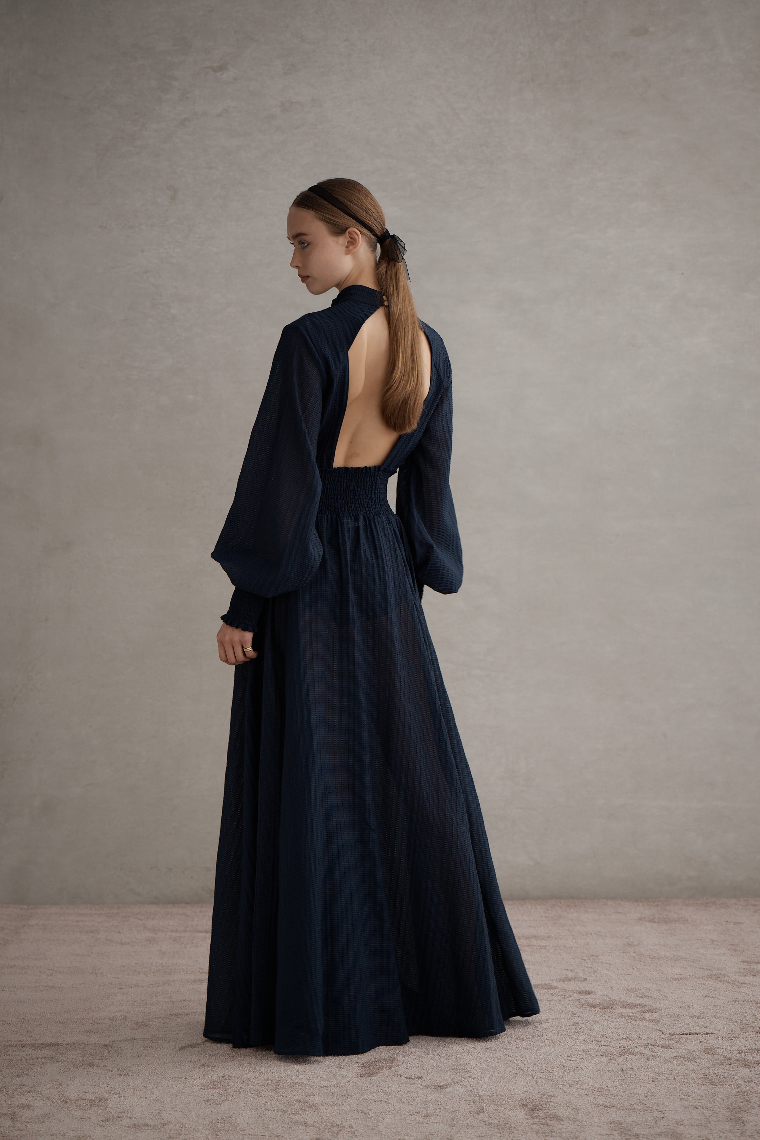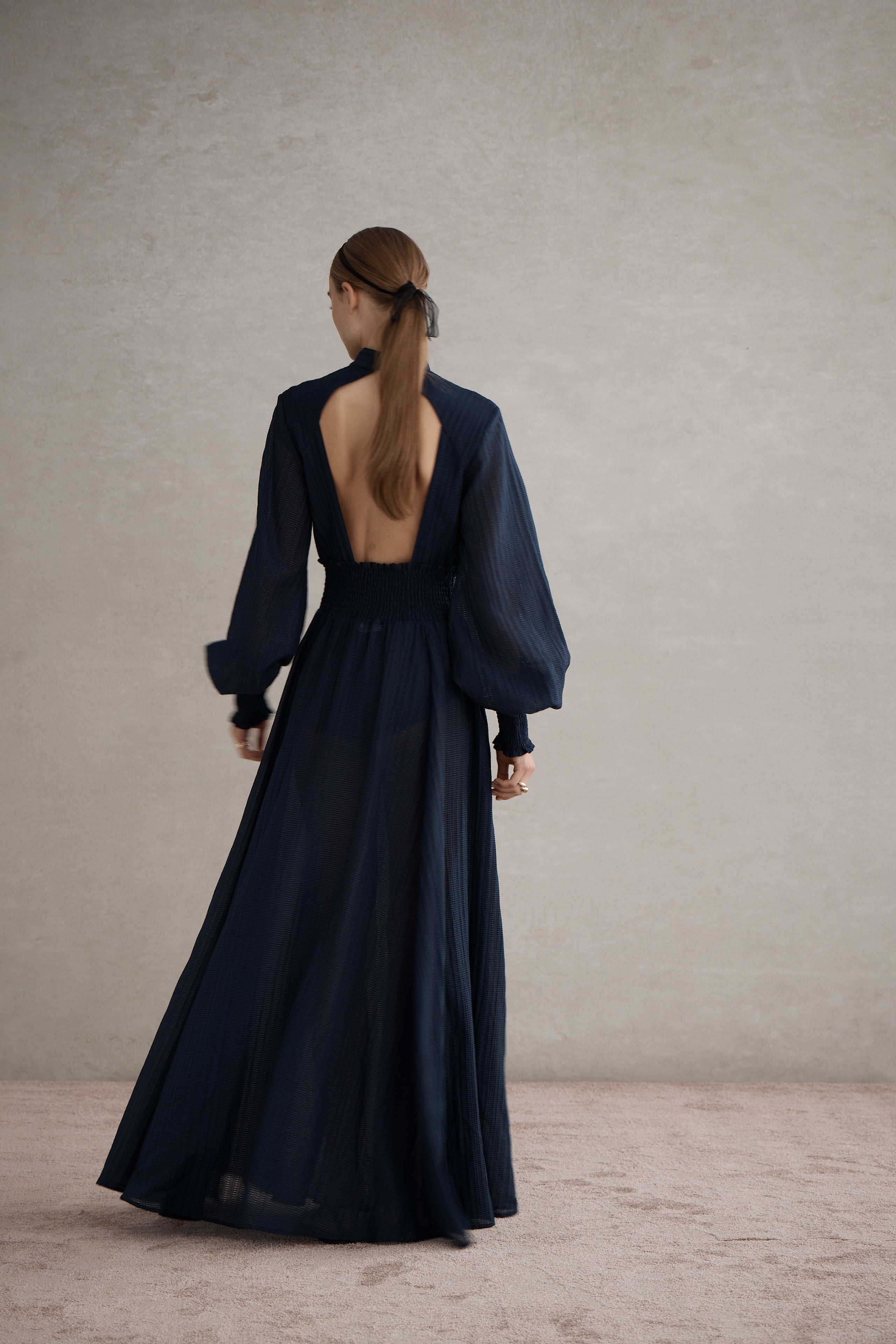 The Horizon Maxi Dress in Sage is made from a fine, wrinkle resistant, hemp fabrication. The dress features elegant balloon sleeves with shirred cuffs and a backless design. The stand-up collar is accented by gold button detailing at the center-back neck.
