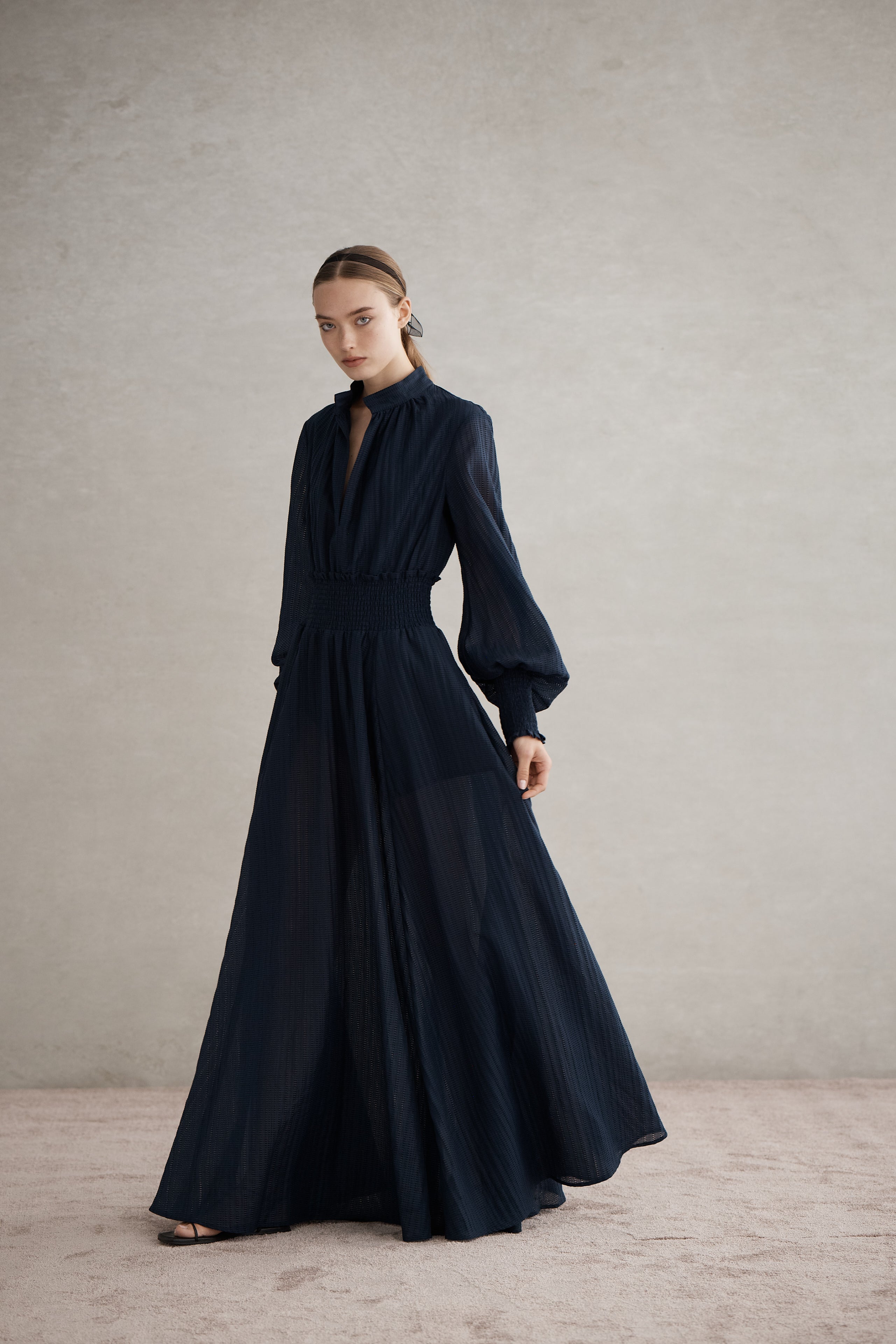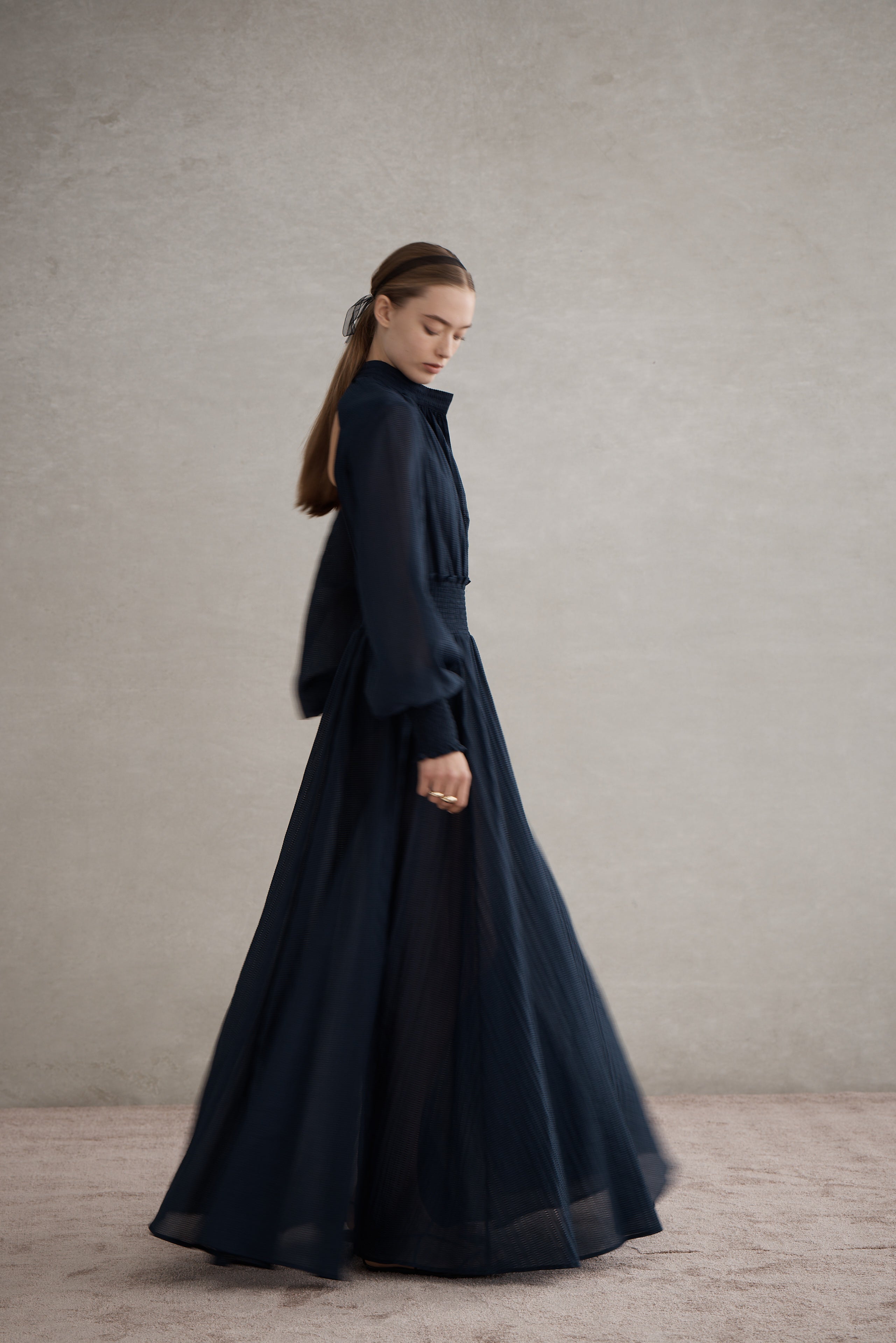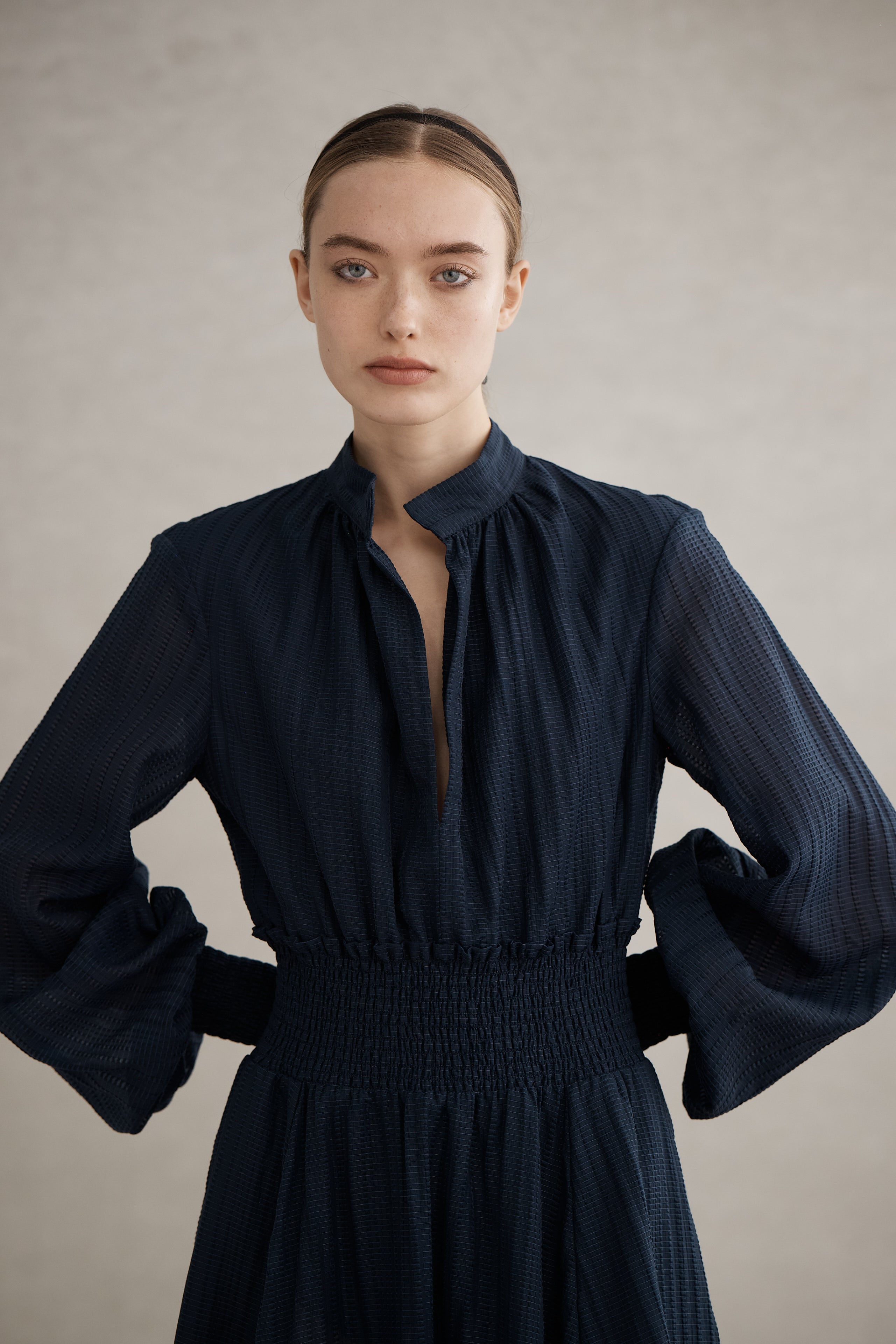 A front placket frames the v-neck front opening. The skirt is gathered onto a shirred waist, enhancing the softness and shape of the luxurious textured fabric.