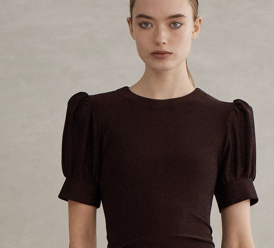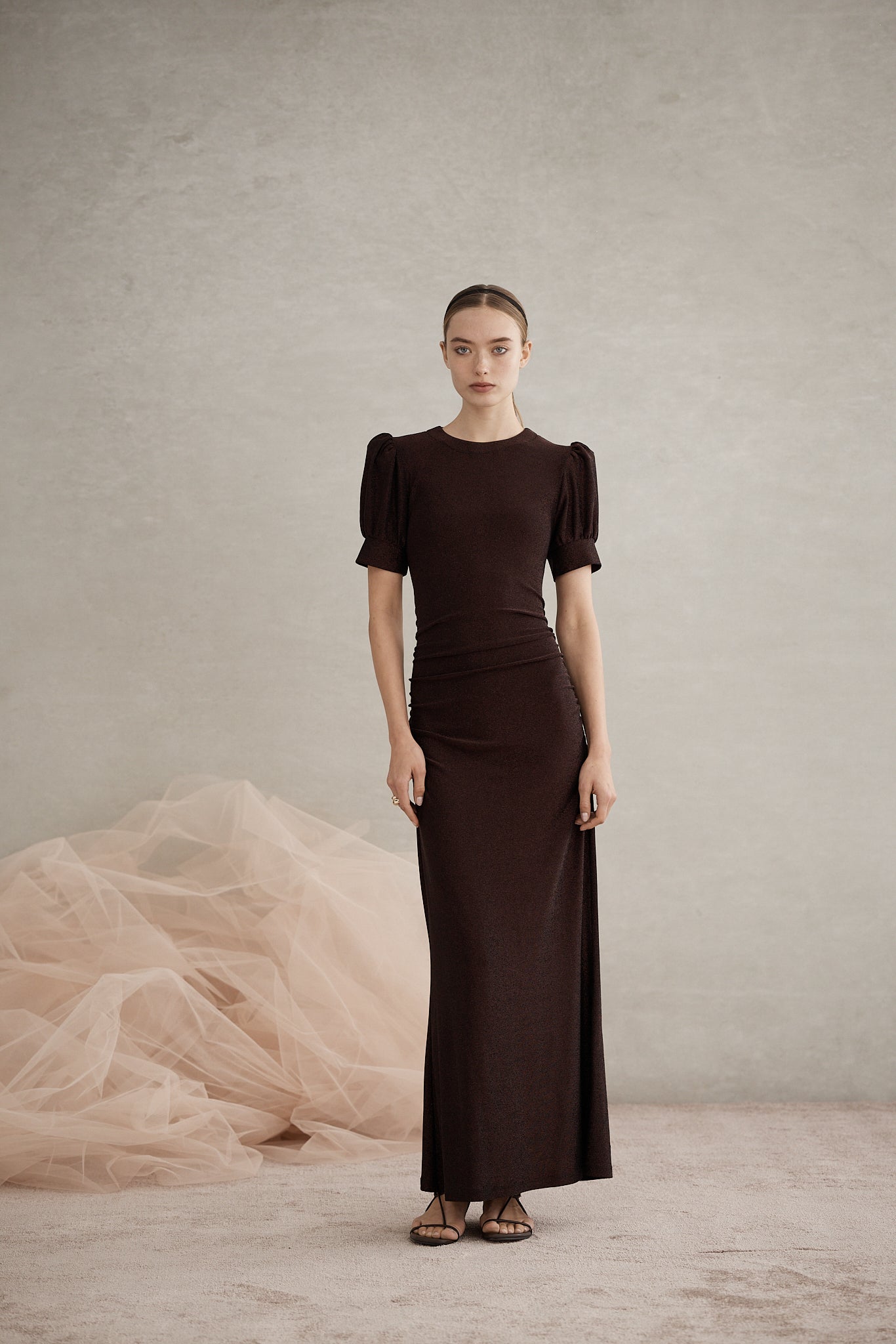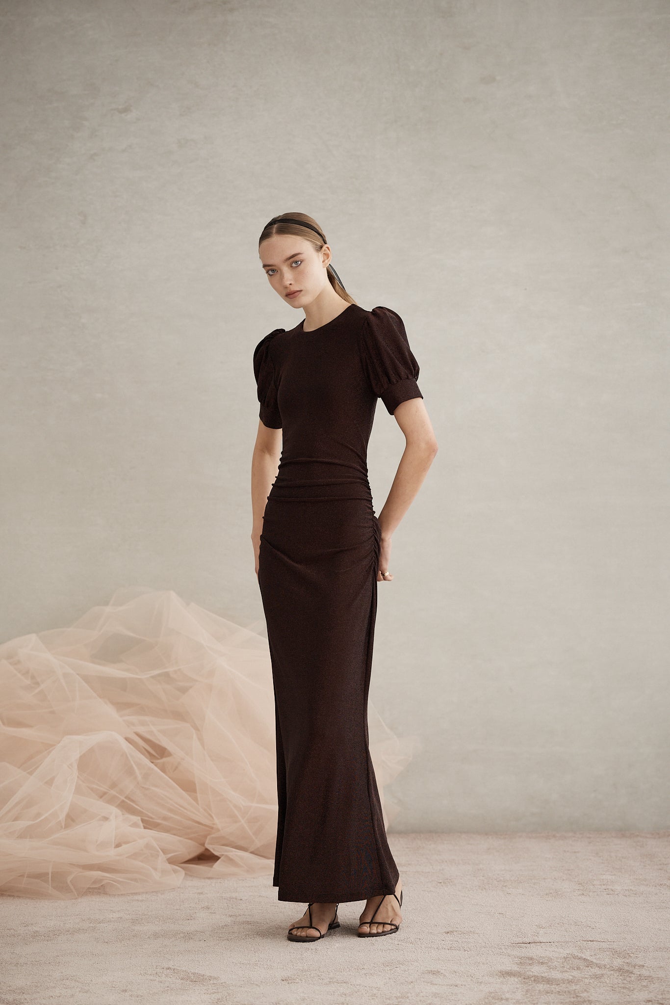 Our Ruched Como Maxi Dress made in Espresso Fine Metallic Knit is designed to flatter the body where ruching detail smooth and contour the body, offering gentle shaping and ease. Puff sleeves with shoulder pad support bring a touch of volume, while a round neckline finished with contrast piping and gold buttons deliver elegant detailing.
