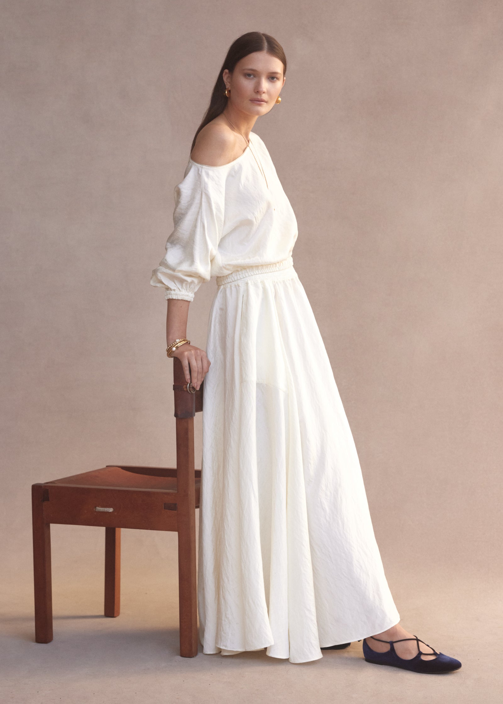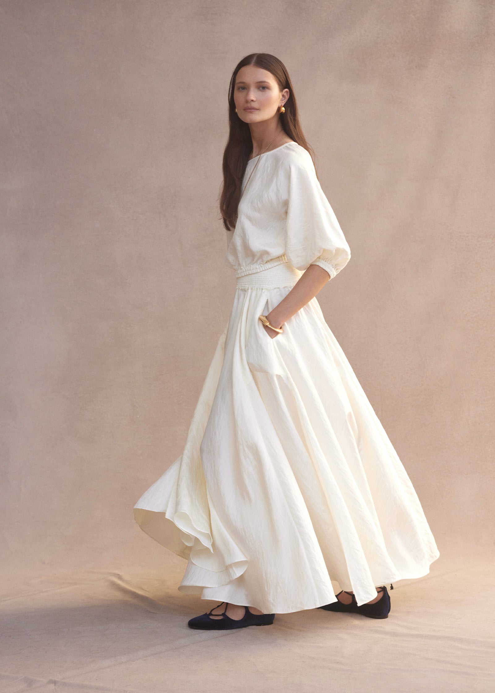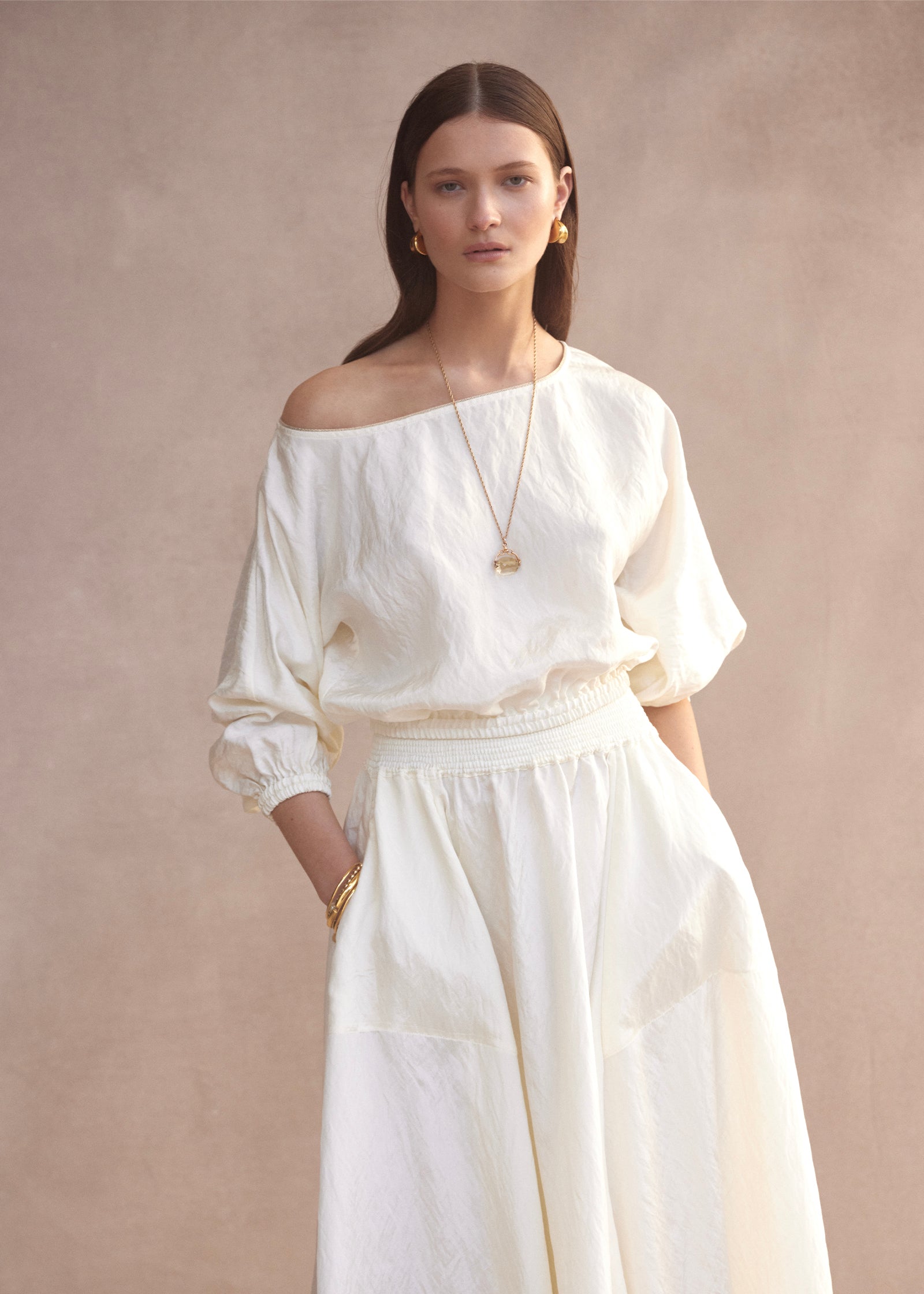 The Boat Neck Top in Ivory features an elegant boat neckline designed to sit on or off the shoulder and 3/4 balloon sleeves with gathered cuffs. The elasticated waistline is designed to cinch the waist to give a blouse-like feel. Gold piping detail at the neckline and gold buttons on the elasticated cuff provides a slight shimmer for day or night.