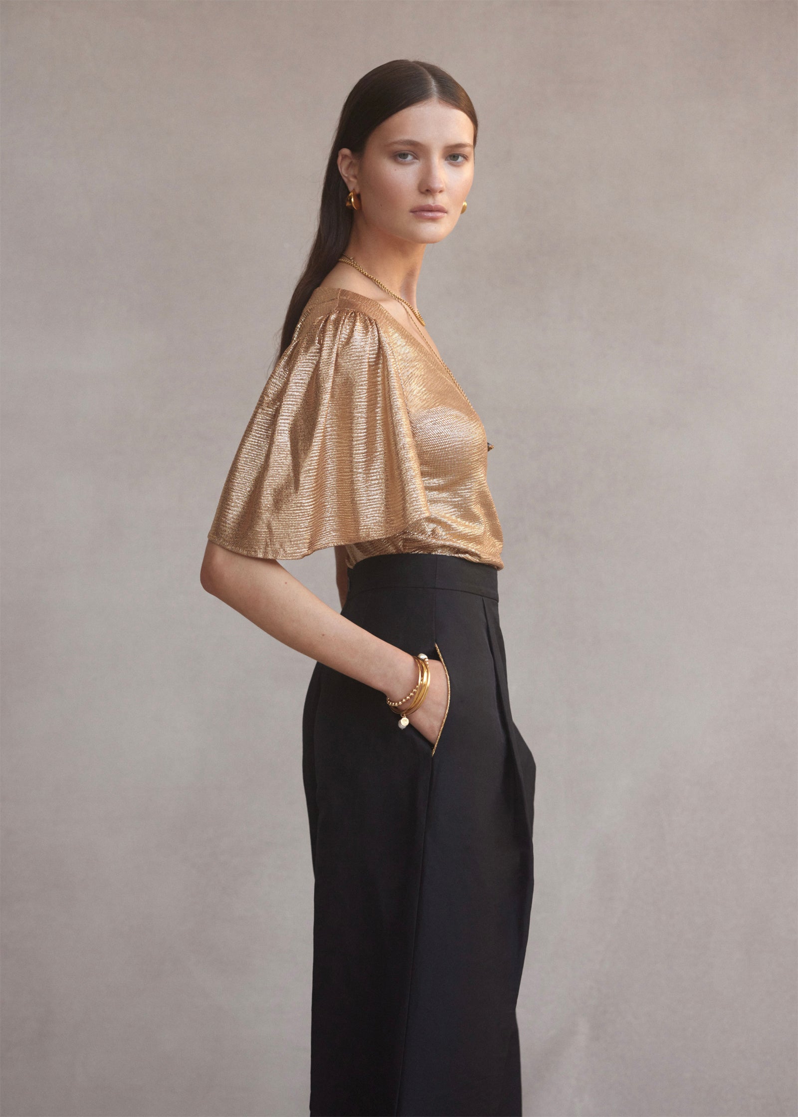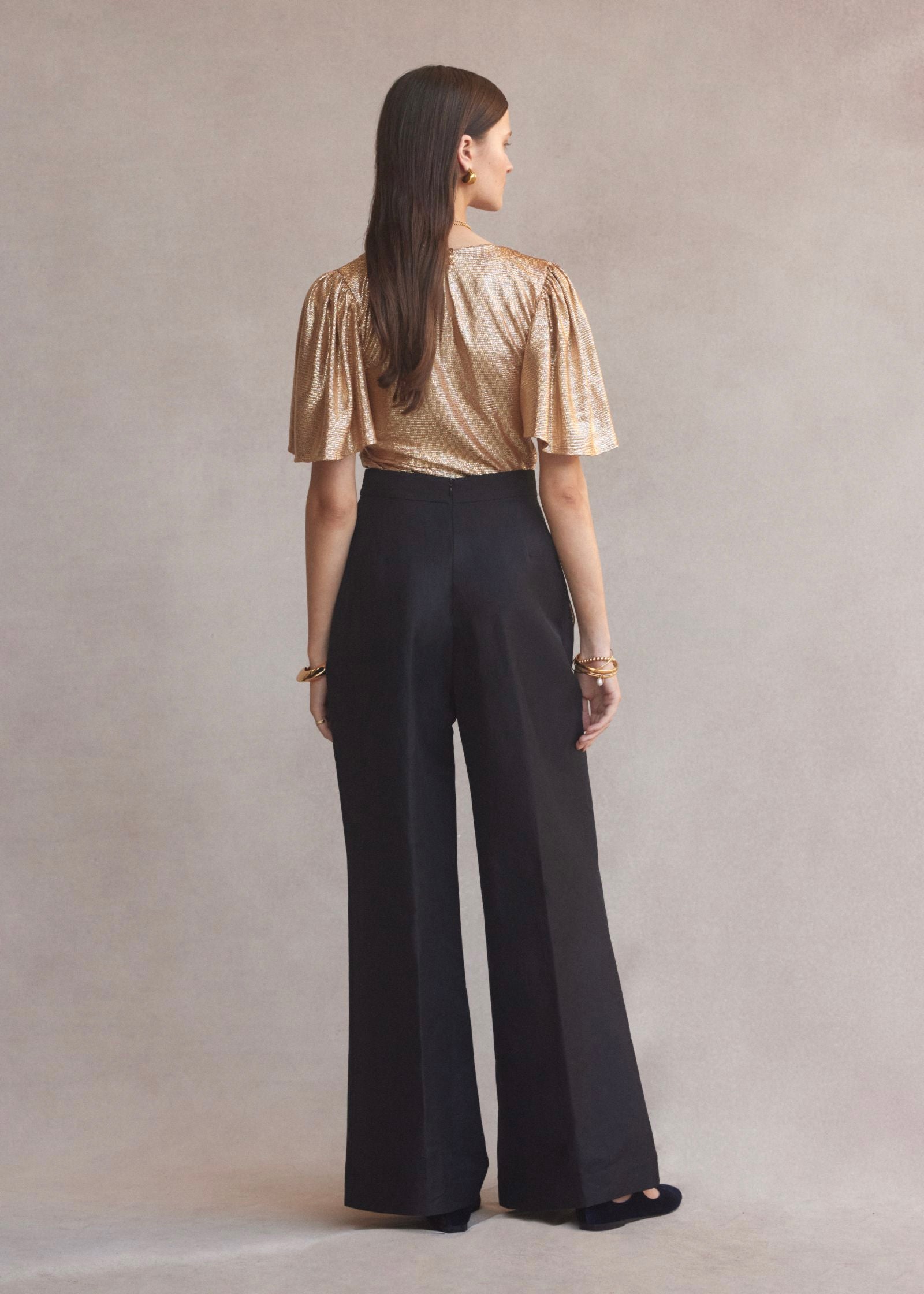 The Farfalla V-neck Top in Gold Metallic features a deep v-neckline and fluted sleeves. Made in stretch metallic fabric that requires no ironing, the Farfalla top is comfortable and flattering on most body shapes.