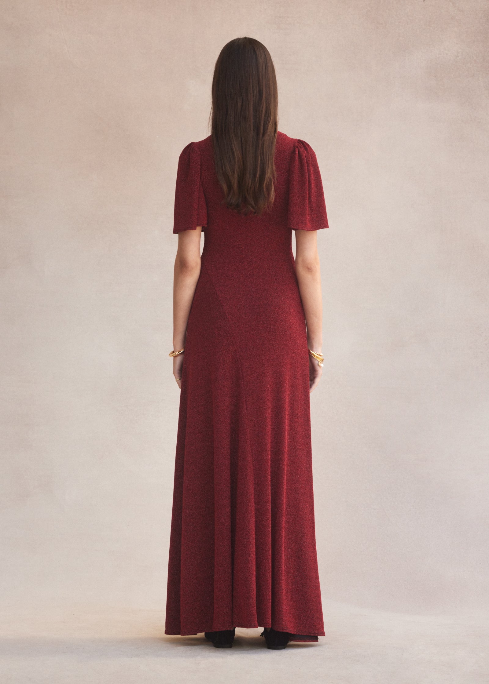 V-neck Fluted Como Maxi Dress | Red Lamè