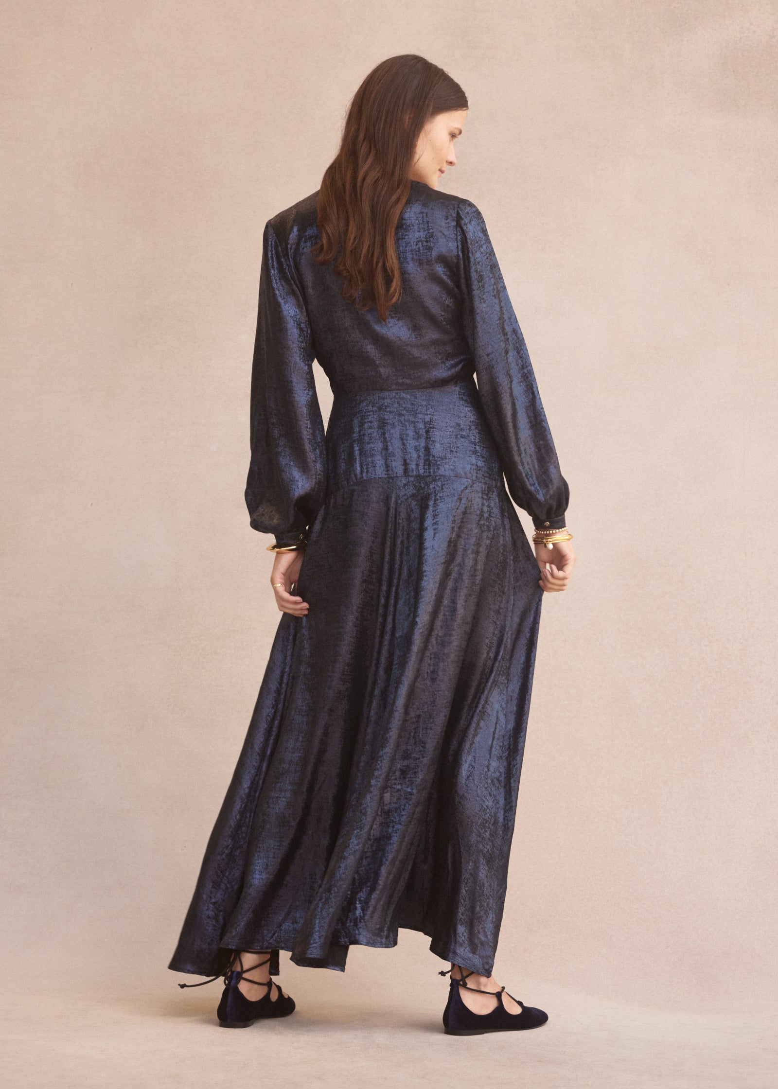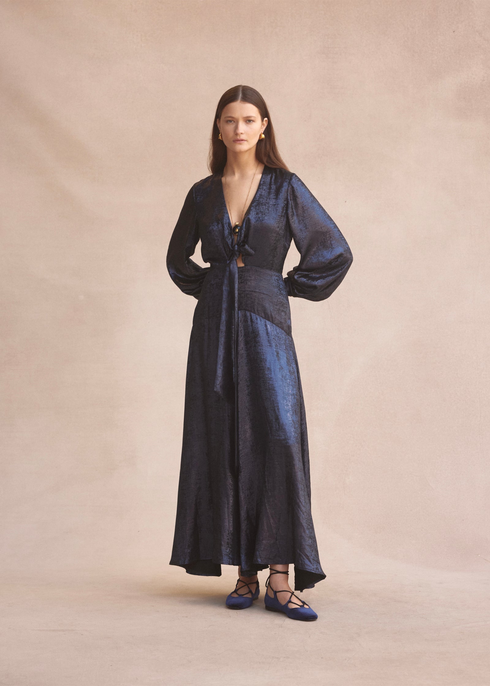 The Fontana Maxi Dress in Gold Supernova features a V-neckline with front tie, long balloon sleeves with elastic cuff with gold button detailing. The dress is a relaxed fit through the bodice with a full maxi skirt that falls from a fitted panel across the hip with side zip. Made in soft, stretch metallic tulle, the fabrication features a tiny gold sequin pattern that gives a subtle shimmer. Ultra-light, soft and semi sheer, this dress is relaxed and elegant.