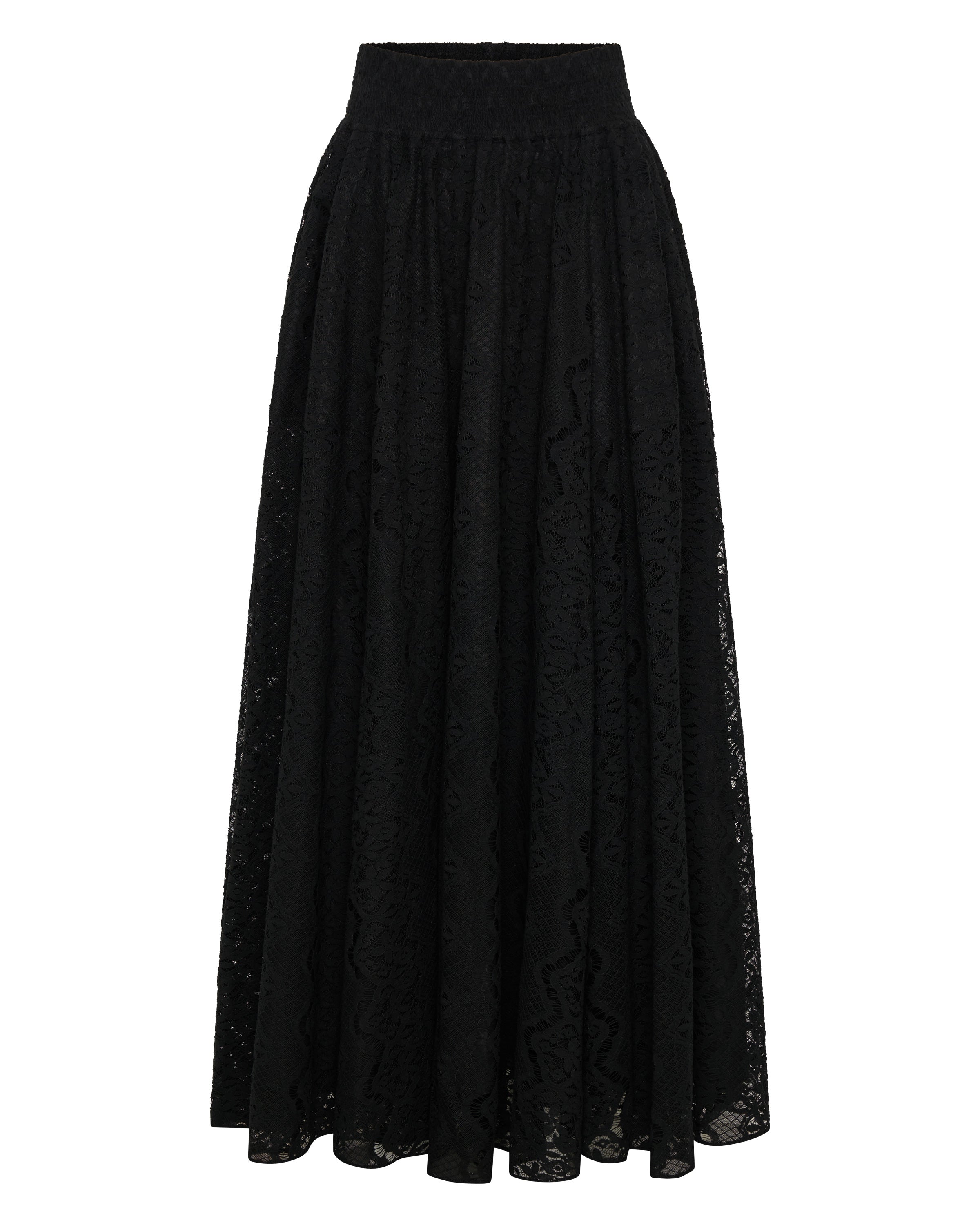 The Oleander Lace Maxi Skirt is made in a light, boho inspired cotton lace with luxurious silk cotton lining. This statement maxi skirt is lightly gathered onto an elastic waist band designed to fit firmly on the waist or hips. The skirt also features side splits and pockets with gold metallic detailng.