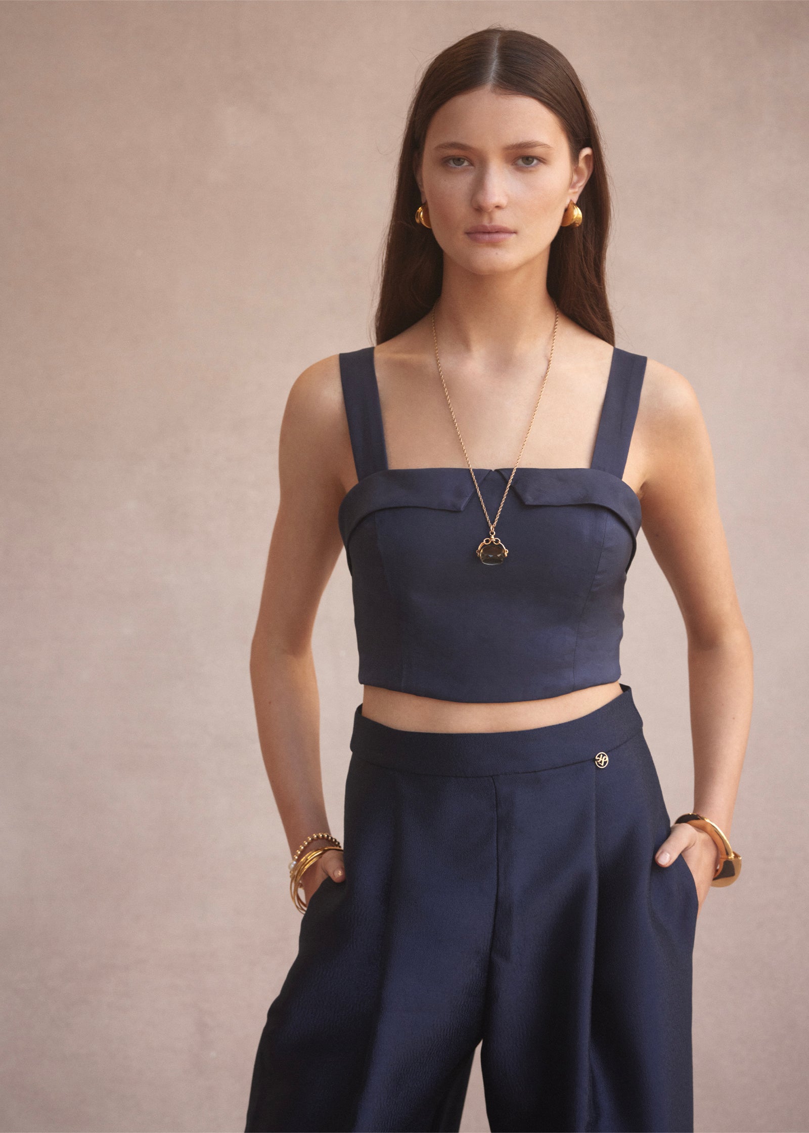 e The Riviera Pant in Navy are our high waisted, wide leg pant featuring front pleats, centre back zipper and gold metallic detailing. Made in a luxurious satin back crepe, these pants have a soft sheen and a smooth, silk-satin feel on the inside. Two pleats at centre front drape from the waist and fall to a flattering wide leg. Side pockets feature gold piping detail.