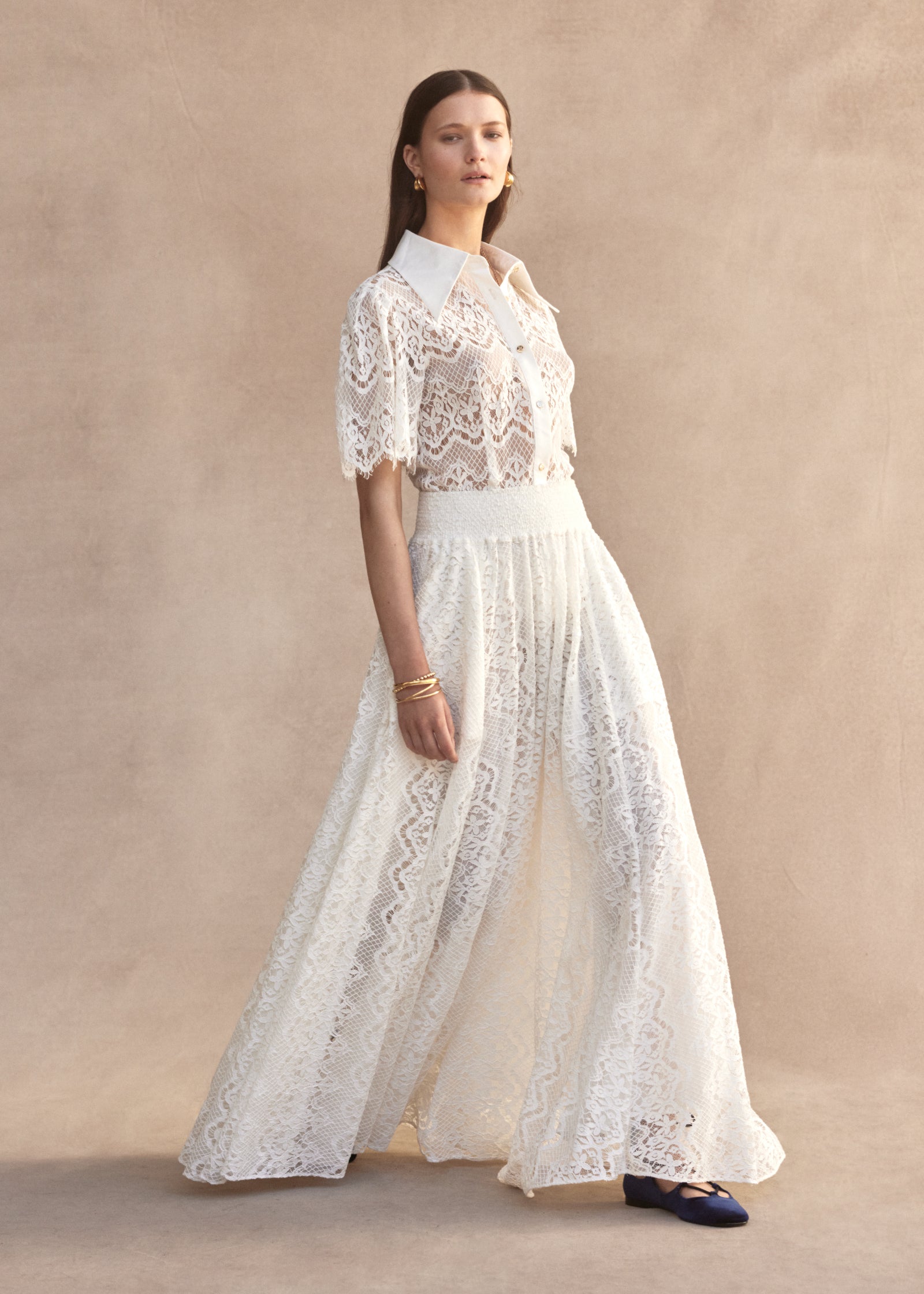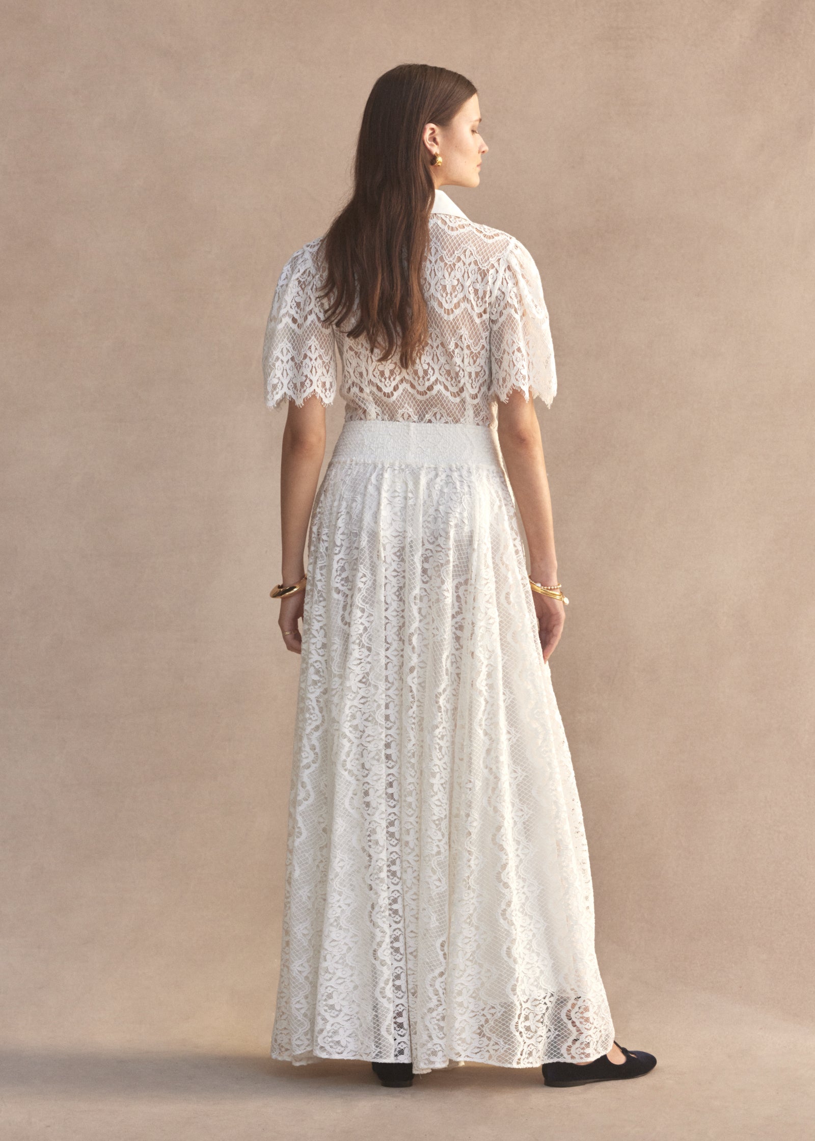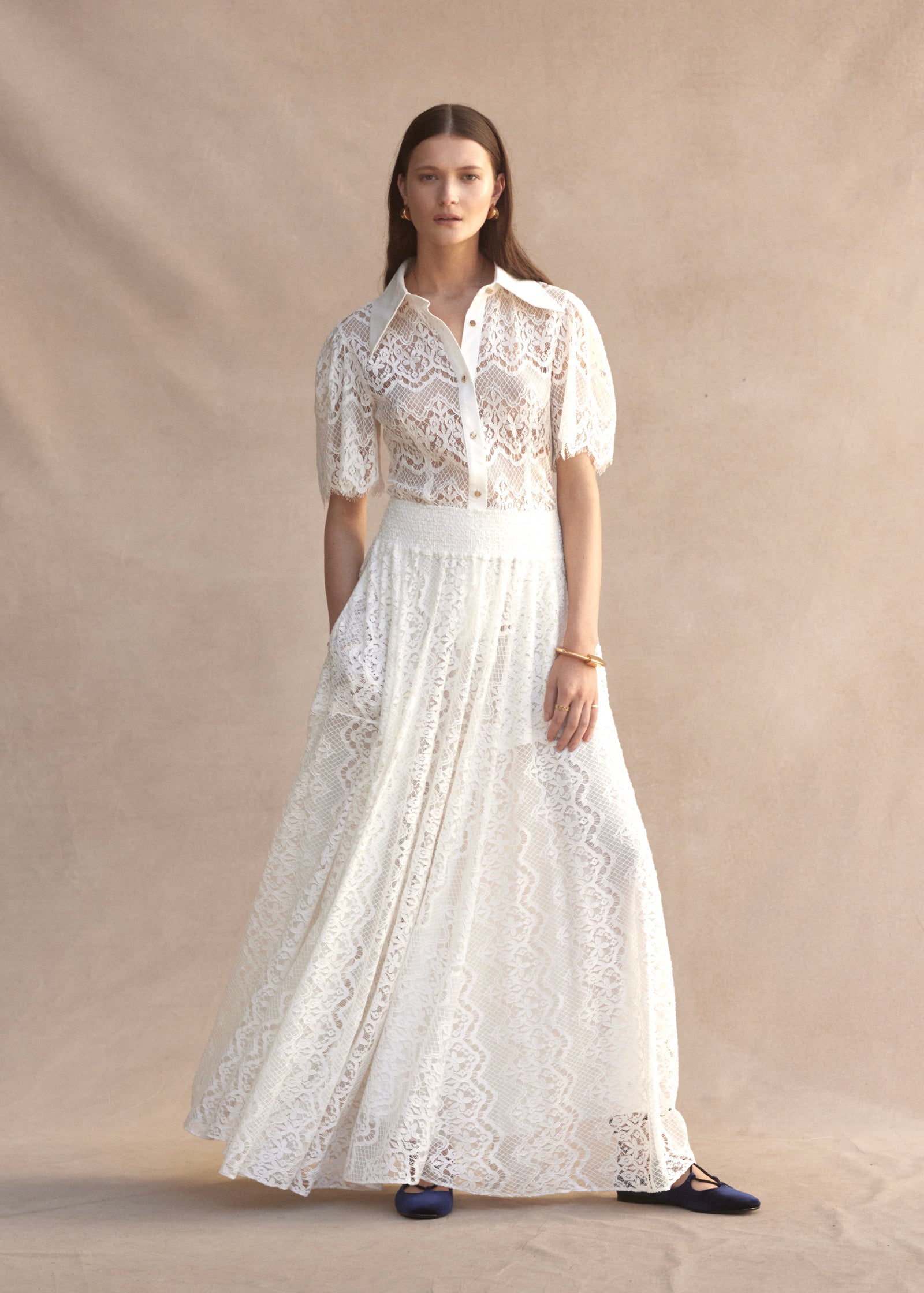 The Sophia Lace Shirt is designed to be worn tucked in or tied in a knot at the waist. It features dramatic short sleeves with scalloped hemline, gold button detailing and contrast taffeta collar and front placket. The light weight cotton lace fabrication is easy care, easy wear and easy iron. This is a statement shirt with a classic personality.