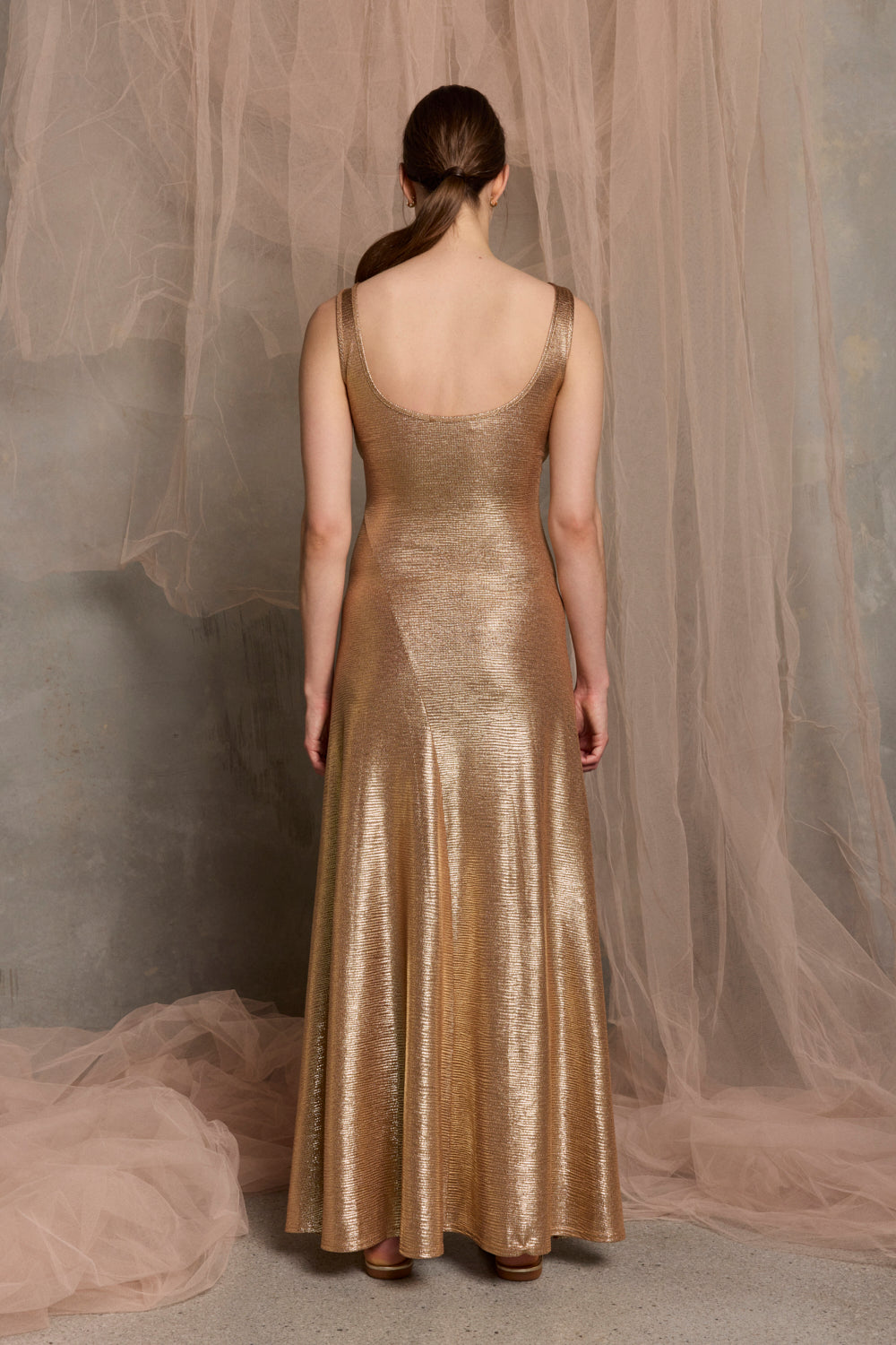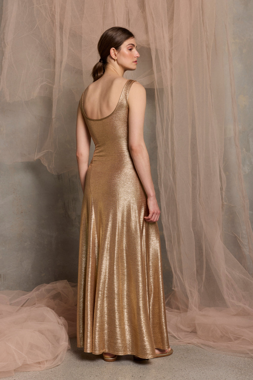Bella Fluted Como Maxi Dress | Cartier Gold Stretch Metallic
