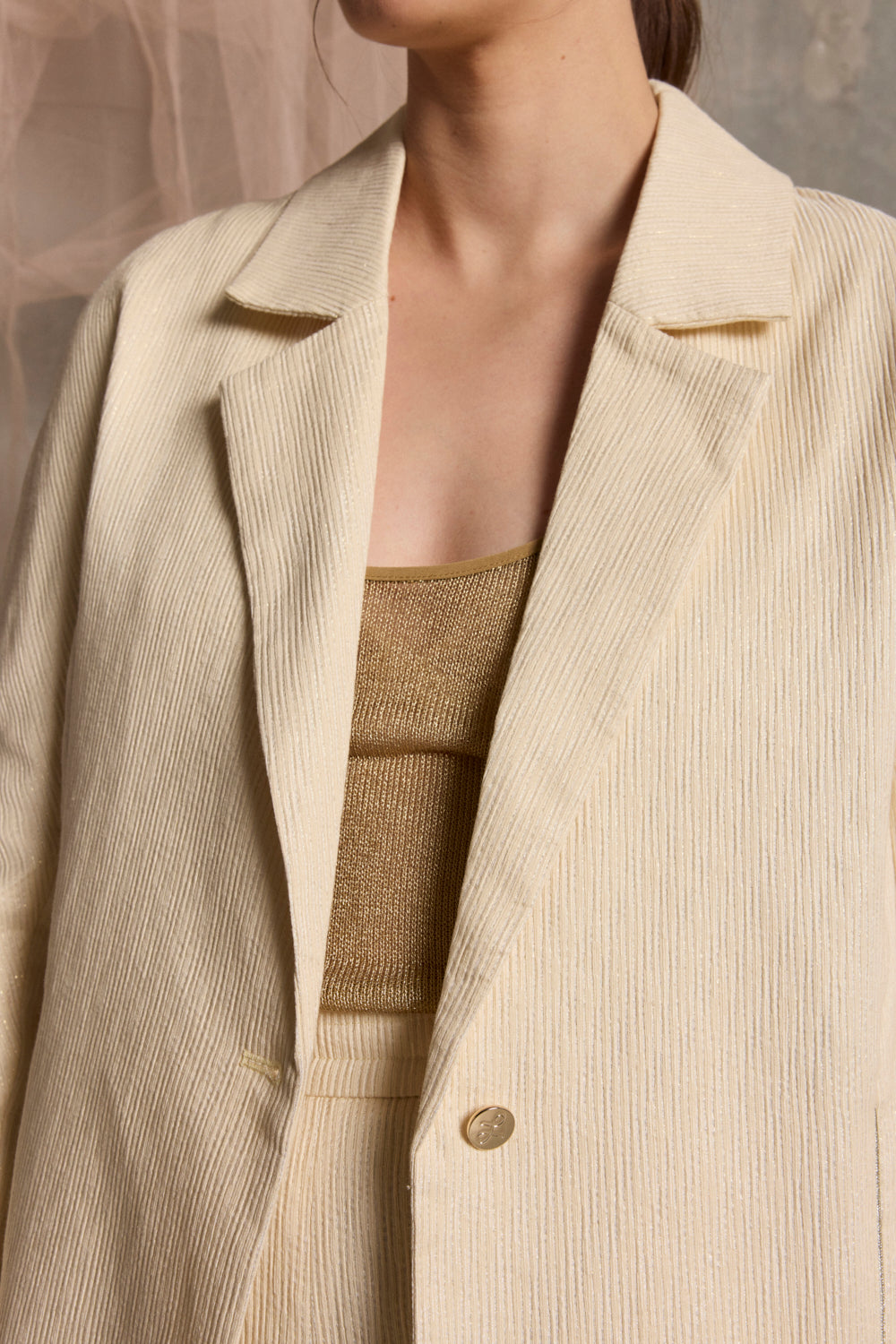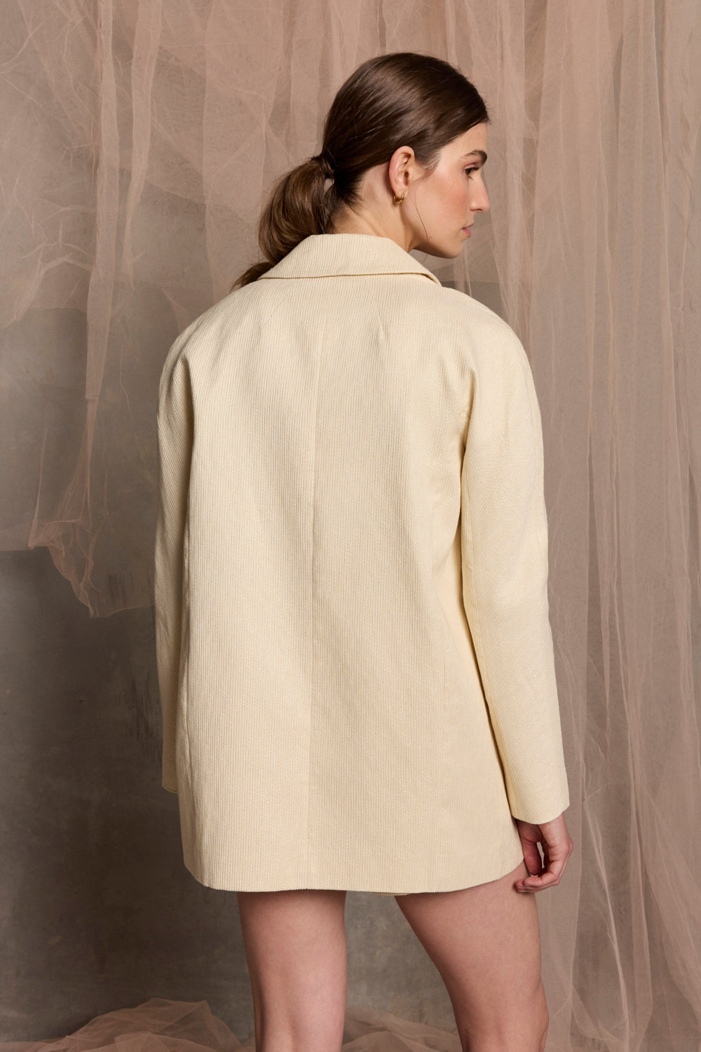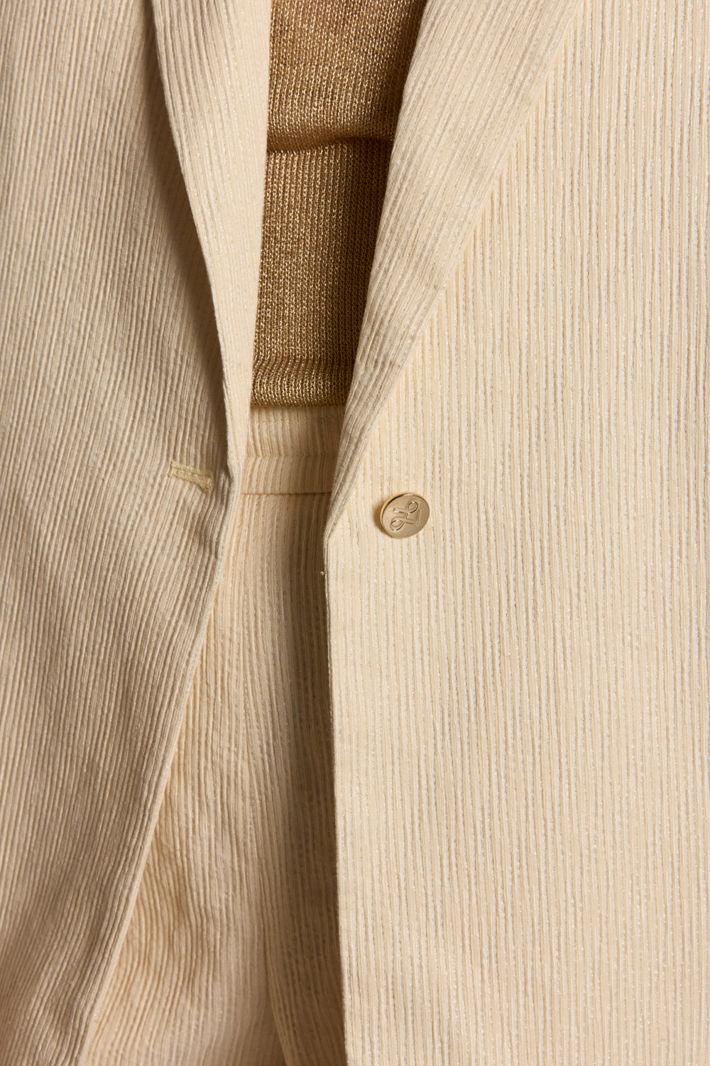 The Camilla Silk Cord Blazer in Vanilla Gold is a long-line, relaxed blazer tailored from a luxurious silk metallic cord fabric. The single-breasted design offers a long silhouette featuring tailored paneling, slim notch lapels, side pockets and gold button detailing.