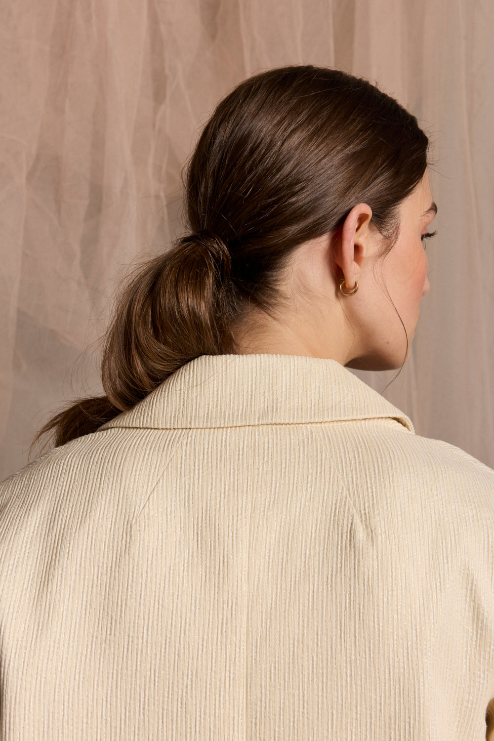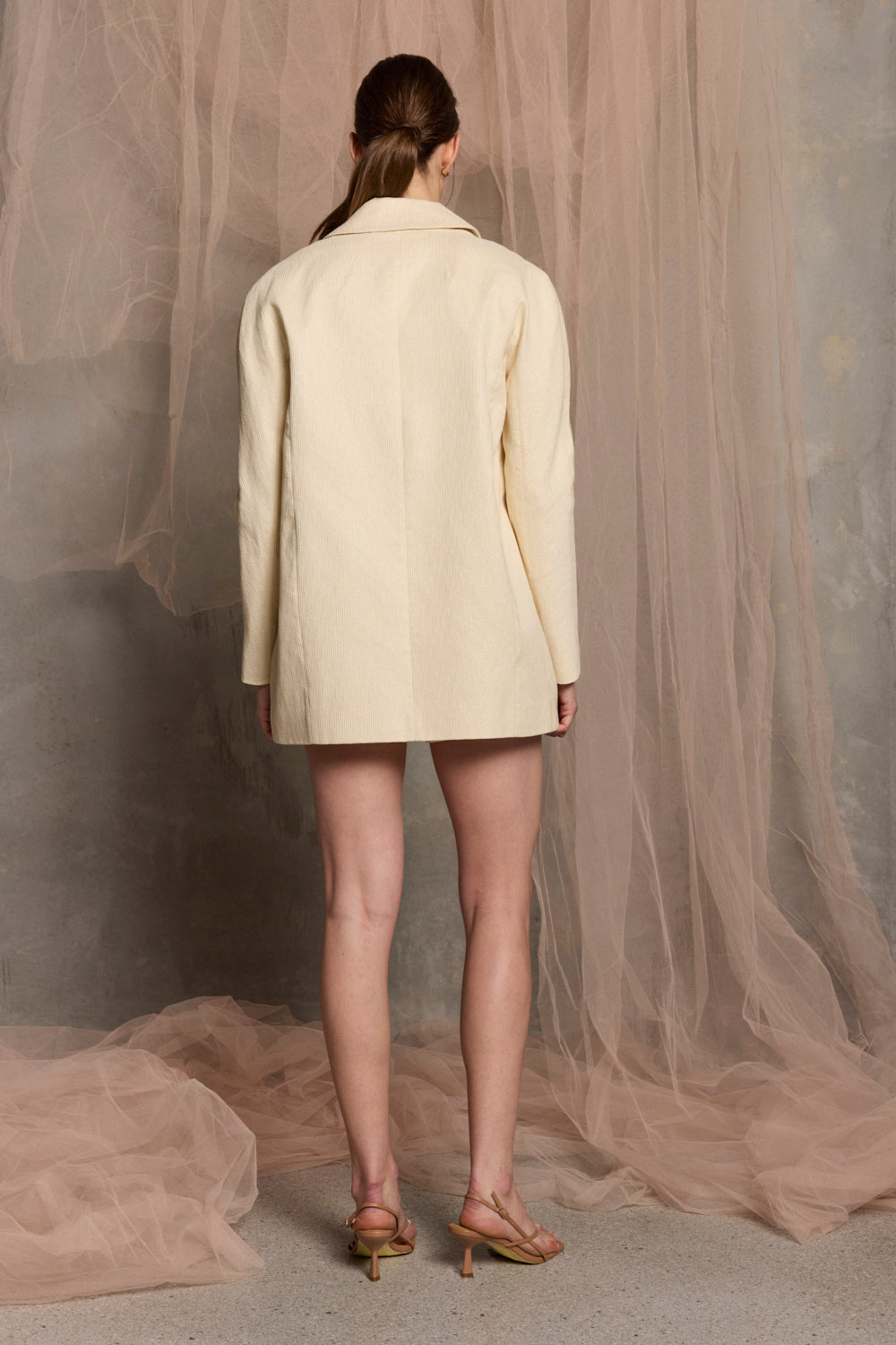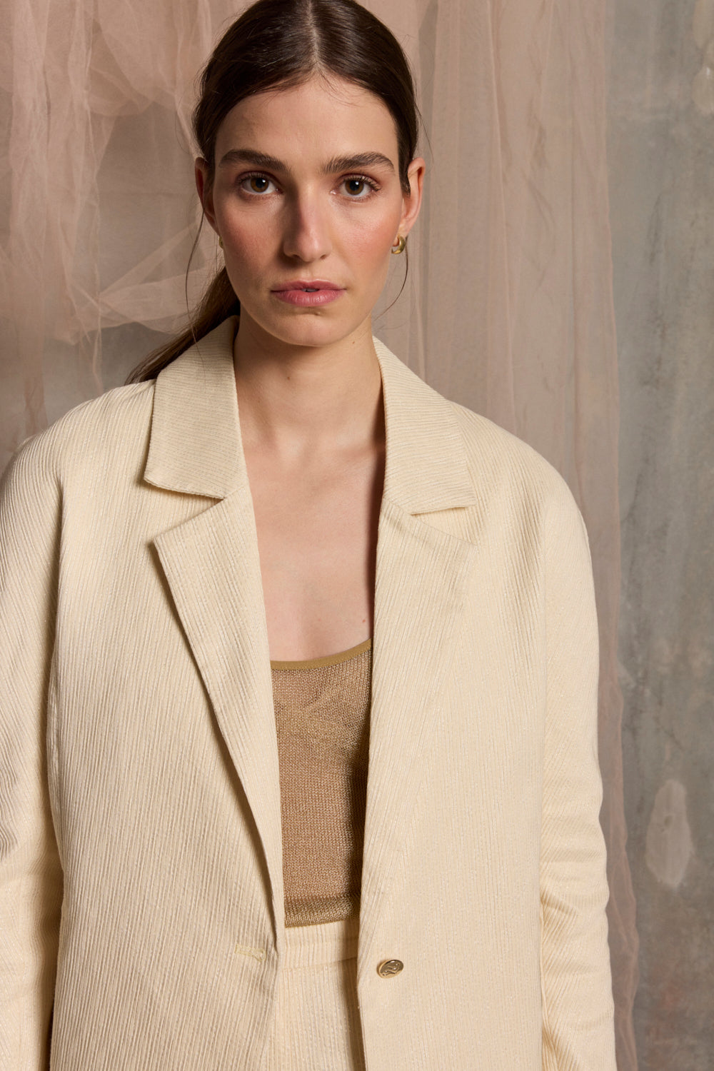 The Camilla Silk Cord Blazer in Vanilla Gold is a long-line, relaxed blazer tailored from a luxurious silk metallic cord fabric. The single-breasted design offers a long silhouette featuring tailored paneling, slim notch lapels, side pockets and gold button detailing.