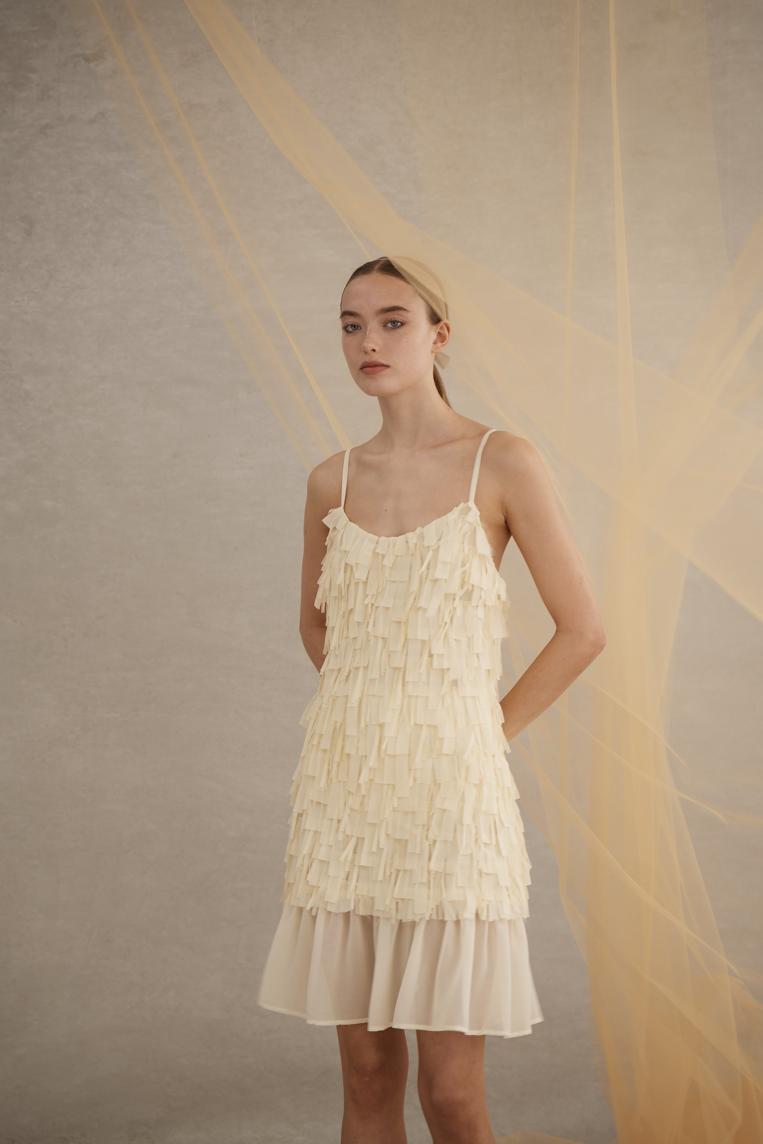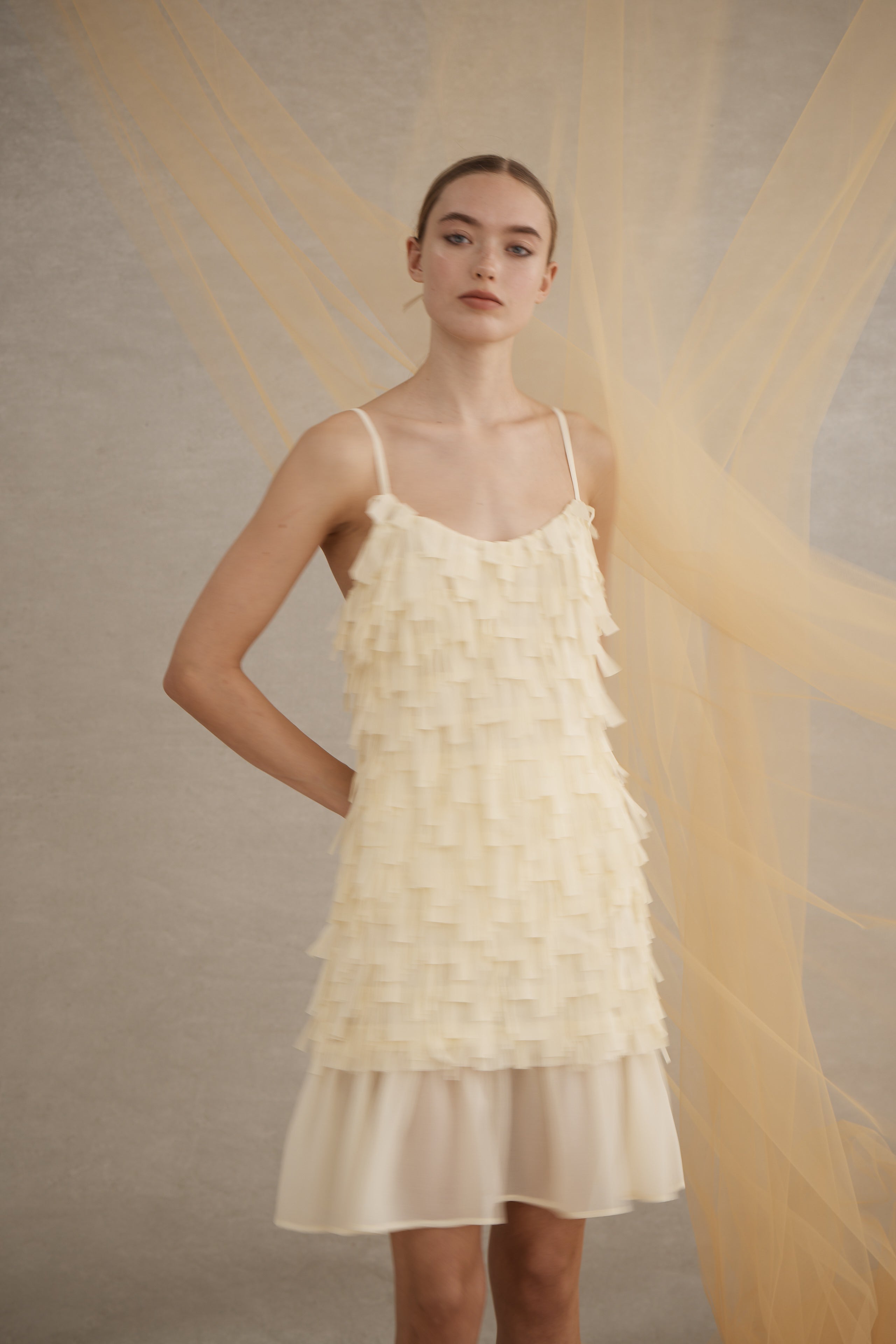 The Heartbreak Mini Dress in Butter Cream is crafted from sheer chiffon with stretch tulle and features a drop-waist and adjustable spaghetti straps.