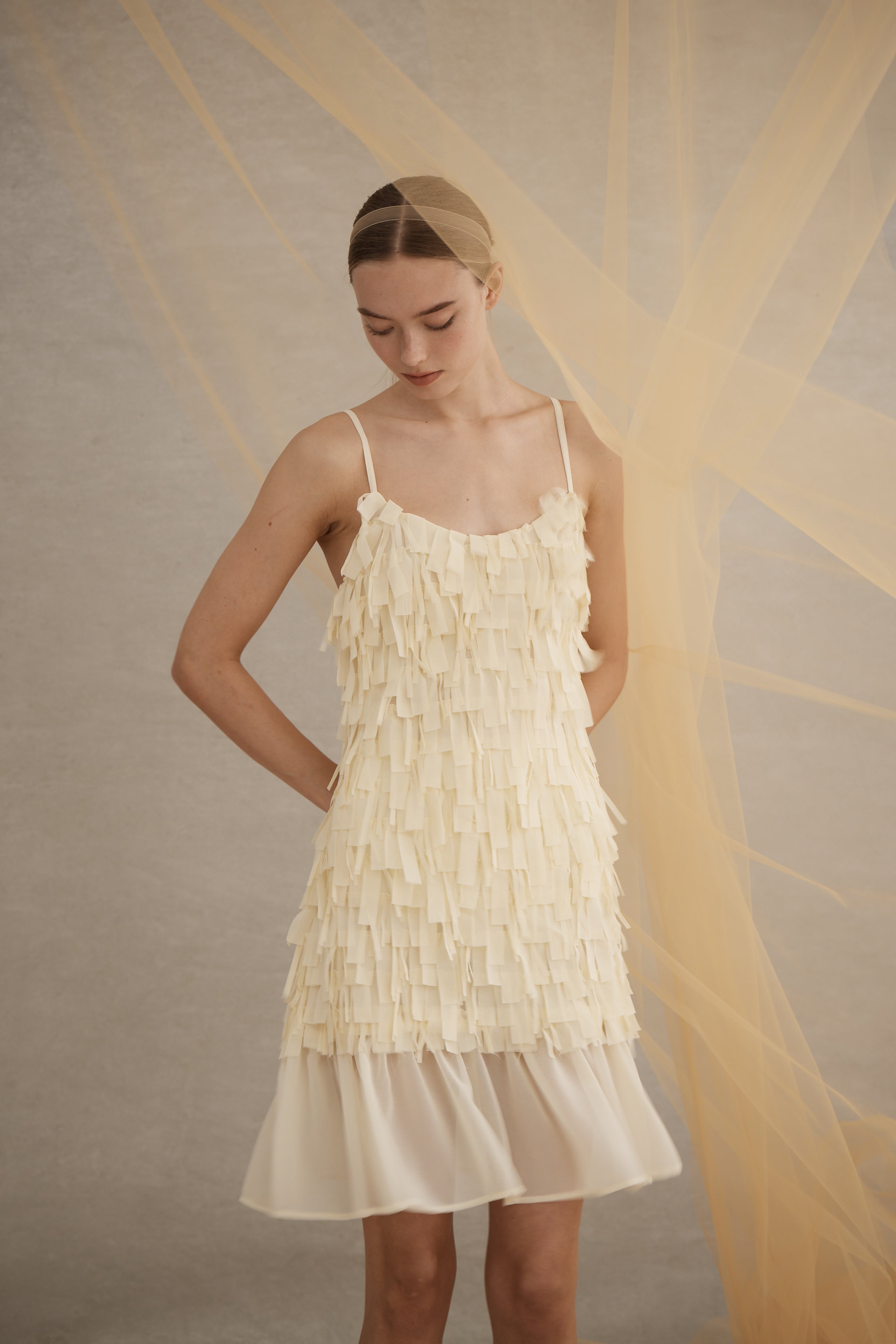 The lightweight, sheer chiffon fabric creates a soft, floaty hemline while decorative, laser cut embroidery strips stitched into the bodice sway and flutter as you move.