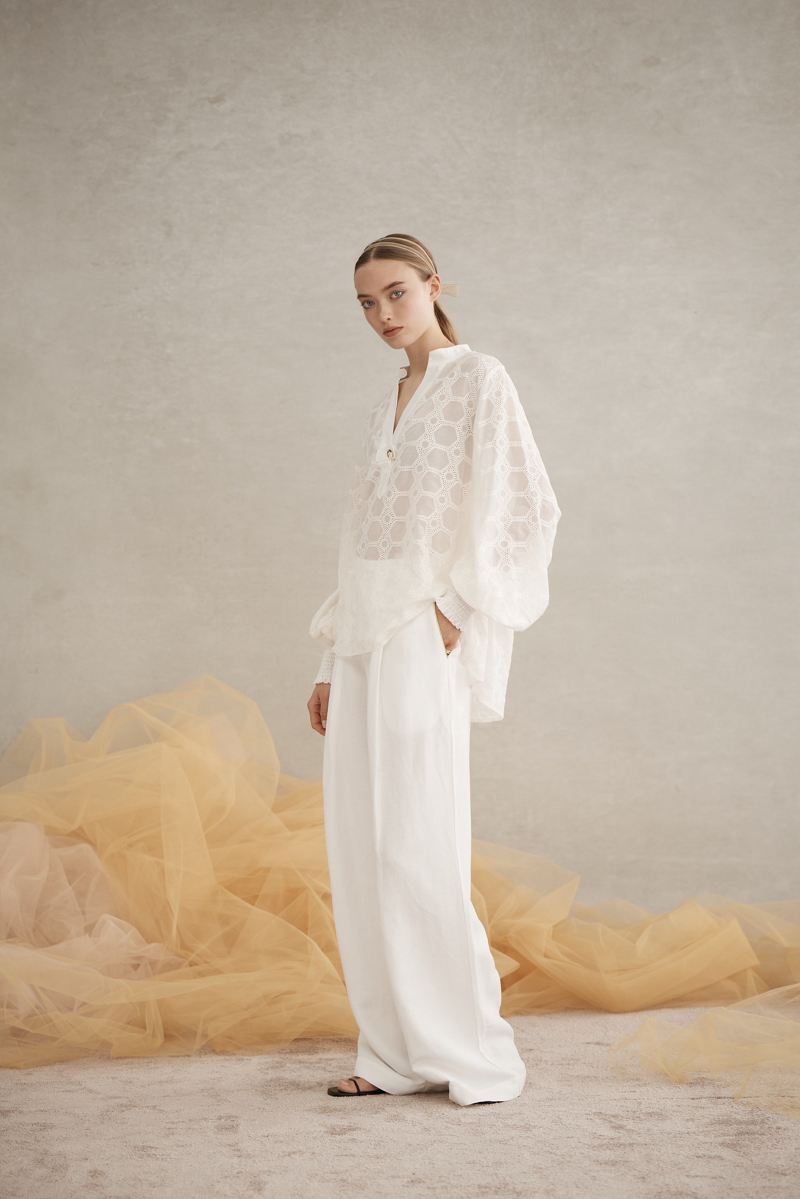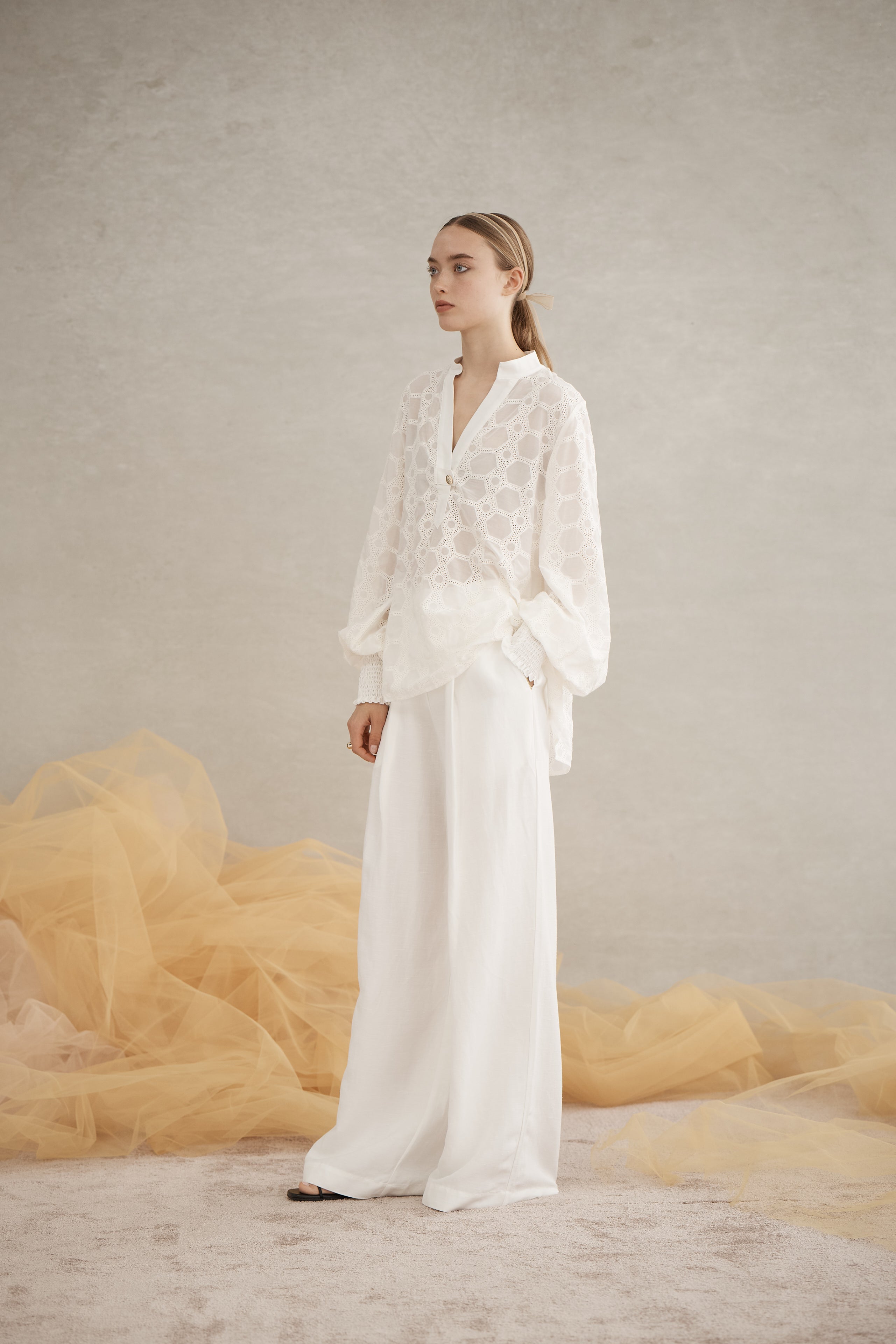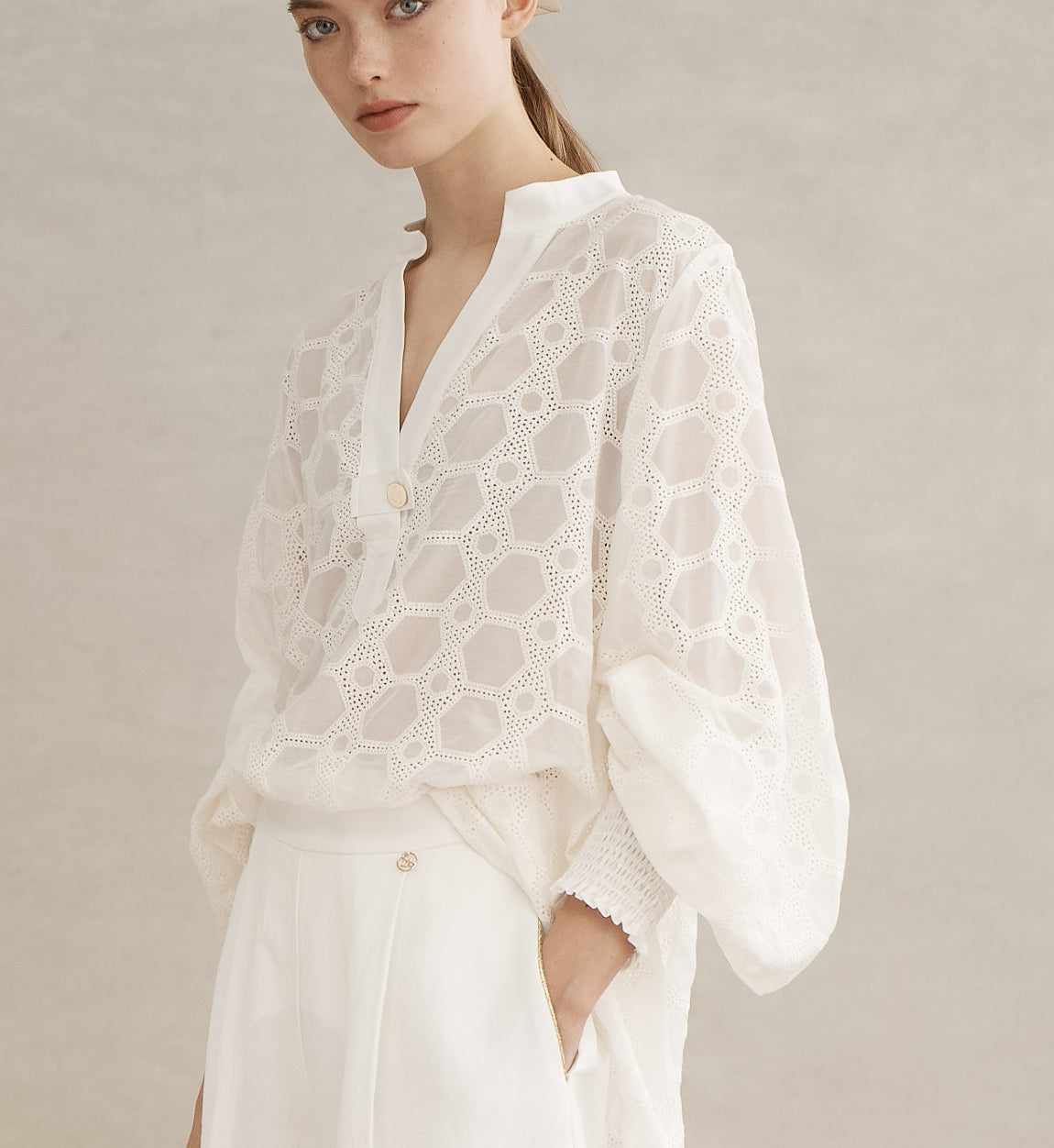 Crafted from luxurious silk cotton, the Rea Shirred Cuff Blouse features refined white embroidery that enhances its elegant design.