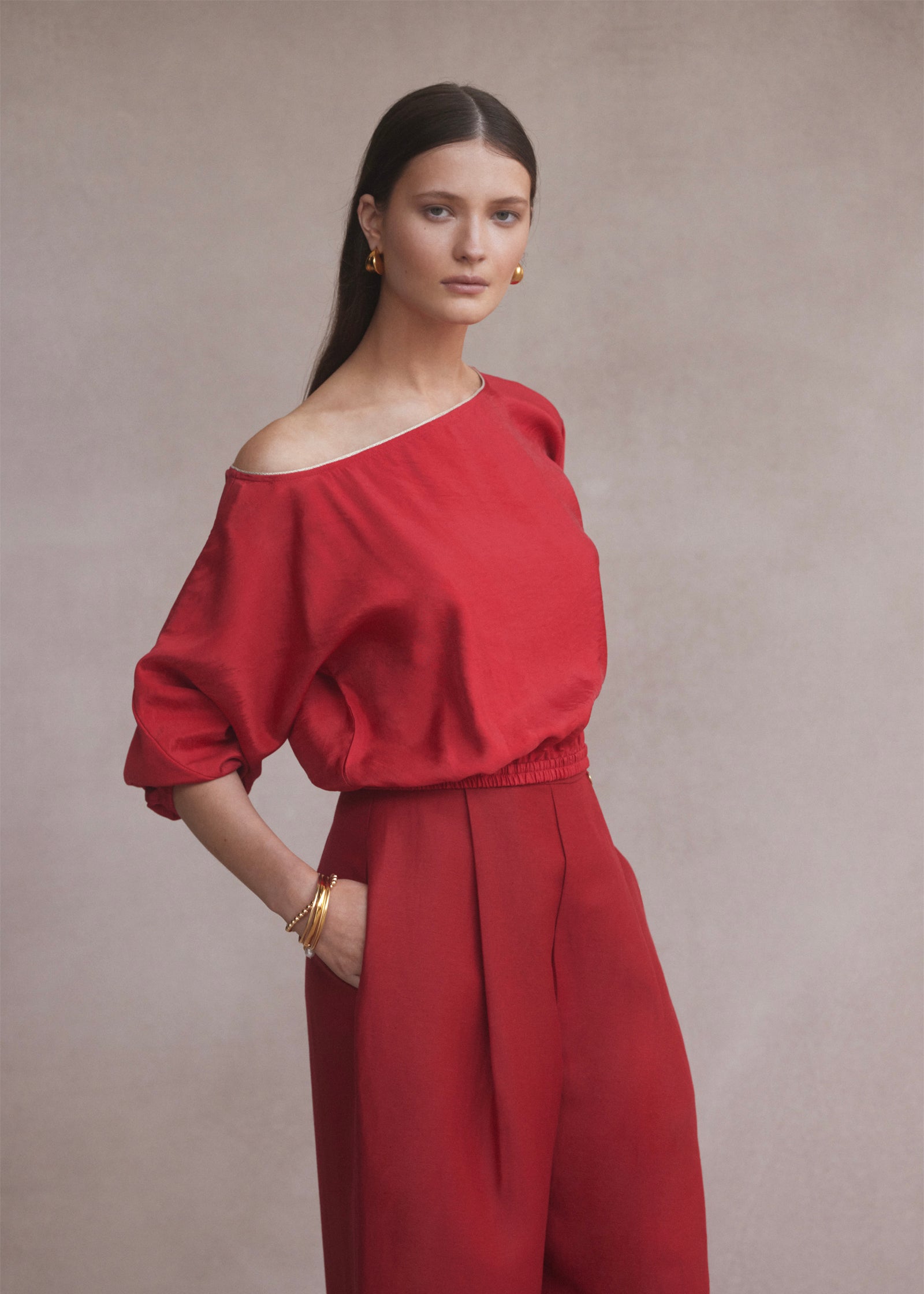 The Riviera Pant in Red Chilli are our high waisted, wide leg pant featuring front pleats, centre back zipper and gold metallic detailing. Made in a luxurious rayon linen blend, these pants have a matt linen slub from the outside and a silk-satin feel on the inside. The fabrication drapes elegantly and can withstand constant wear without pressing. Two pleats at centre front drape from the waist and fall to a flattering wide leg. Side pockets feature gold piping detail.