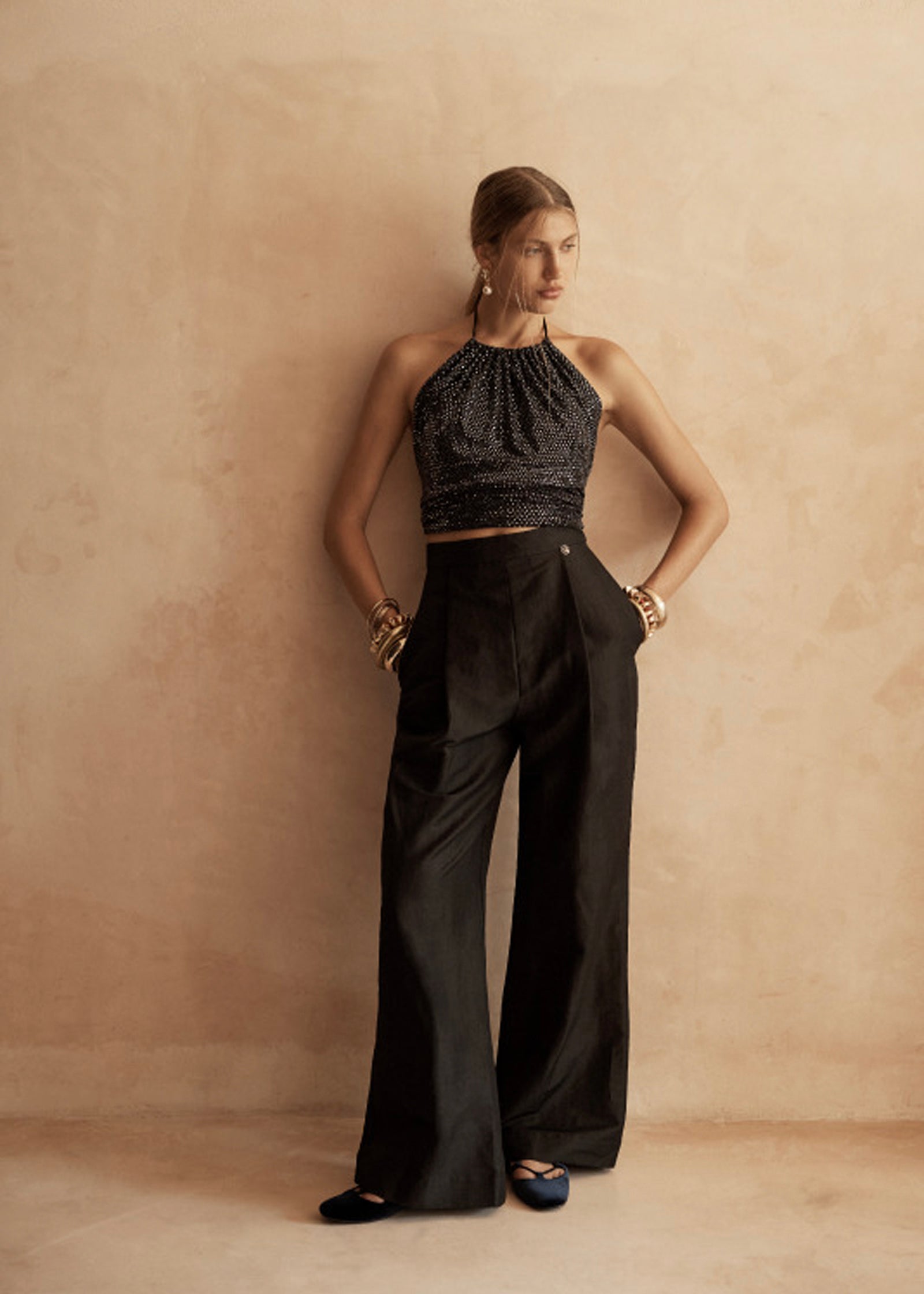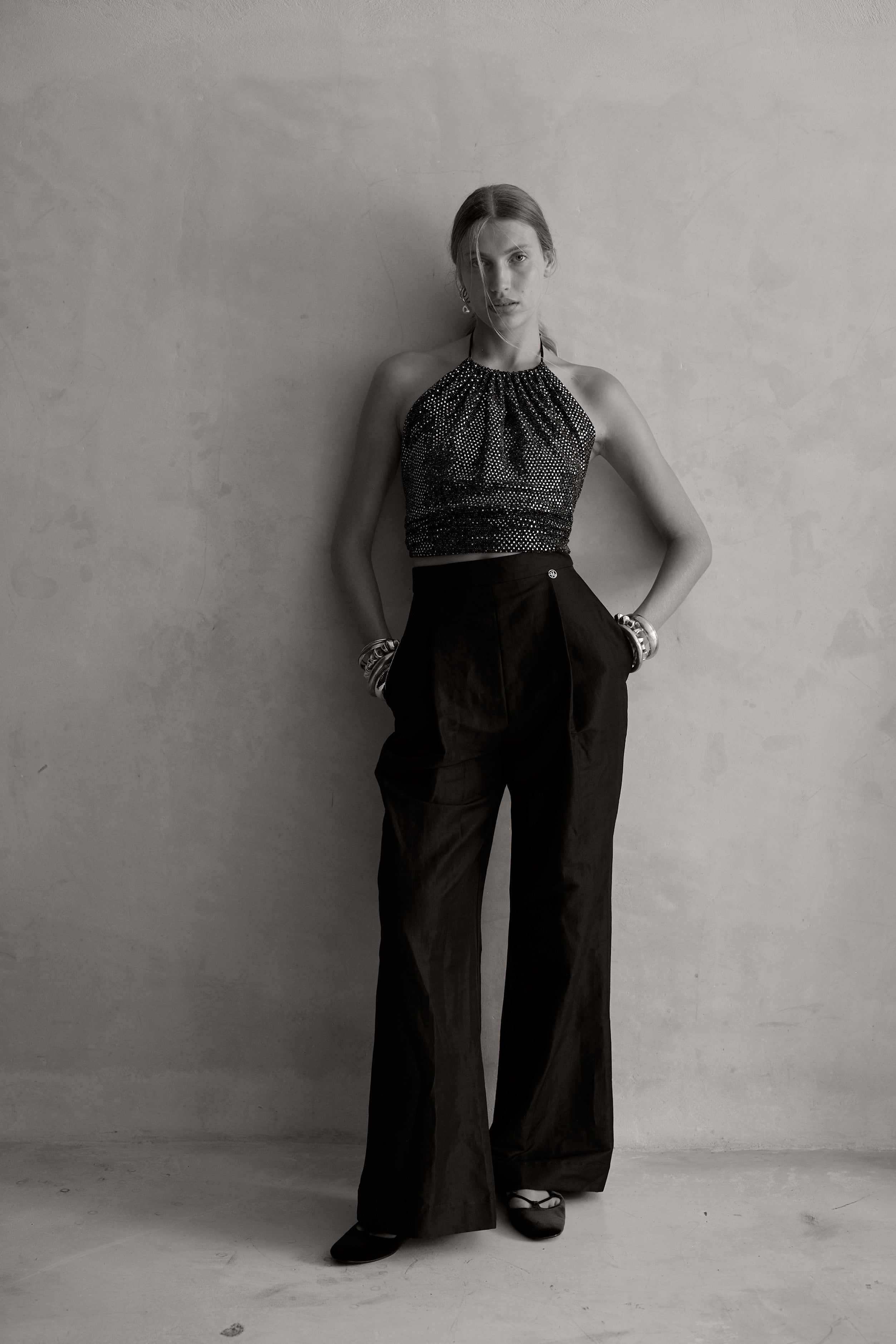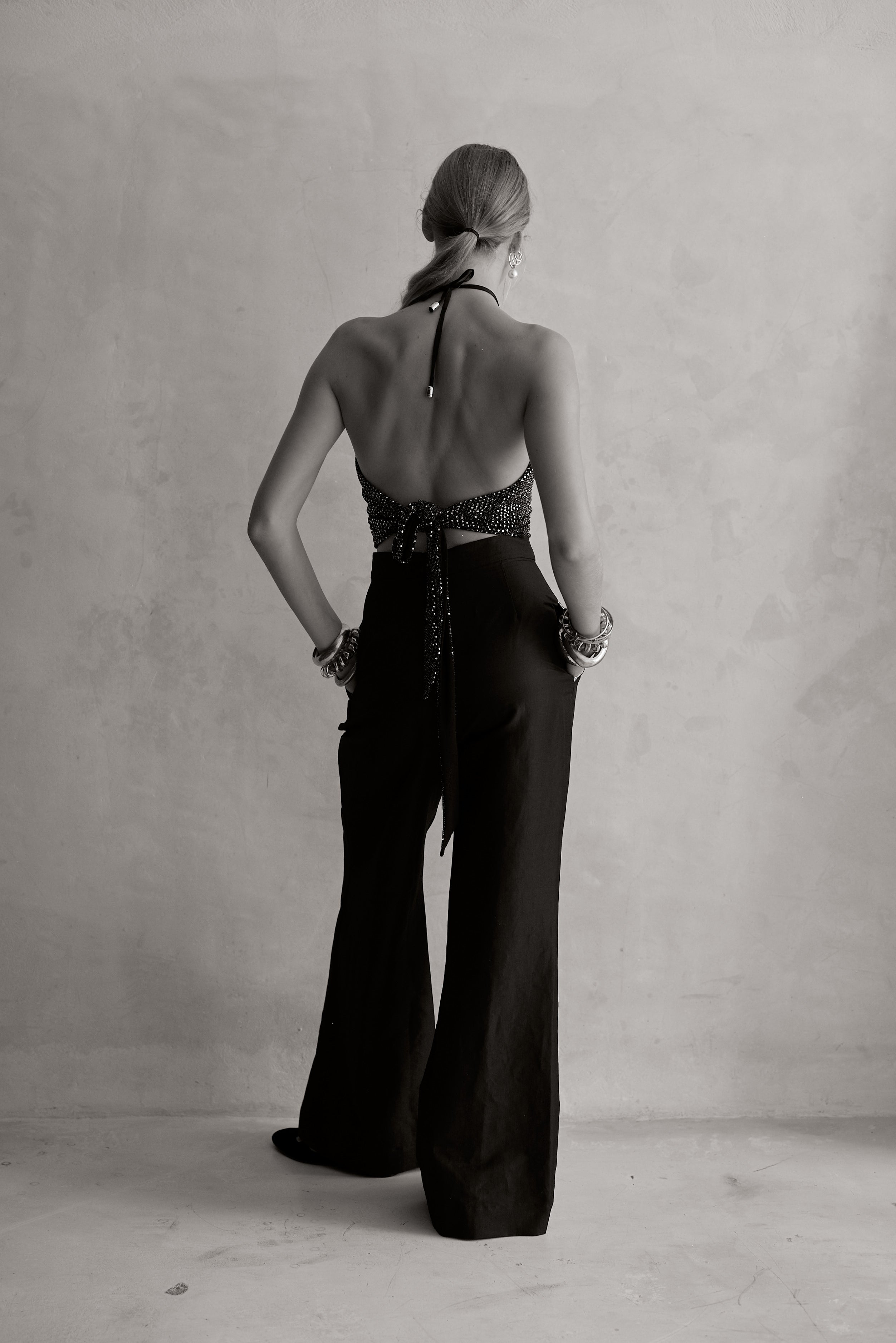 The Capo Self Tie Halter Top in Black Stretch Metallic features a round neckline that can be adjusted with a tie to form a halter top. The top wraps around the back waist to tie neatly where comfortable to reveal an elegant low back. The Lame fabrication is a lightweight, stretch metallic knit with a sparkly, shimmery effect. It can be adjusted to sit high on the waist to or low to elegantly cover the waistline. It is fully lined and a relaxed fit.