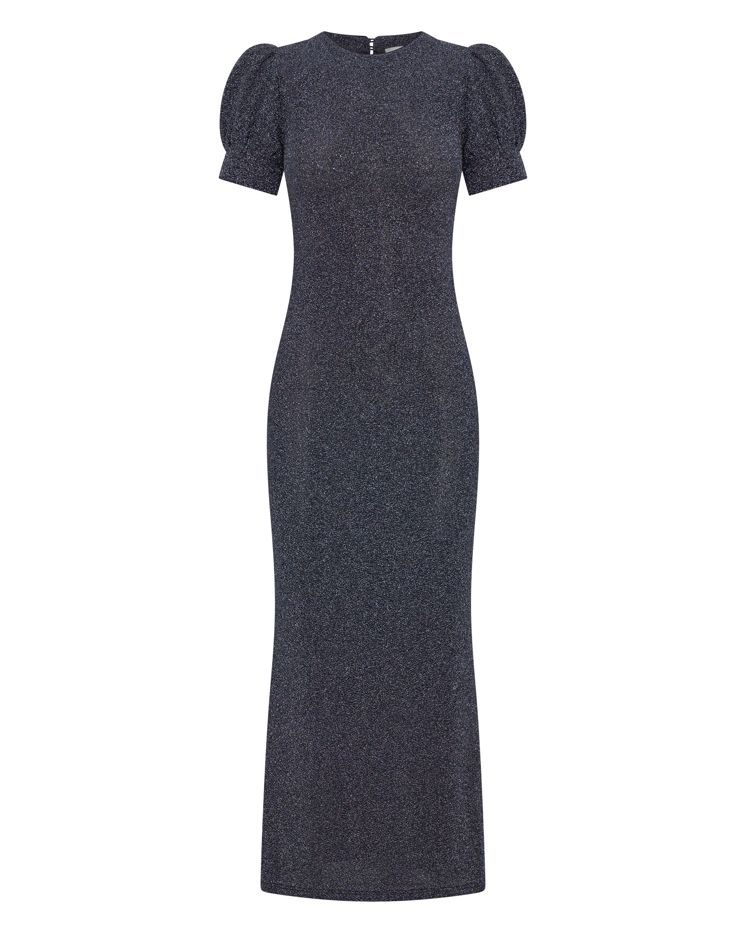 The Como Maxi Dress in Pluto Lamè features a high, round neckline with piping detail, puff sleeves and a flared hemline. The dress is shaped through the waist and hip to create a flattering sheath dress that falls to ankle length. Made in stretch lamè knit fabric that requires no ironing, the Como Maxi Dress is elegant, comfortable and easy to wear.