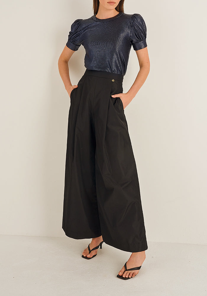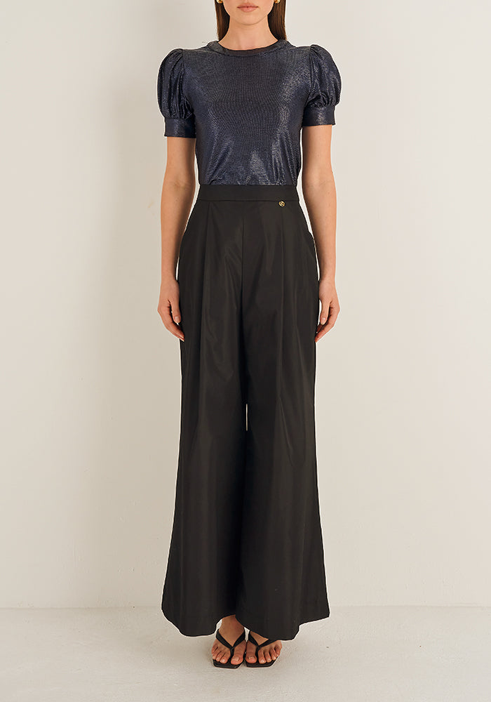 The Como T-Shirt in metallic knit adds summer sparkle and shimmer to summer separates. Featuring a flattering round neckline and dramatic puff sleeves, the Como T-shirt is a chic summer essential styled with our Oleander Skirt or Riviera Wide Leg Pant.