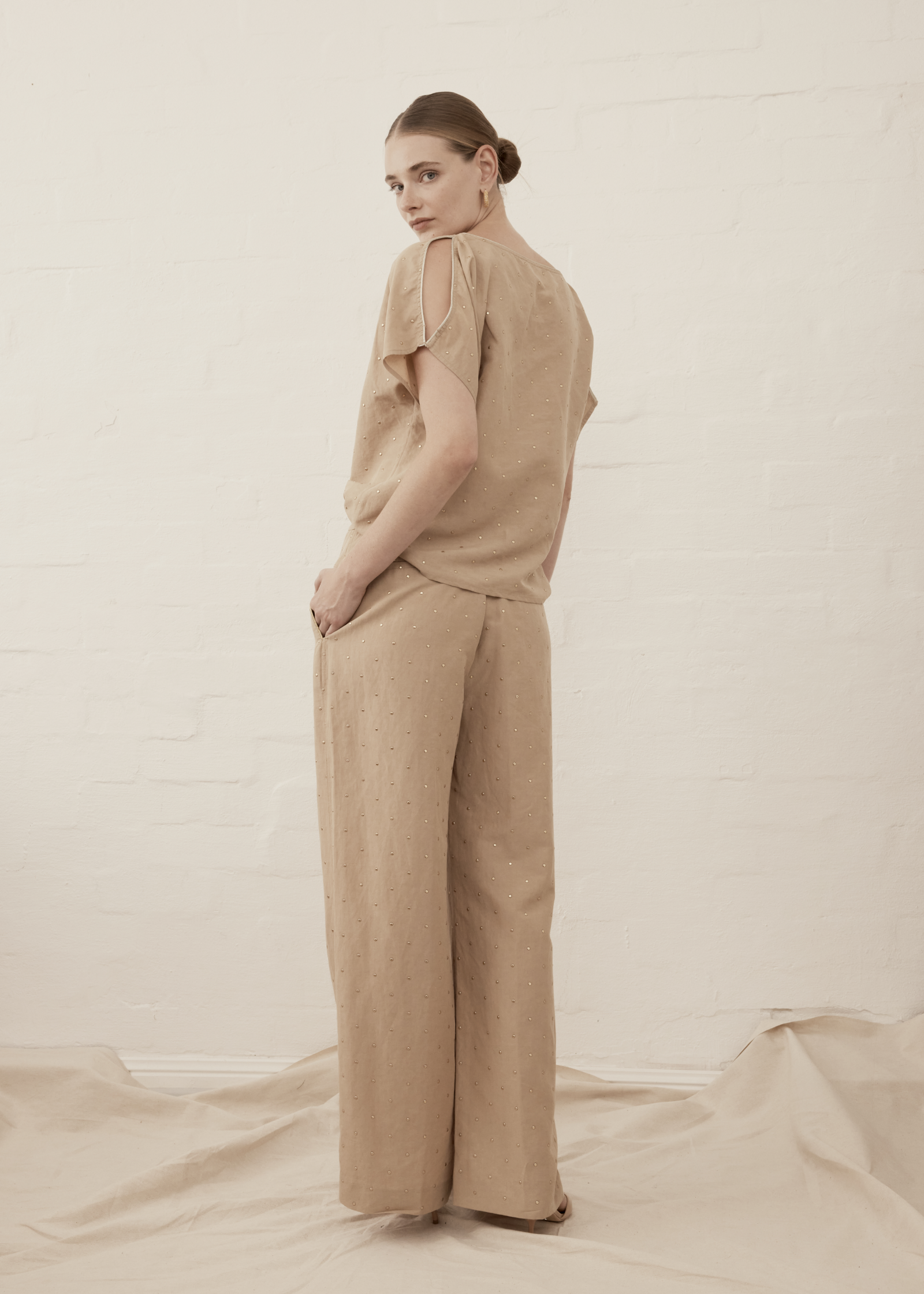 Experience comfort and style with the Dolce Relaxed Pant. These high-waisted trousers feature a straight leg fit with a deep hem detail, crafted from a soft tencel linen blend for elegant draping. Practical side pockets with metallic accents, a gold button and hidden zipper complete this versatile design, perfect for both casual and dressier occasions.