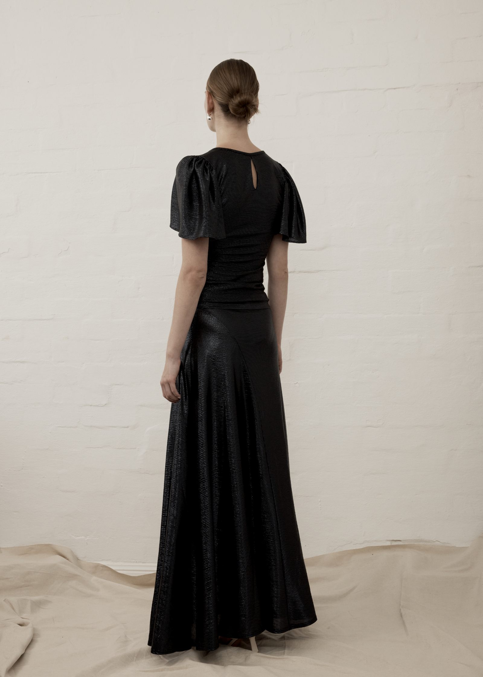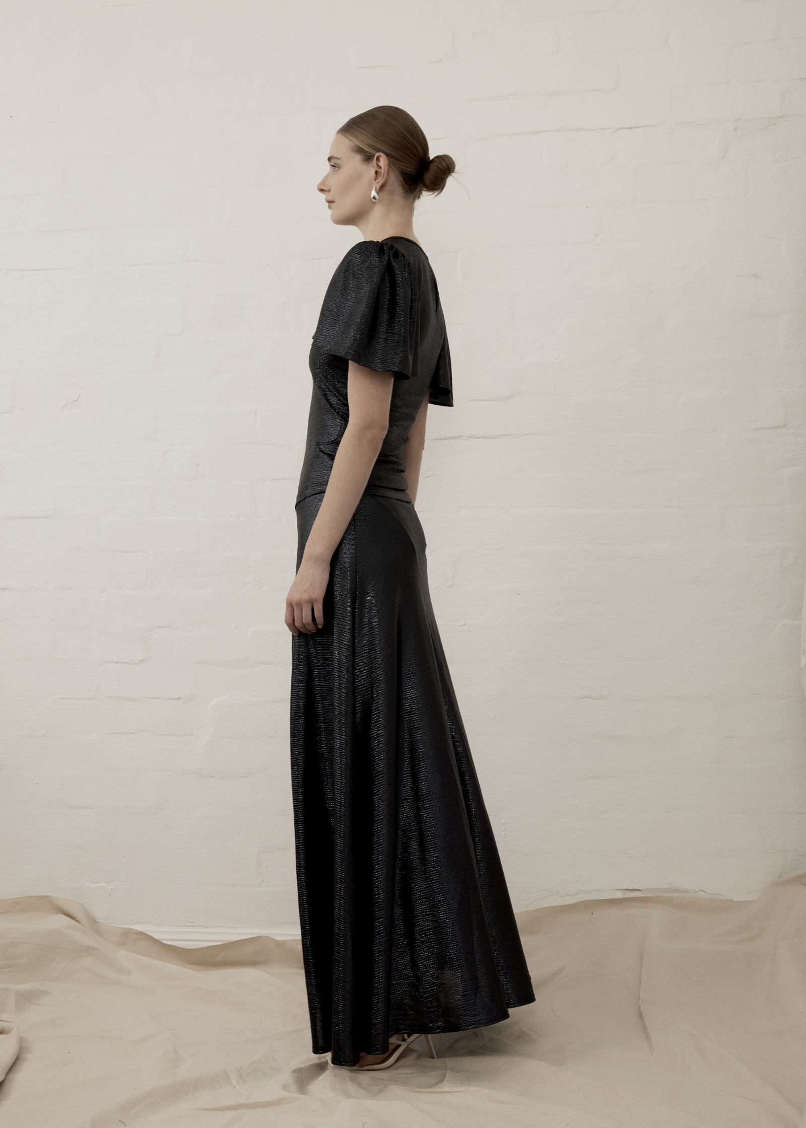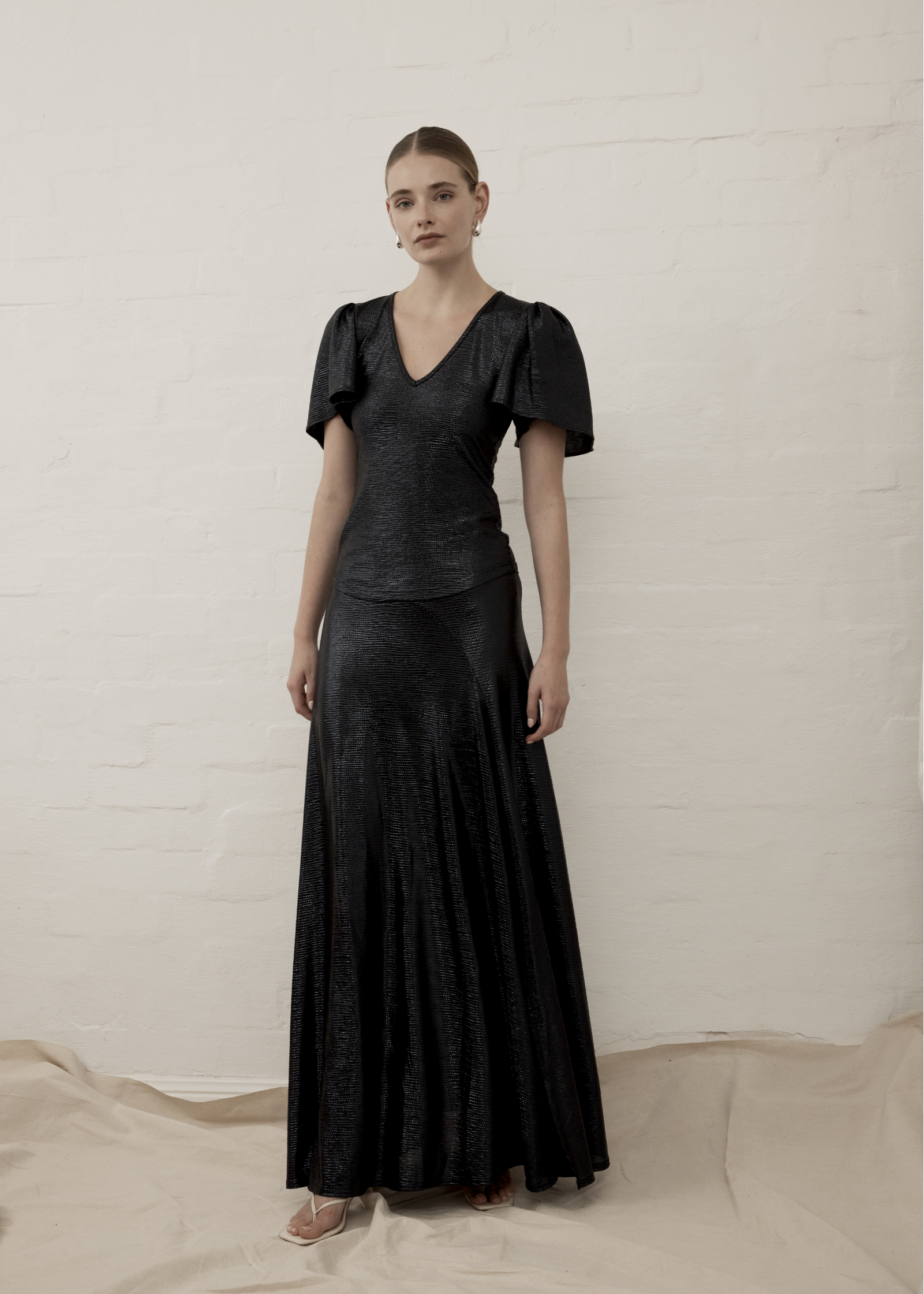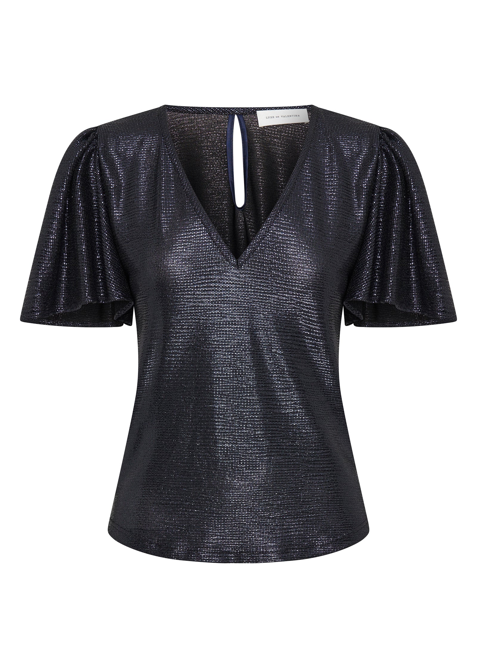 The Farfalla Fluted Top in Navy Metallic features a deep v-neckline and fluted sleeves. Made in comfortable, stretch metallic fabrication, this top is flattering and easy to style for day or night.