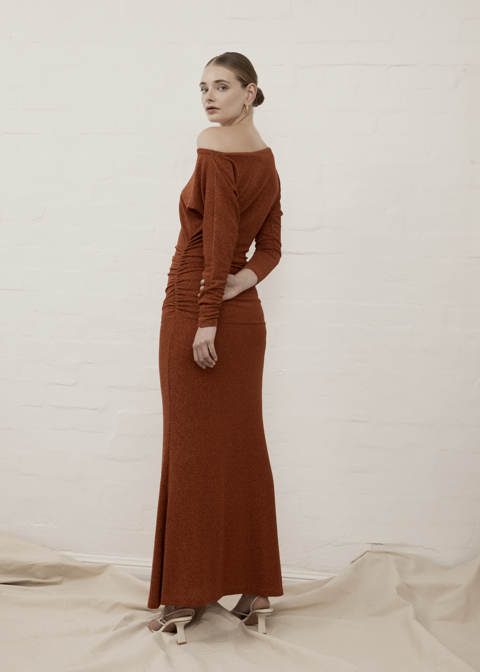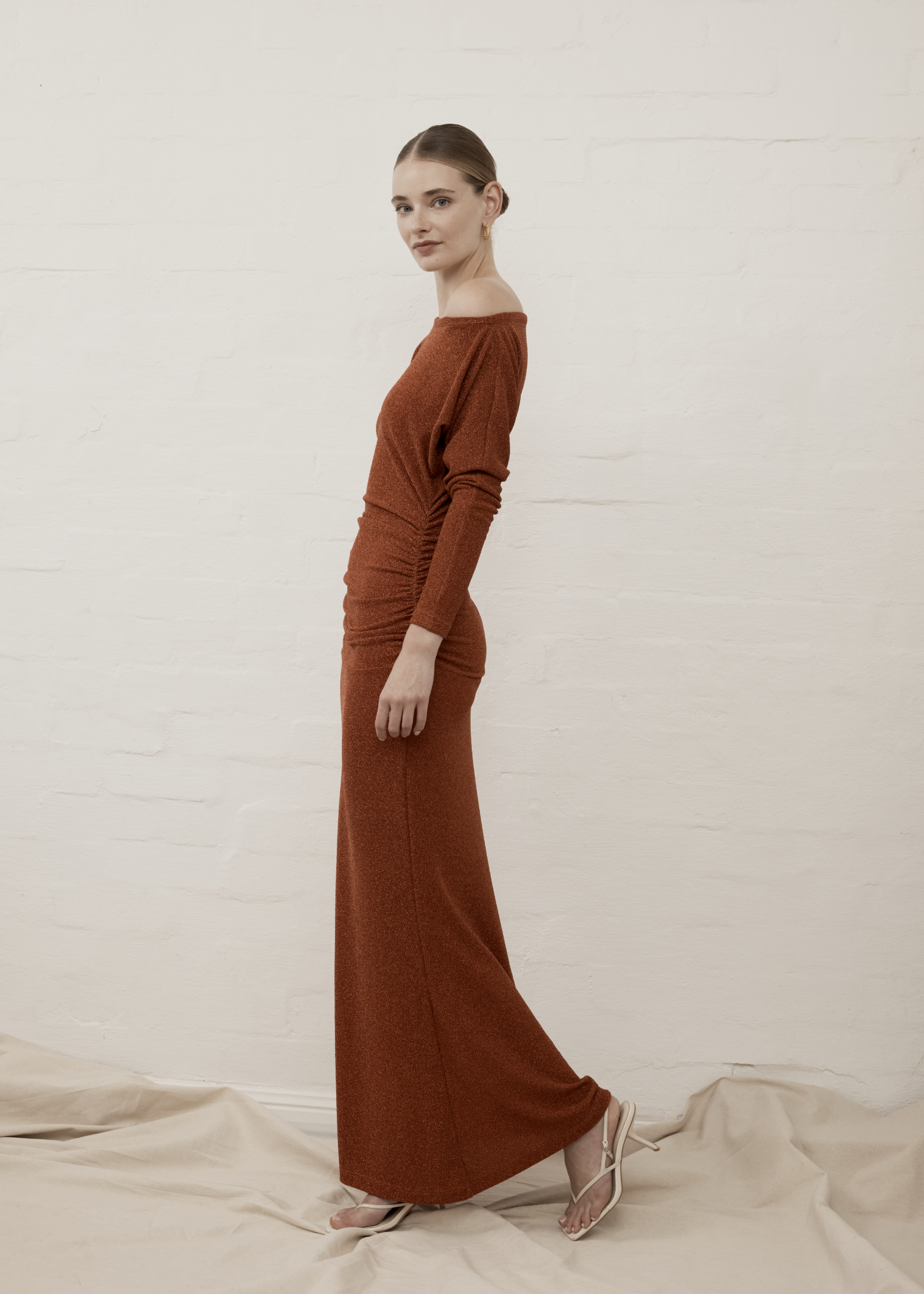 Discover relaxed glamour in our La Baia Ruched Maxi Dress. Fitted through the wasit & hip with ruching detail, the La Baia Maxi Dress features an elegant semi-fluted hemline, long fitted sleeves, and dramatic boat neckline. The stretch fabrication and ruching detail through the waist combines to create flattering, comfortable sillouette the exudes comfort.
