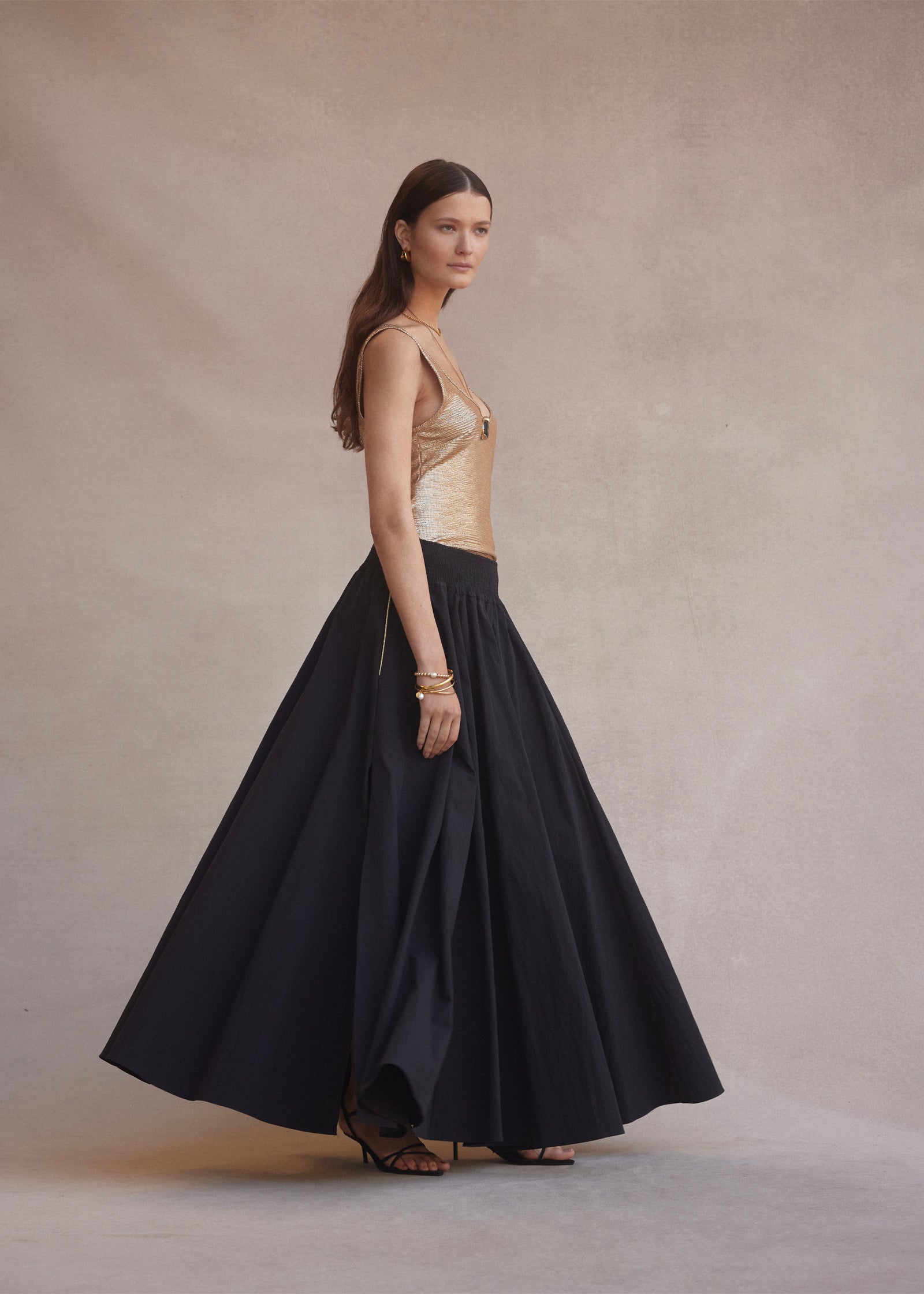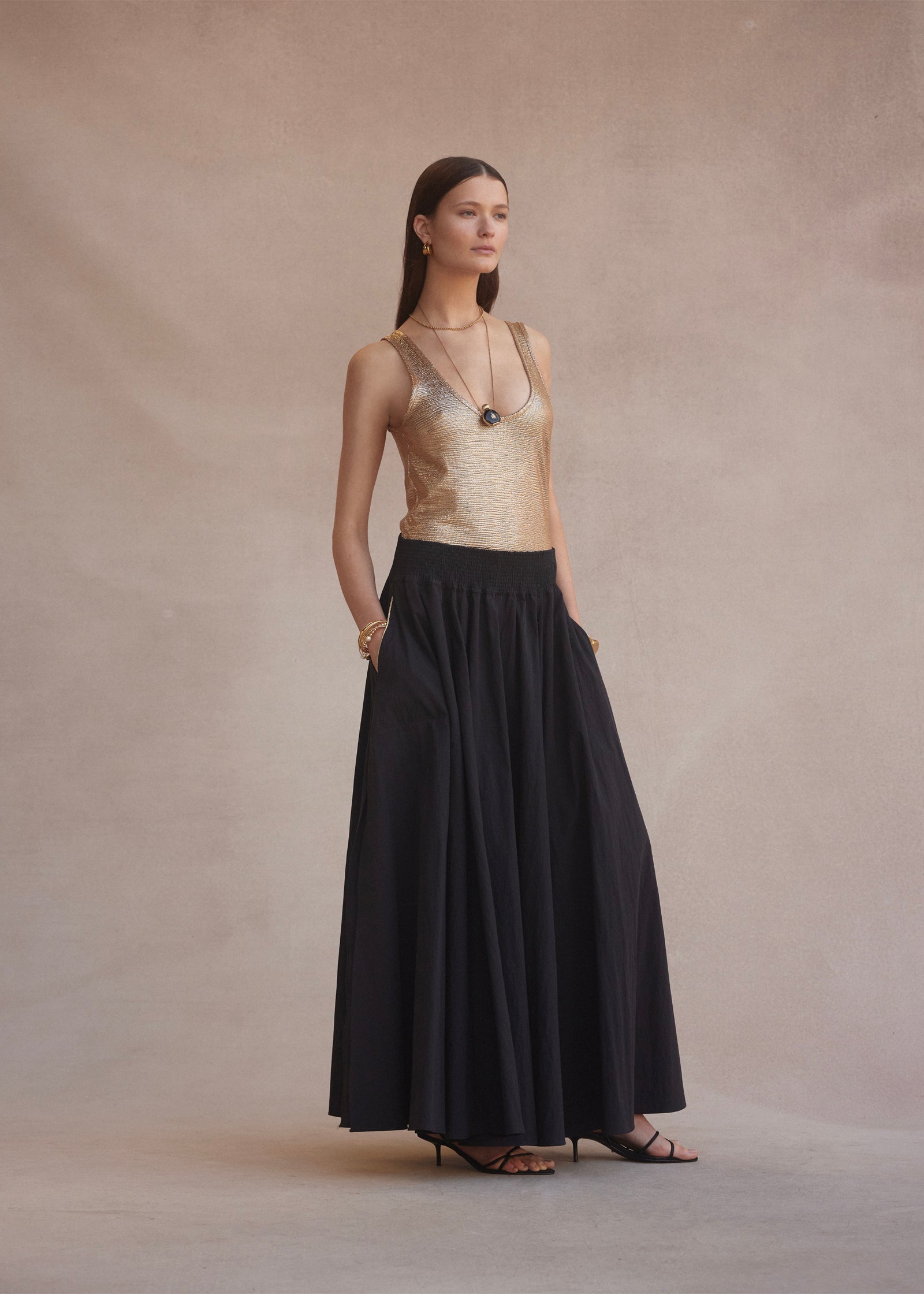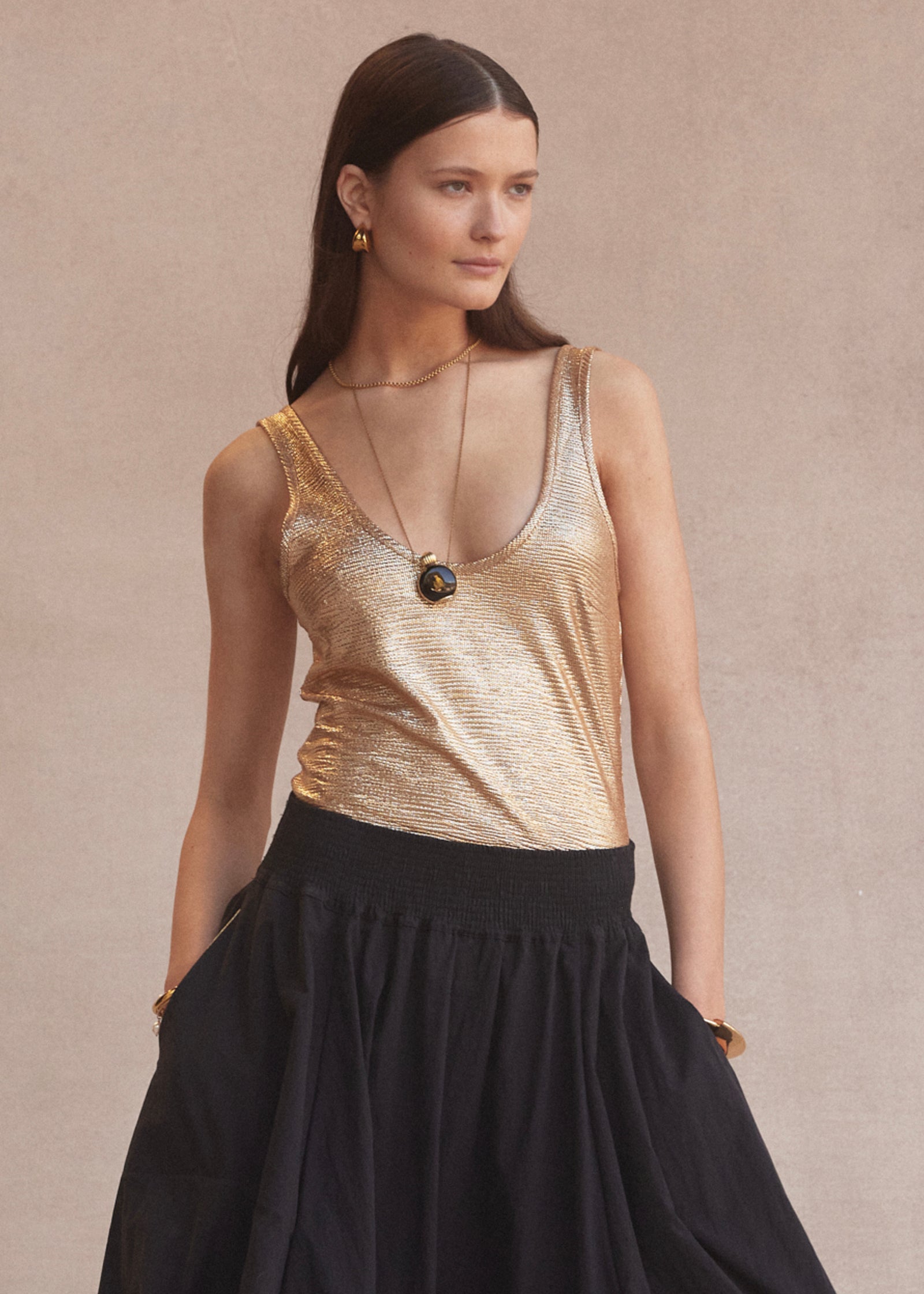 The Lido Scooped Neck Singlet in Cartier Gold Shimmer Metallic features a deep scoop neckline front and back with self binding detail. Made in soft, stretch metallic lamè fabric and dsigned to be a semi-fitted shape, the Lido Singlet is a wardrobe staple.