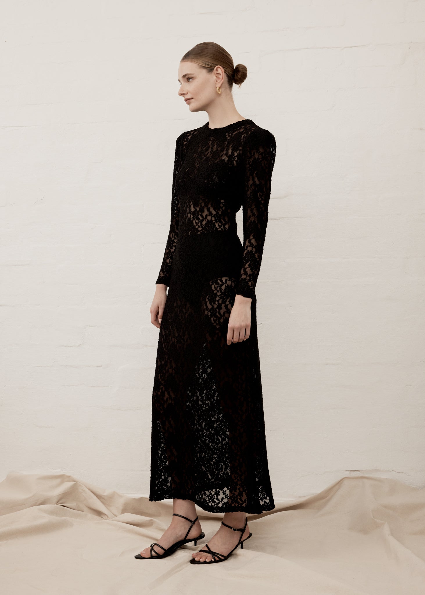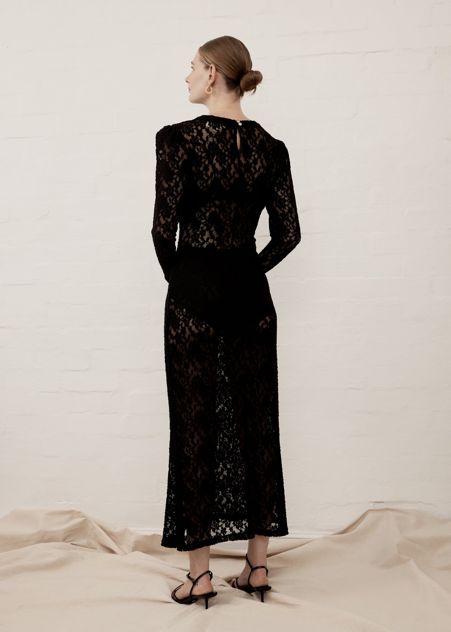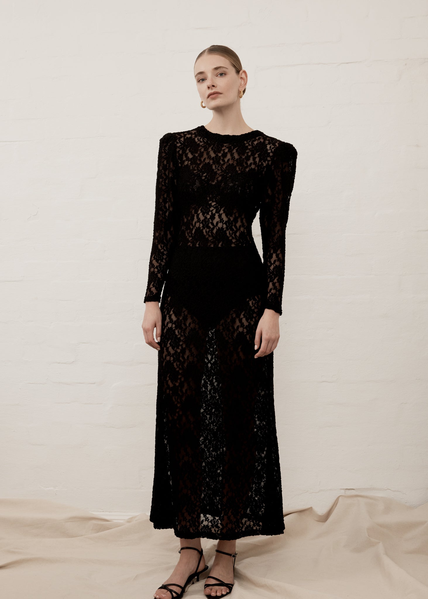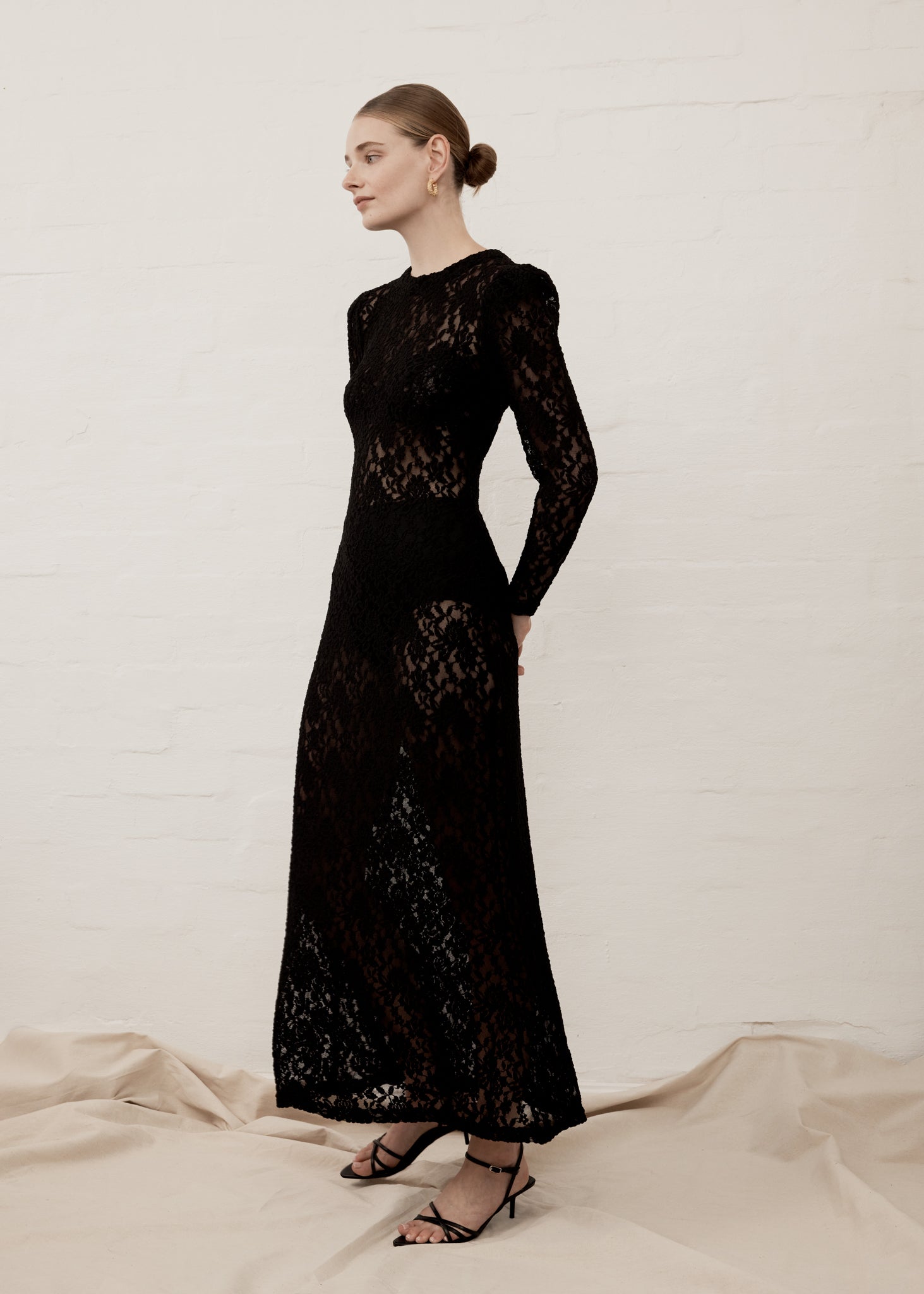Our Long Sleeve Como Maxi Dress is a fitted, tube-style dress crafted from soft stretch mesh embroidered with floral detailing. The dress features a round neckline with piping detail, complemented by long sleeves with gathered puff detailing at the shoulders. A flattering fishtail hemline adds a touch of drama and winter elegance to this flattering silhouette.