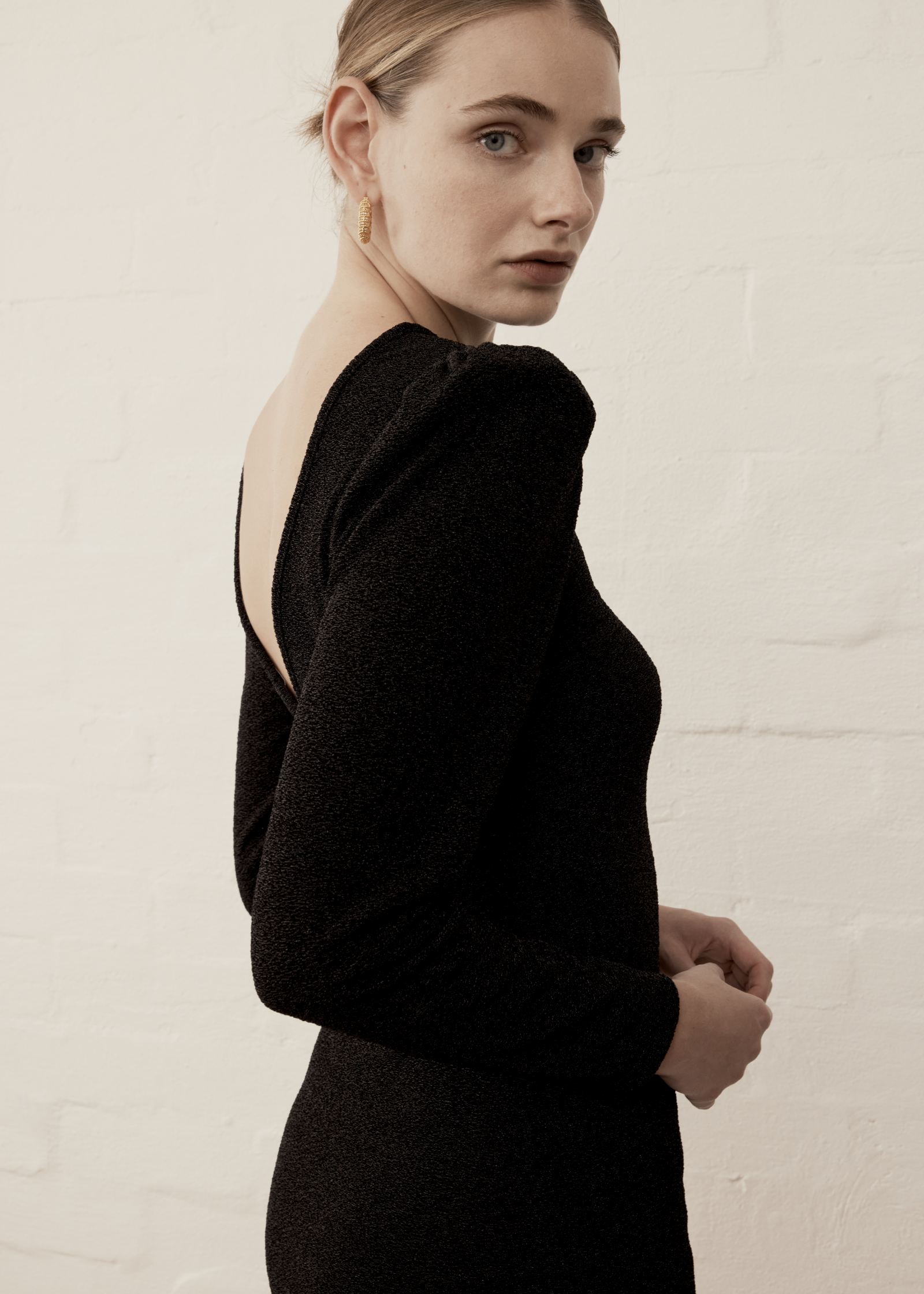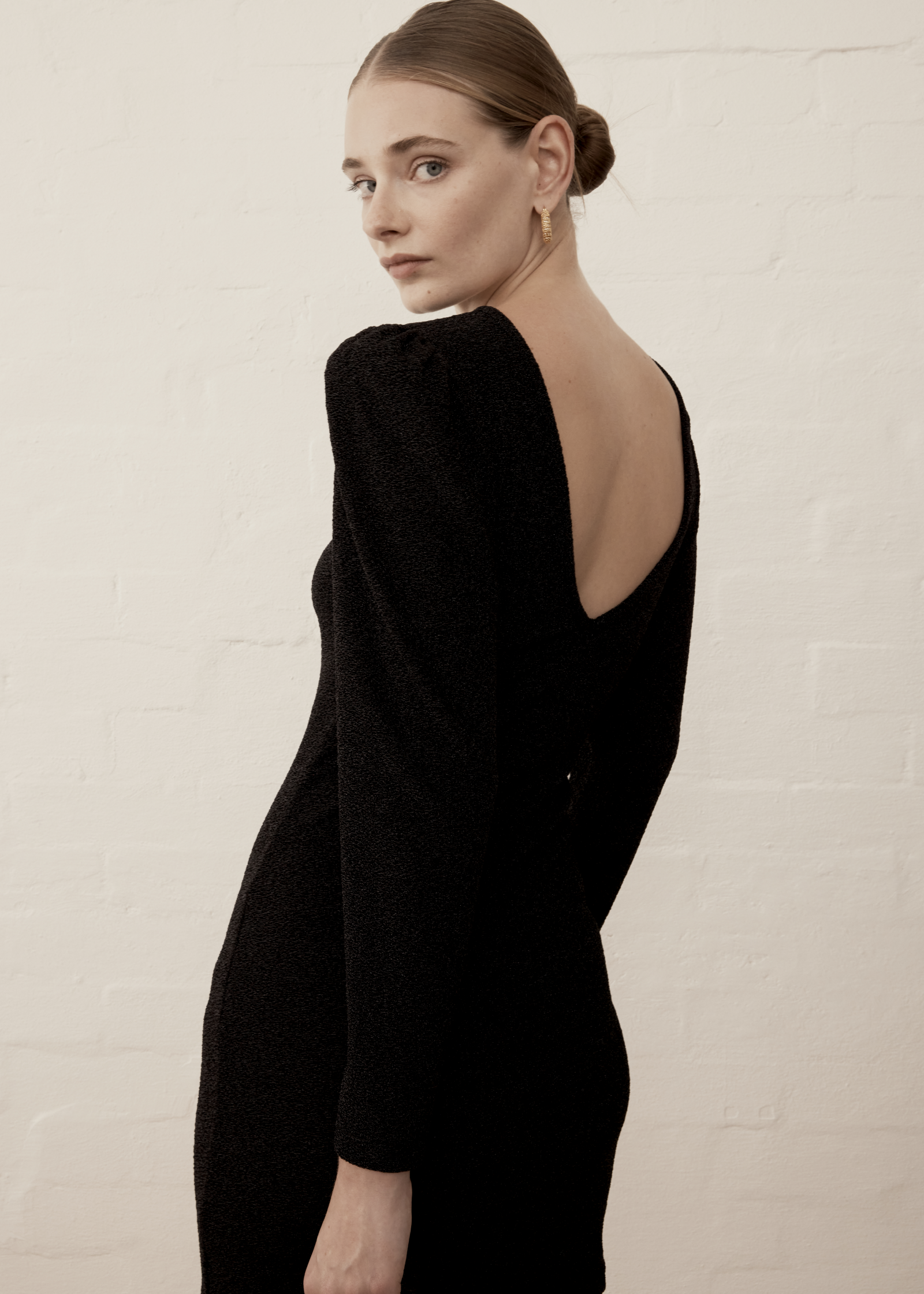 Experience this cute party dress for your next soiree. The Sisi Mini Dress in classic black features an elegant long, puff sleeve & boat neckline with a deep v-back. The dress is designed to be reversable and can be worn with the v-neckline front or back.  The stretch, metallic knit fabrication delivers a comfortable and flattering fit throughout.