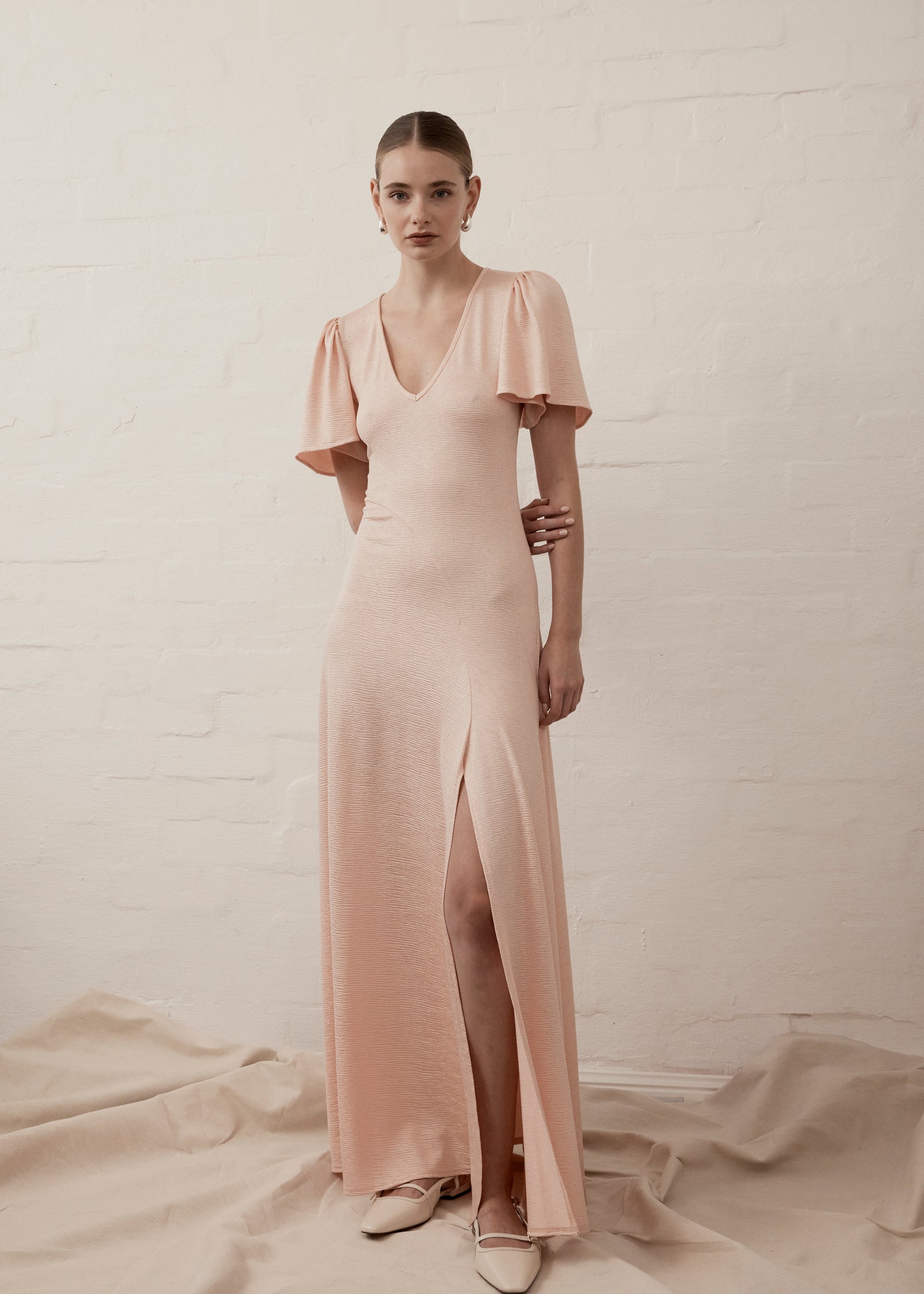 Experience timeless elegance in our V-neck Fluted Como Maxi Dress in soft Powder Pink. Fitted through the waist & hip, this dress boasts a graceful fluted silhouette with a faltering v-neckline, elegant front split, a flattering fluted short sleeve, piping detail at the neck and double gold buttons at back neck. The stretch fabrication delivers a comfortable and flattering fit throughout.