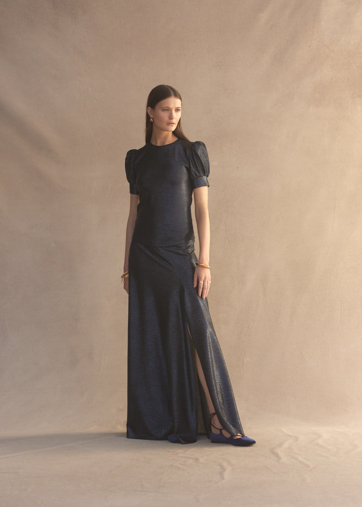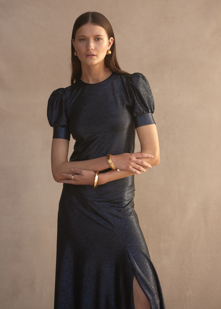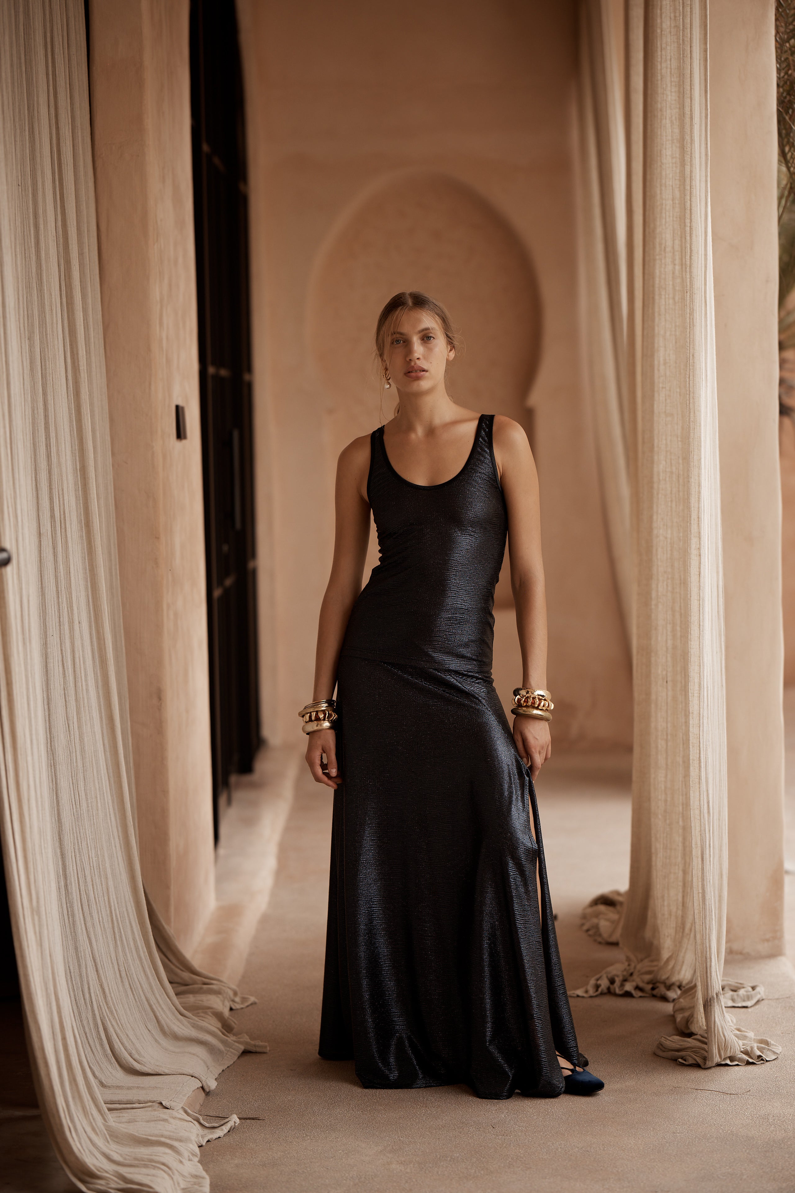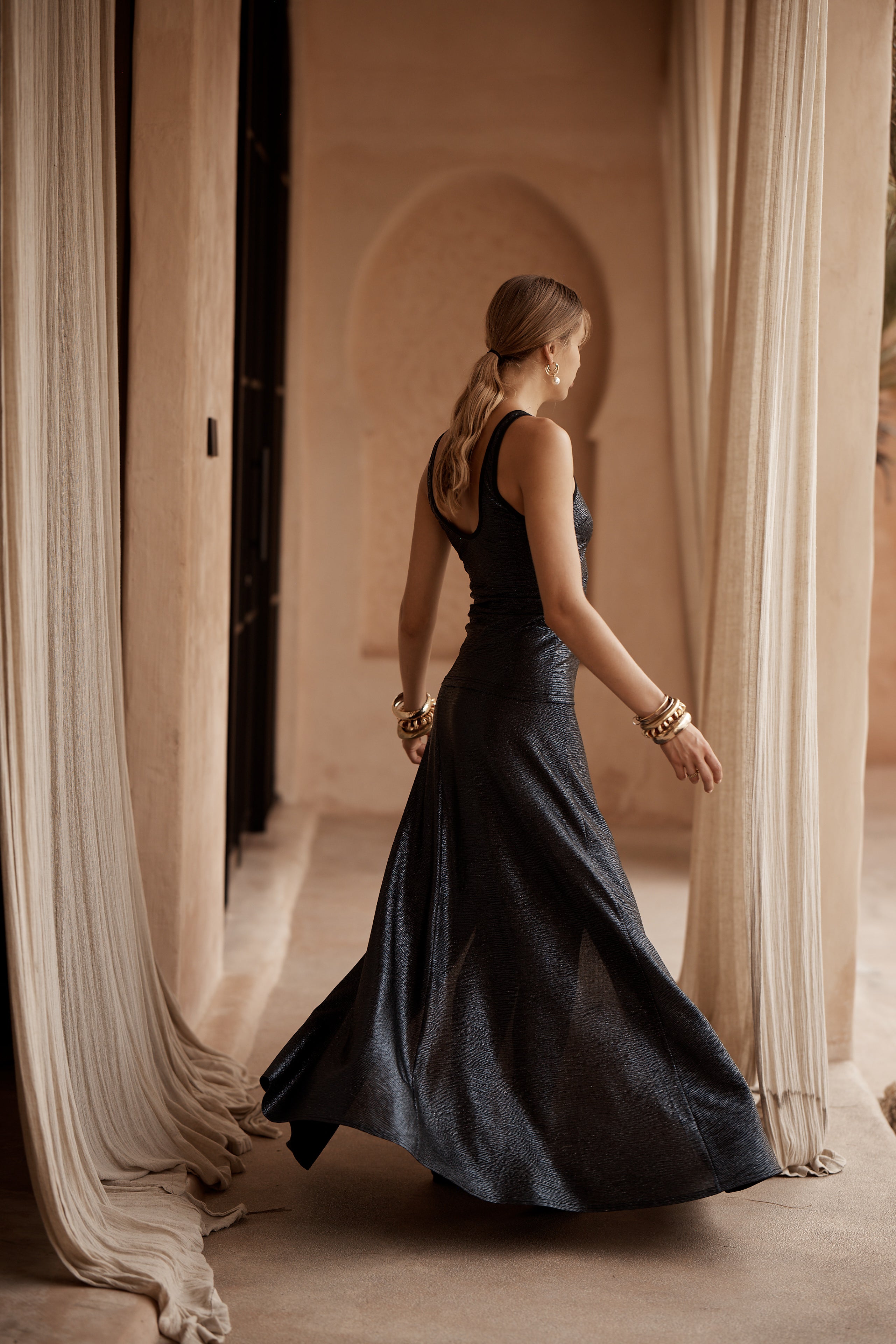The Fluted Como Maxi Skirt in Navy Metallic is cut from our best selling Fluted Como Maxi Dress. It features an elastic waist, front split and fluted hem line. The front split extends from a bias cut feature to create that creates an elegant fit that is comfortable, easy to wear and timeless. Made in soft, stretch metallic lamè fabric that requires no ironing, the Fluted Como Maxi Skirt can be styled with our Lido Scooped Neck Singlet and Como Puff Sleeve T-shirts or a simple cotton shirt.