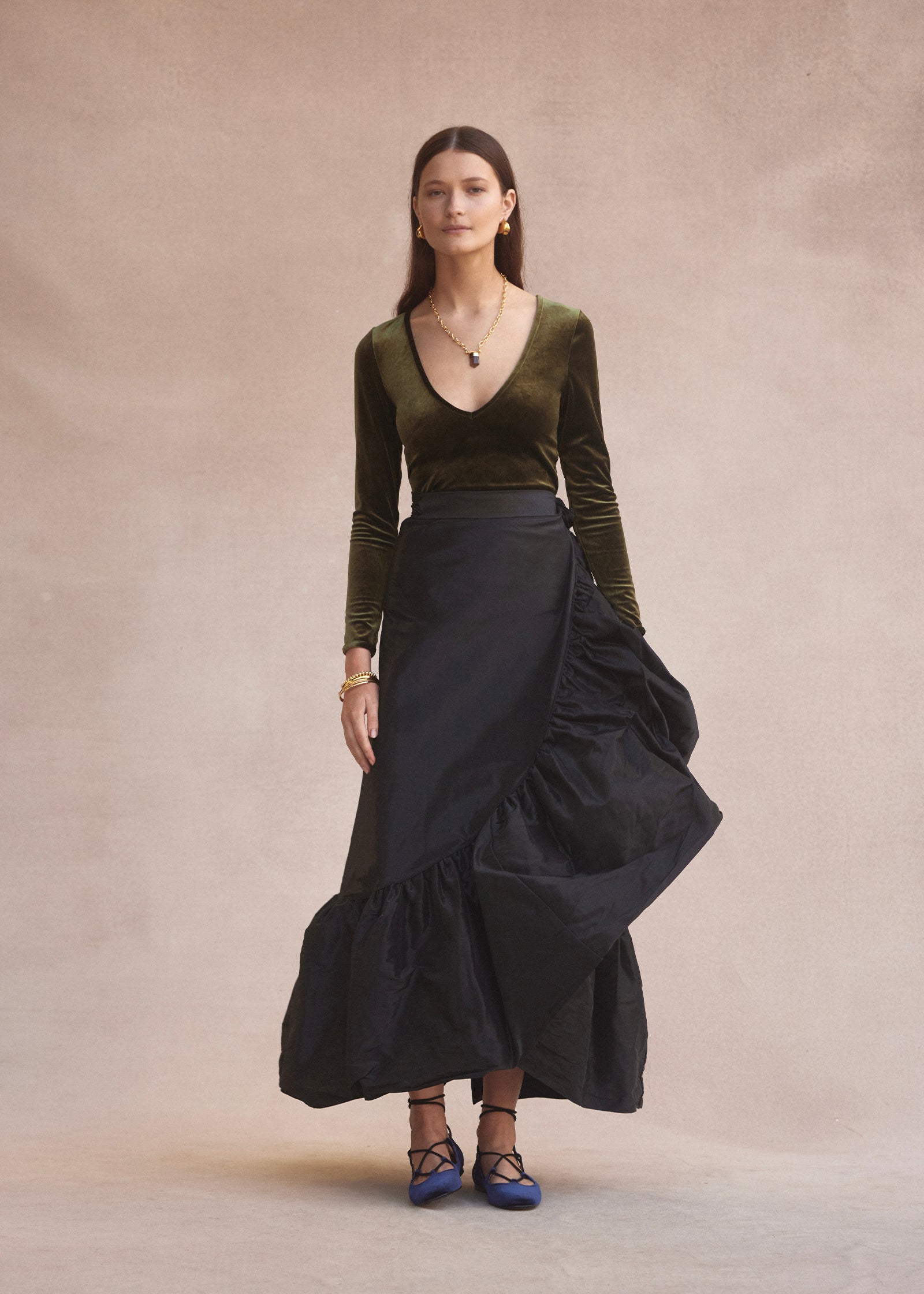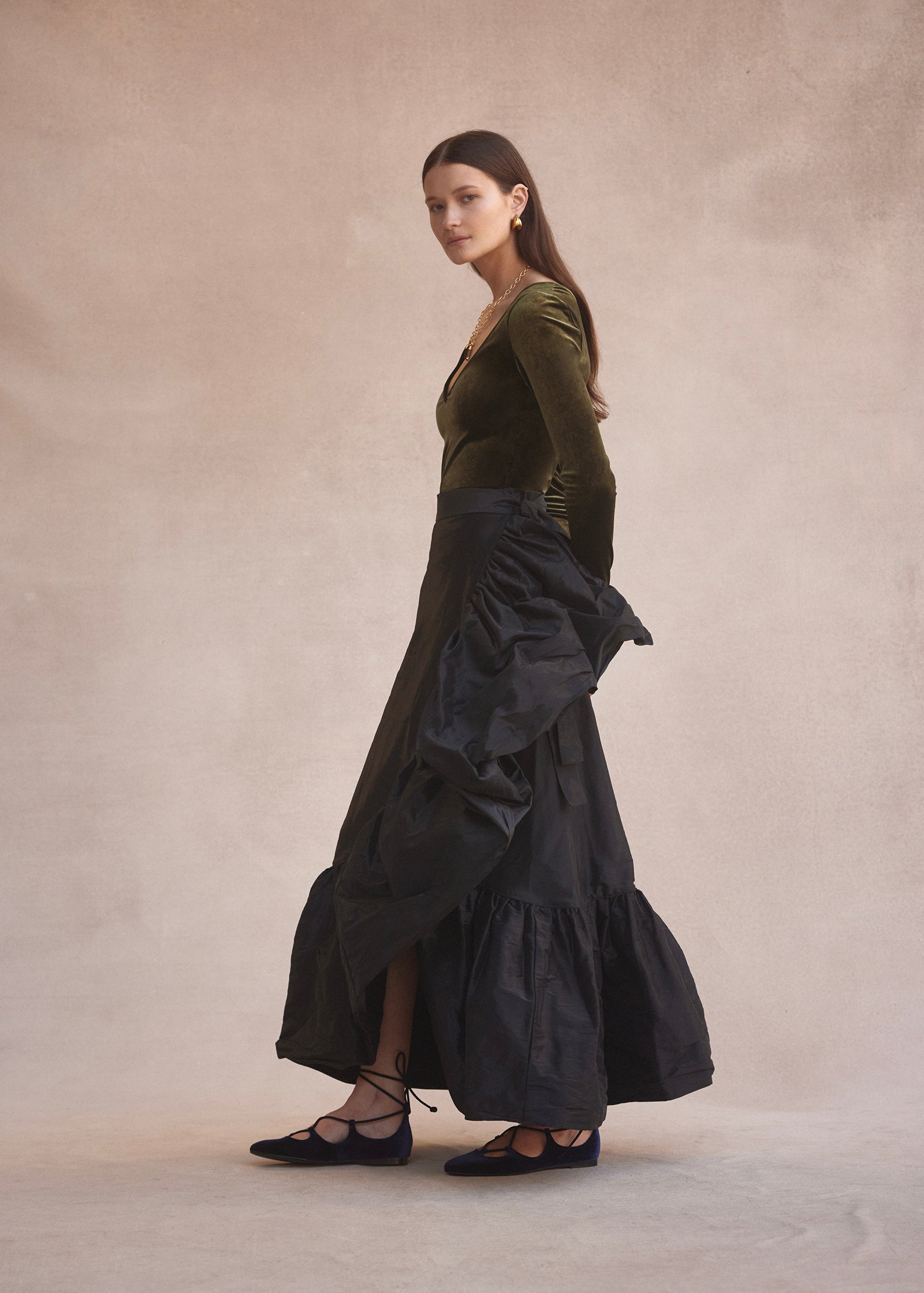 The La Scala Wrap Maxi Skirt in Black is made from an ultra light, memory taffeta sourced in Italy. Designed to wrap firmly around the body and self-tie on the right side of the waist, this dramatic skirt features a large double frill gathered onto the main skirt panel. The frill drapes to reveal a gently split through the left. The double frill hem can lie flat or be pulled apart to create dramatic volume.