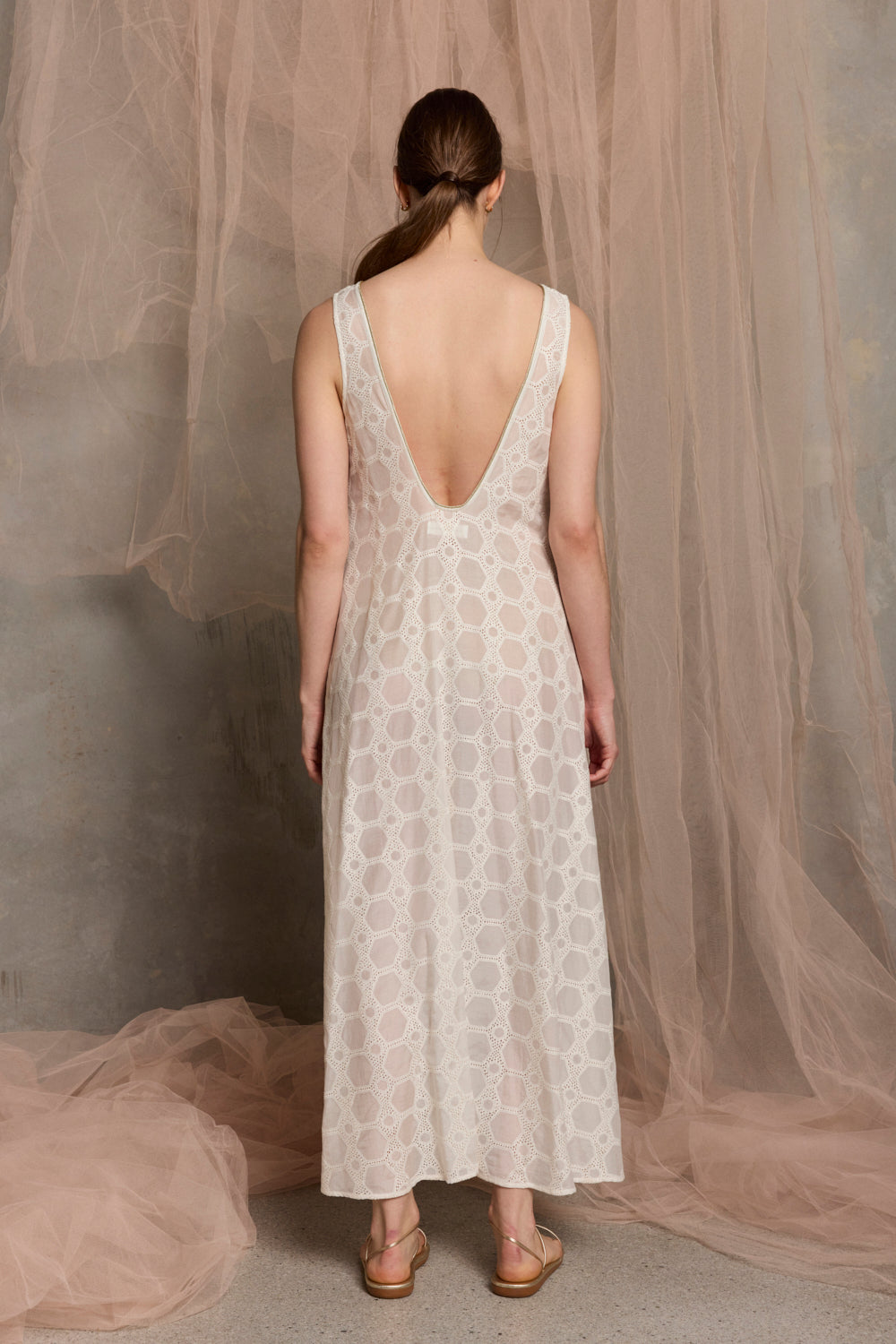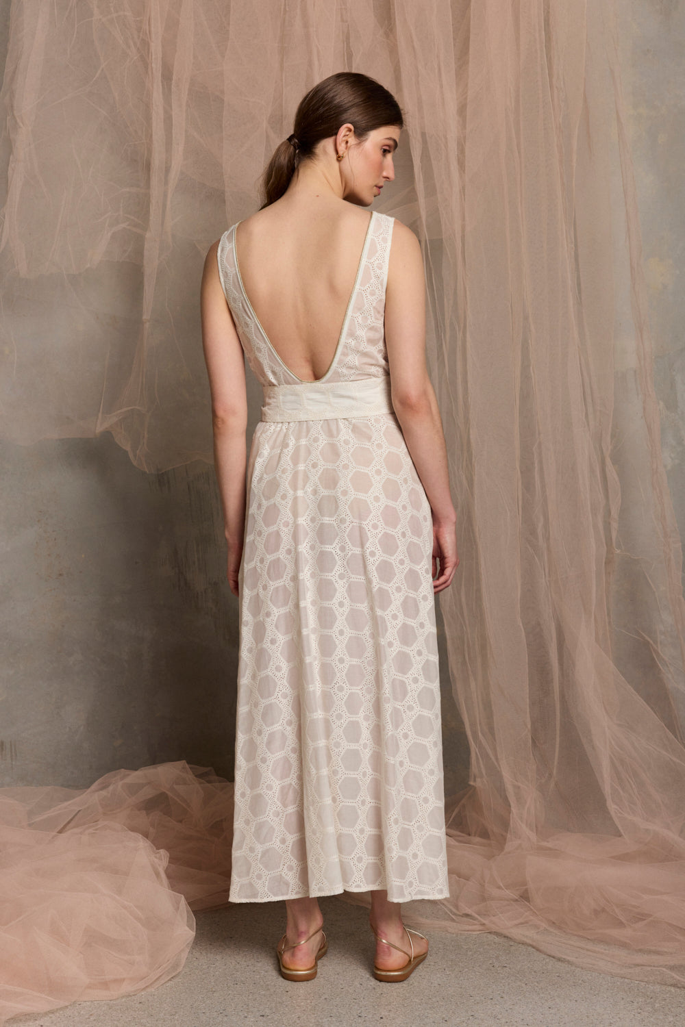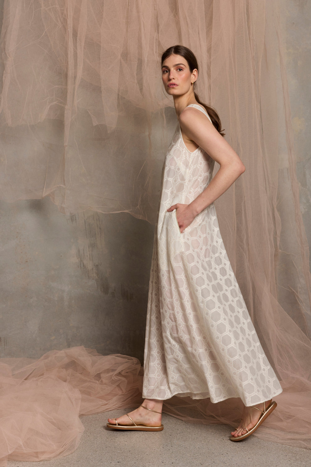 Our lightweight Milazzo Silk Cotton Embroidered Maxi Dress in White features a scooped front neckline, deep scooped back, and side pockets. The effortless style offers both elegance and a relaxed fit. The signature metallic piping and side splits add refined accents, while the optional waist tie lets you customise your silhouette. Wear it with or without the matching slip and waist tie for versatile looks that flow beautifully from casual day to evening. Perfect for warm days when you want to feel both comfortable and stylish.