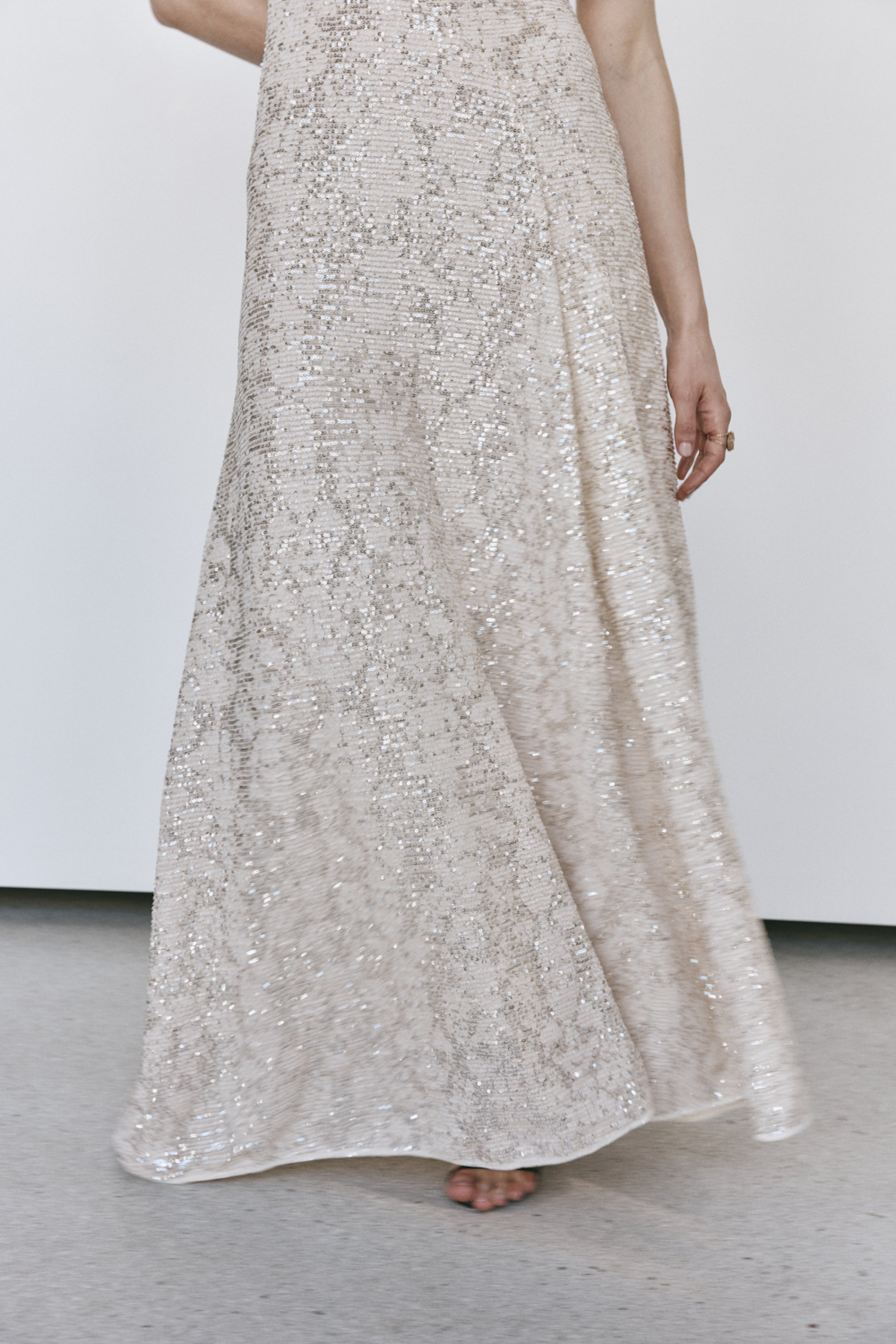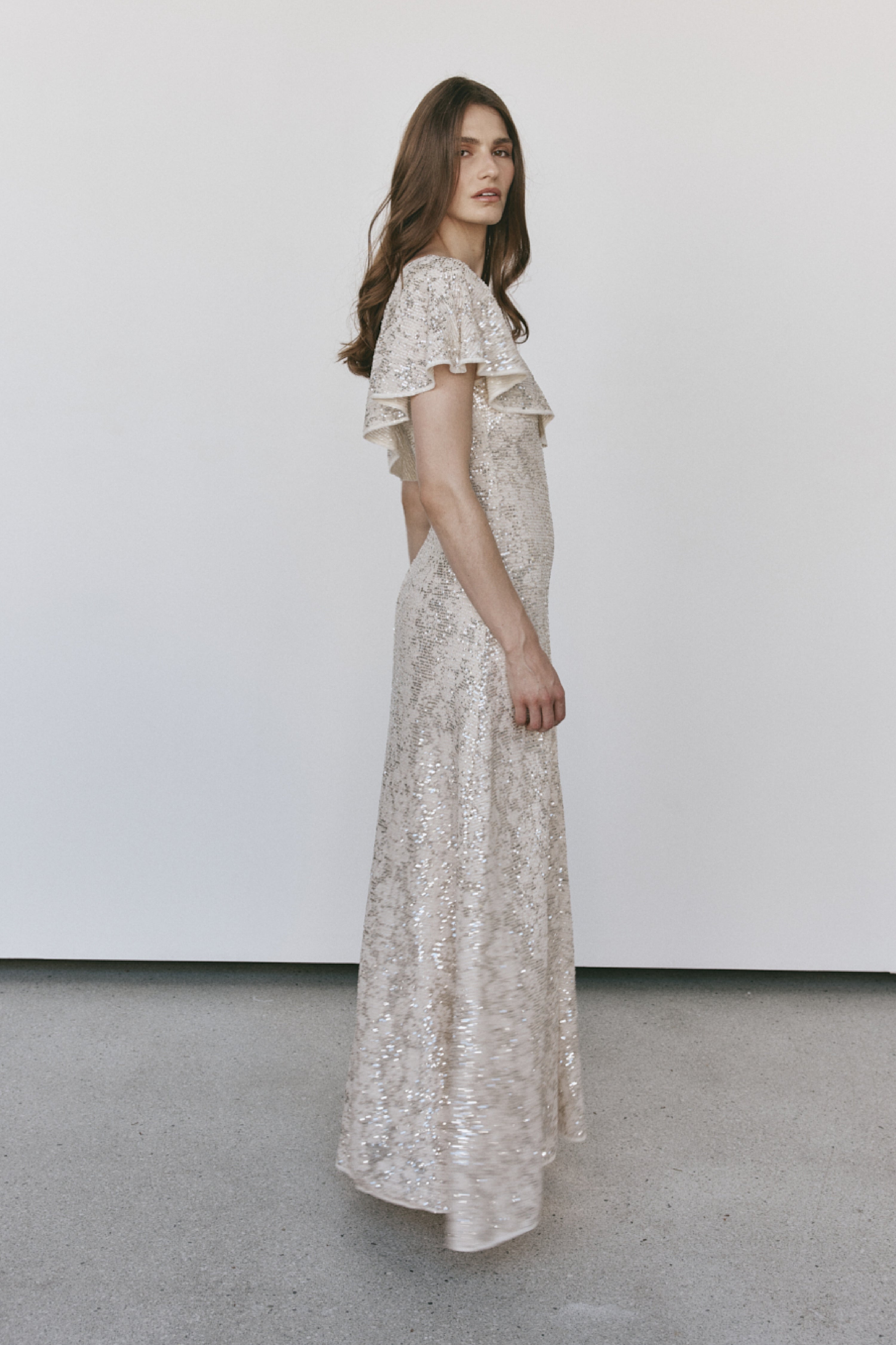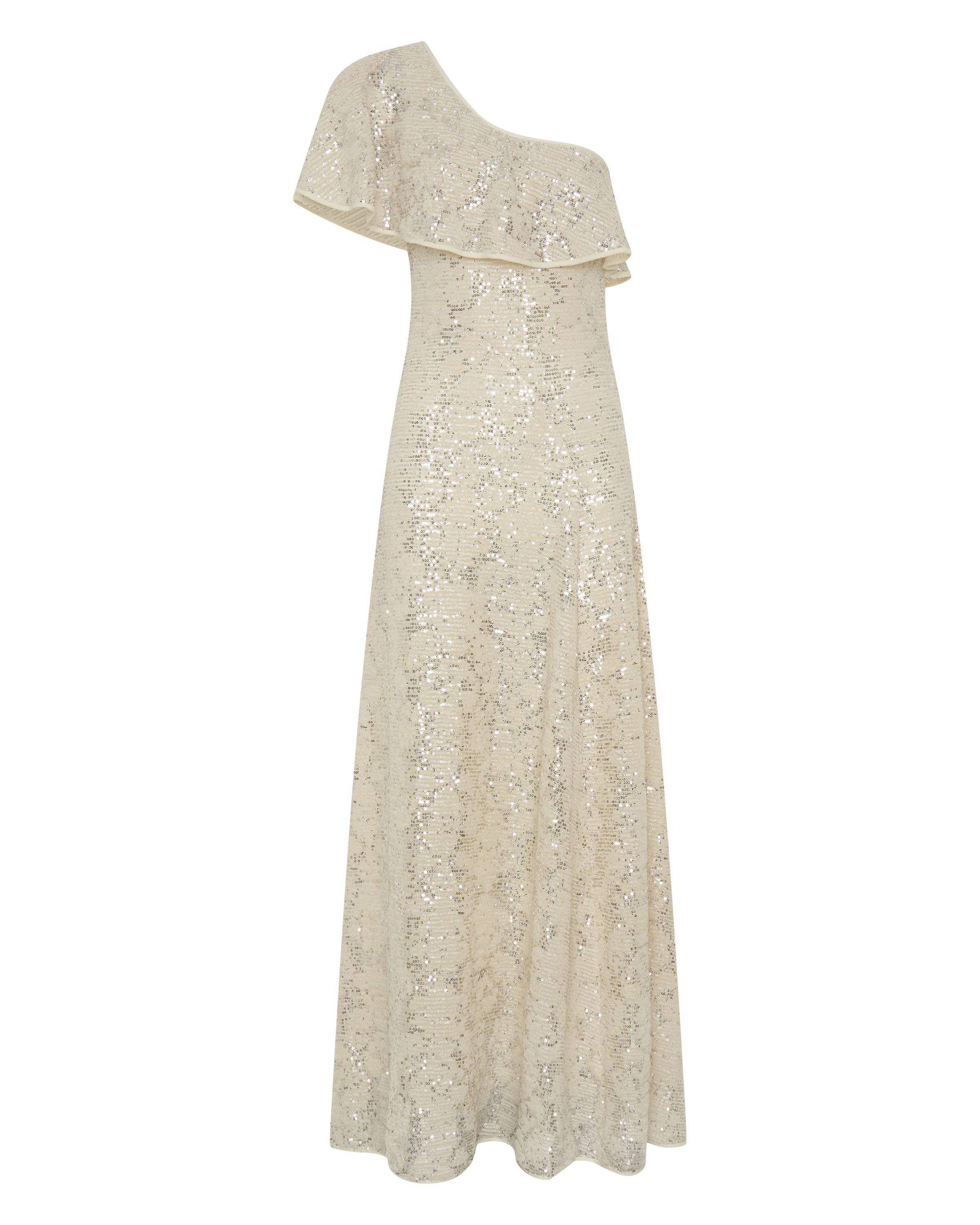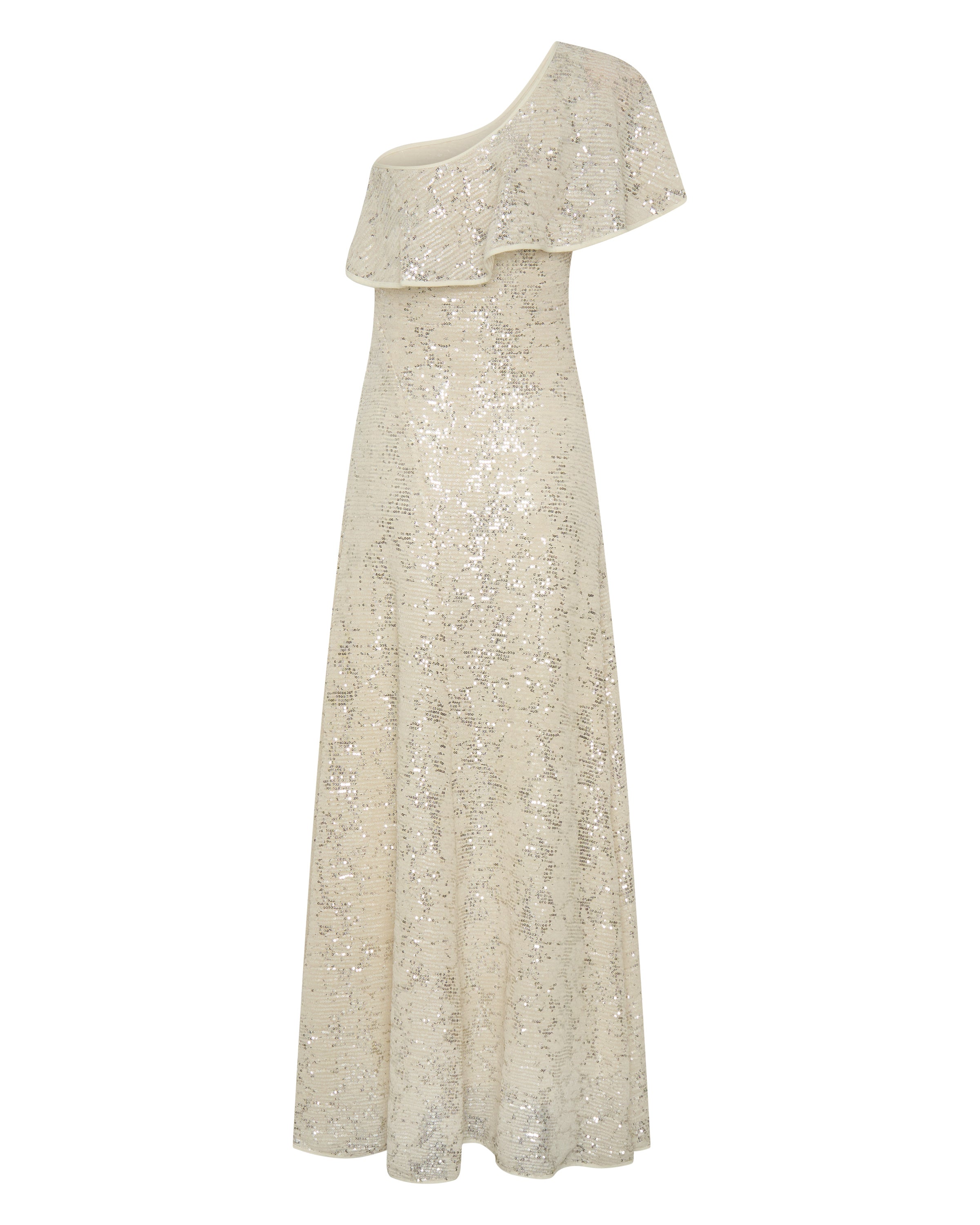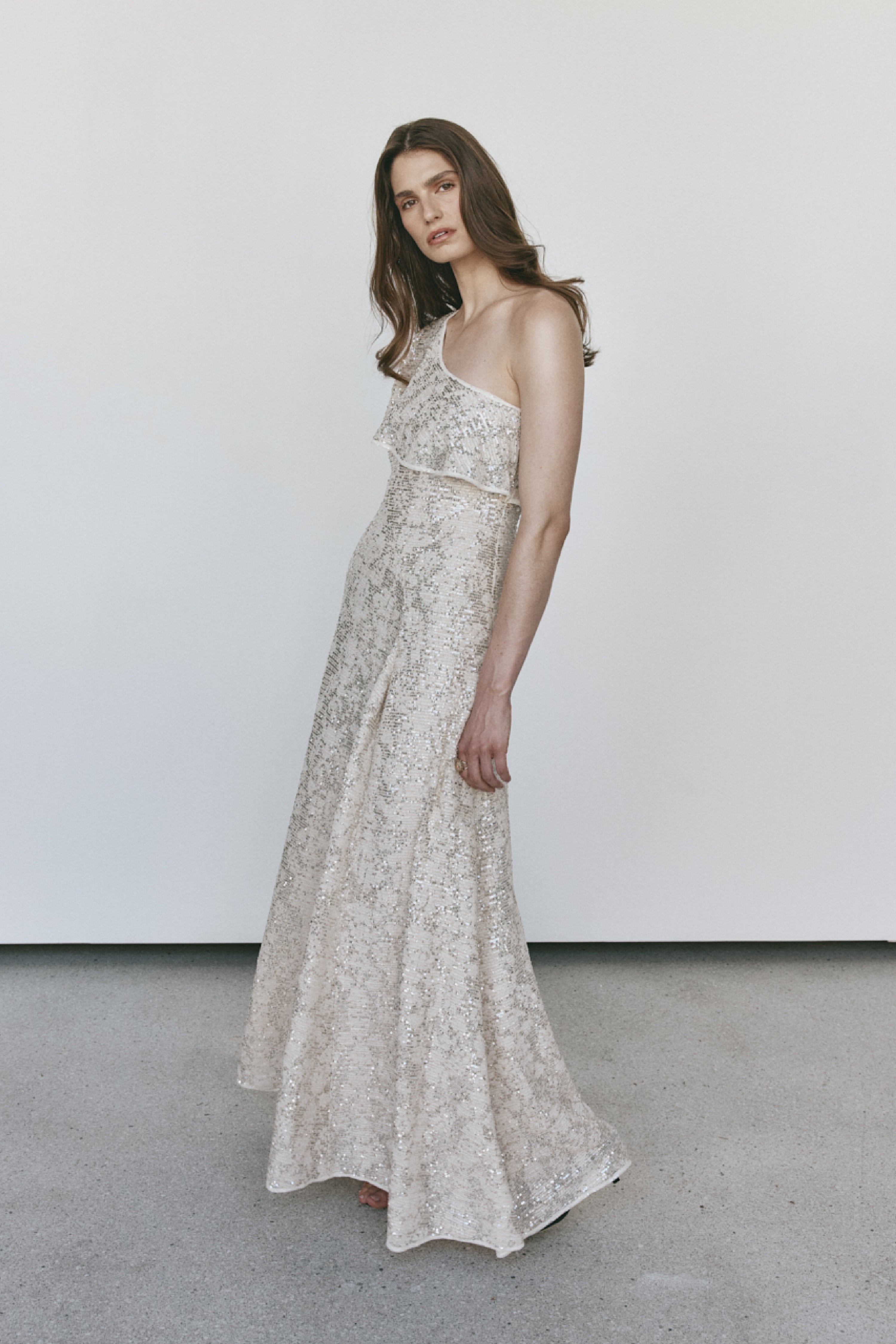 Our one-shoulder Terrazzo Maxi Dress in Starlight Sequin is made in a mid-weight, stretch tulle fabrication adorned with white, silver and pale gold sequins that catch the light with every movement. The silhouette is fitted through the waist and extends elegantly to fluted skirt panels. The neckline features a flared over frill that sweeps from shoulder to underarm to create a dramatic finish to the bodice. Lined in soft tulle mesh for comfort, the dress is finished with soft tulle binding, a discreet side zip and fish-eye hook closure to ensure a secure, flattering fit. Perfect for special occasions when you want to shimmer. This dress fits true to size with limited stretch.
