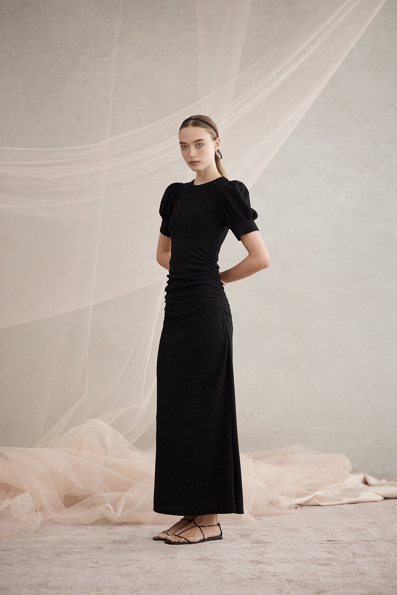 Our Ruched Como Maxi Dress in Black Metallic Knit is designed to flatter the body where ruching detail smooth and contour the body, offering gentle shaping and ease. Puff sleeves with shoulder pad support bring a touch of volume, while a round neckline finished with contrast piping and gold buttons deliver elegant detailing.
