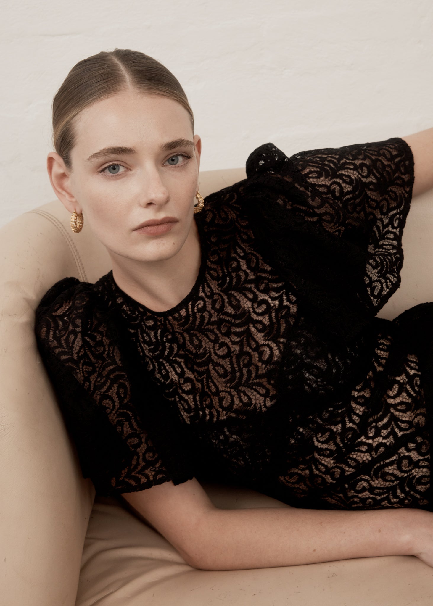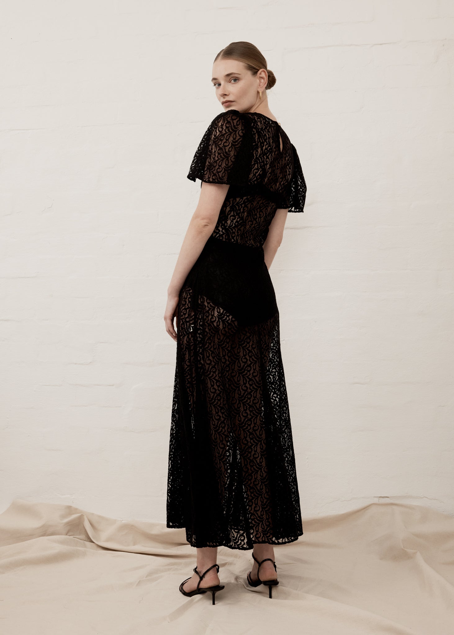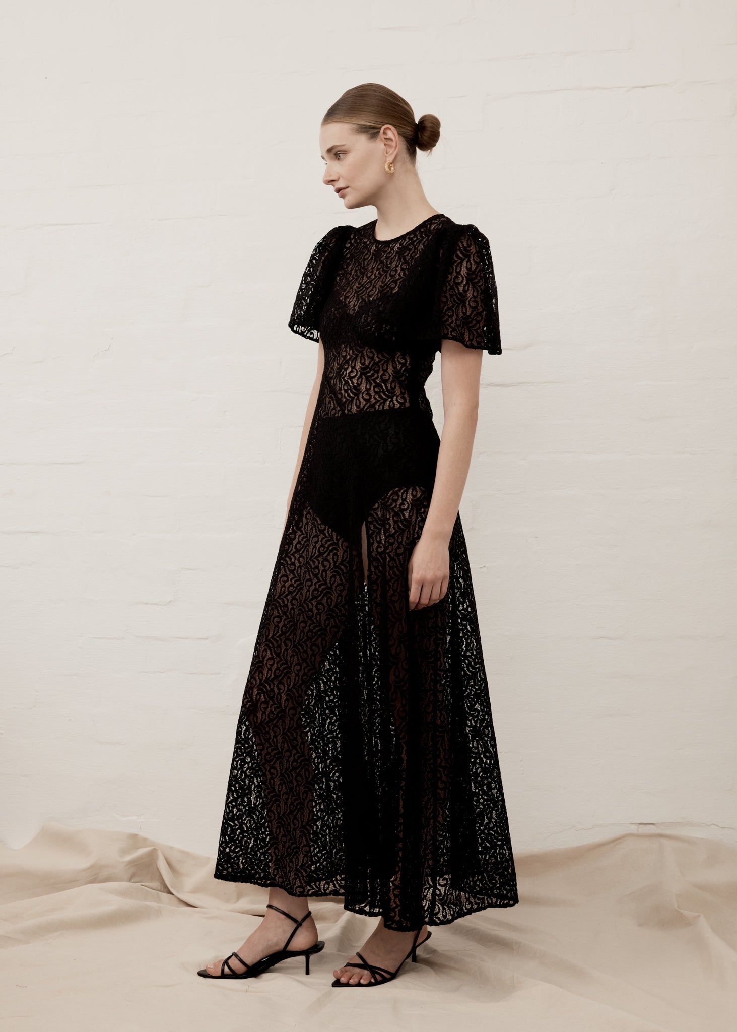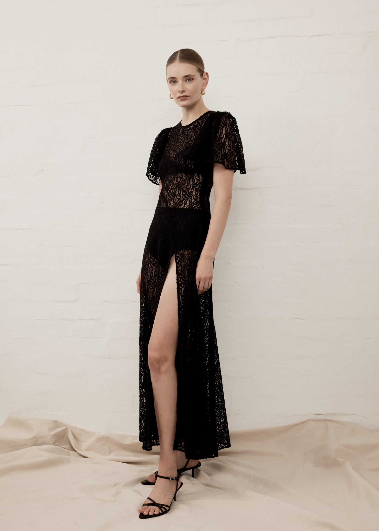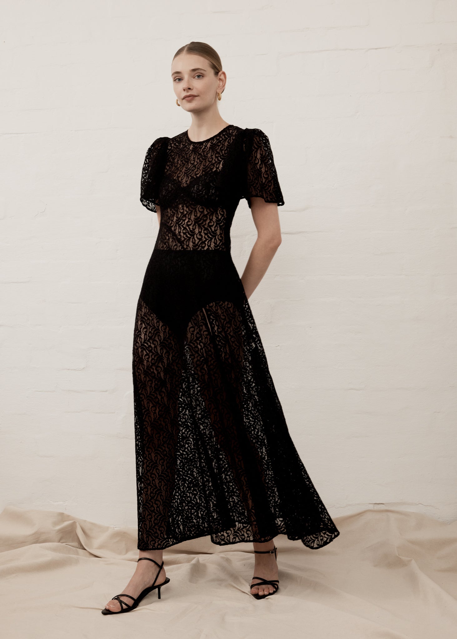Experience timeless sophistication with the Fiore Maxi Dress, a stunning maxi dress made in black cotton lace. This elegant piece showcases a high, round neckline, soft flutter sleeves, and a graceful fluted hemline. The front split adds a touch of allure, creating a maxi dress that is both comfortable and effortlessly chic.