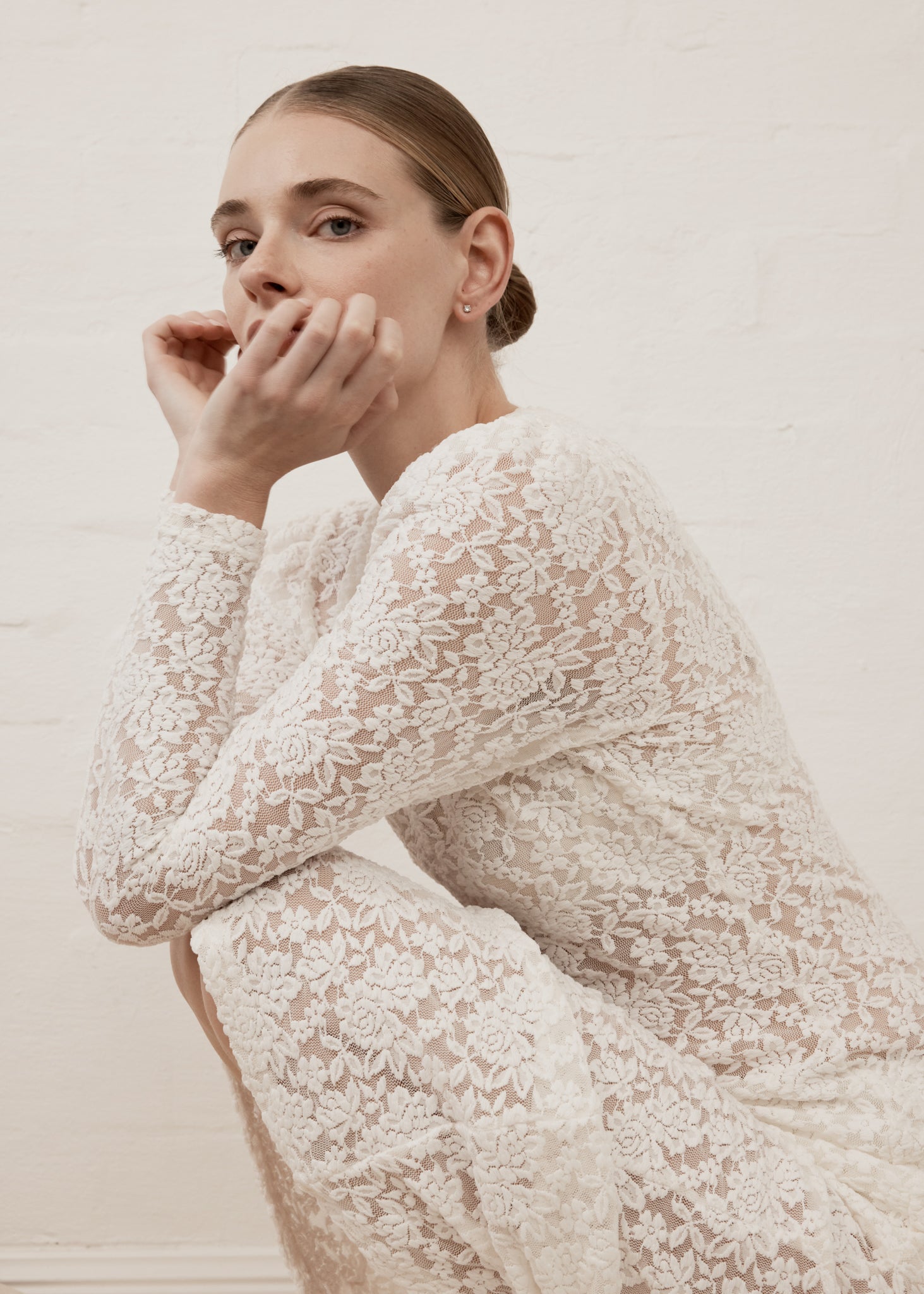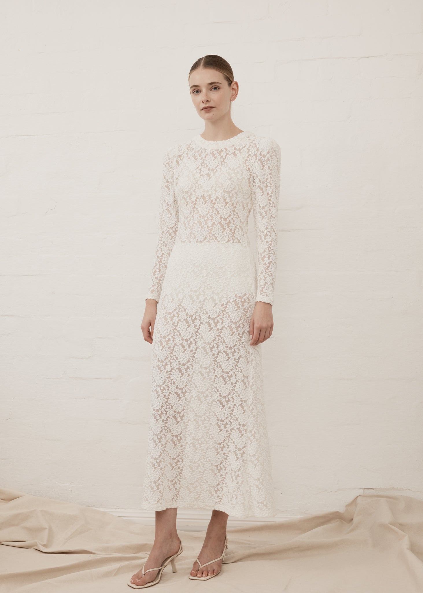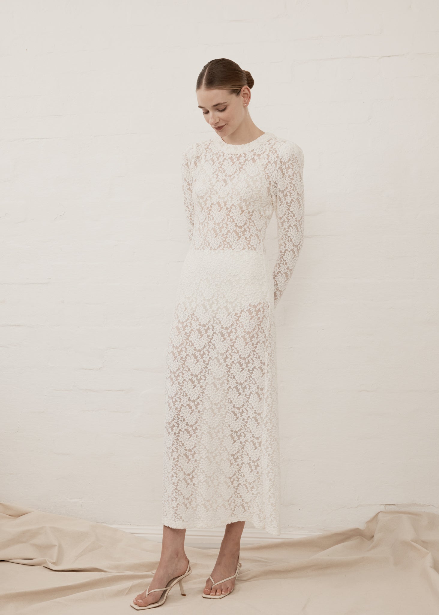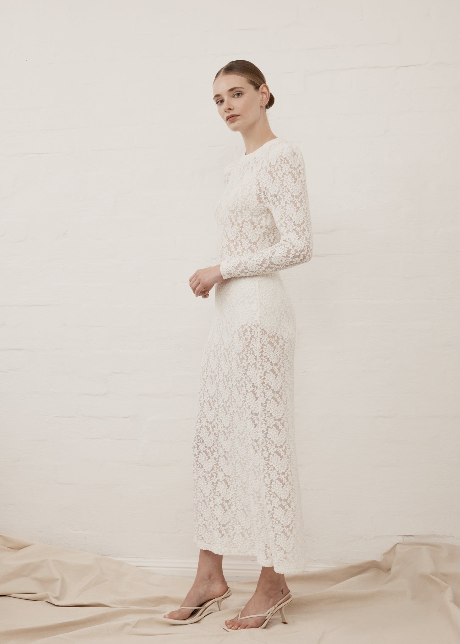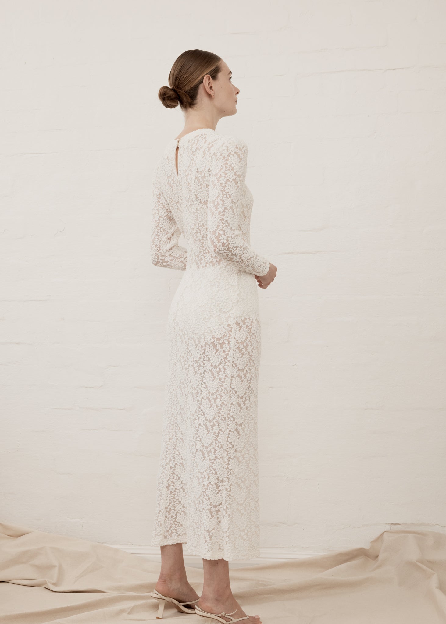 Our Long Sleeve Como Maxi Dress is a fitted, tube-style dress crafted from soft stretch mesh embroidered with floral detailing. The dress features a round neckline with piping detail, complemented by long sleeves with gathered puff detailing at the shoulders. A flattering fishtail hemline adds a touch of drama and winter elegance to this flattering silhouette.