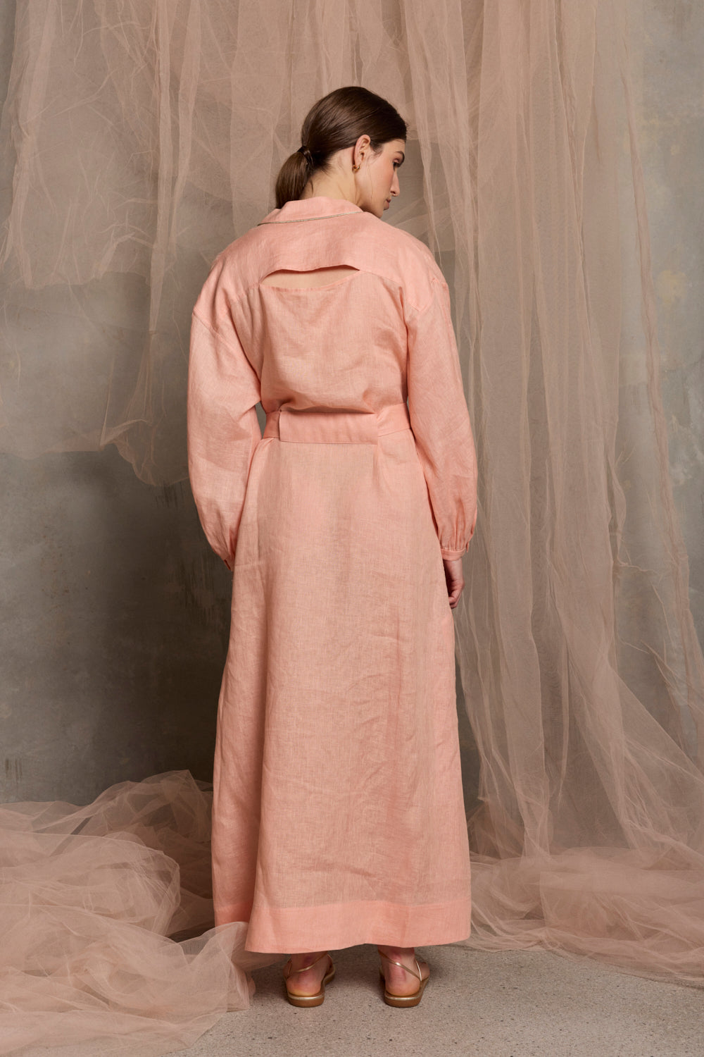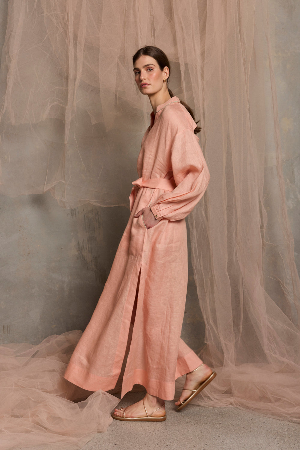 Designed for a relaxed fit, the Plaza Kaftan in Pink Quartz Linen features a flattering V-neckline and structured collar is accented with gold metallic piping and gold button detail. Voluminous balloon sleeves are finished with elastic cuffs and gold buttons. Side splits, side pockets and a self-tie waist create effortless style - wear it pulled in at the waist or loose for a breezy summer look. The open shoulder yolk adds contemporary flair. Pair it with or without the slip for versatile styling. Designed to wear oversize; for a more fitted look, choose one size smaller than your usual size.