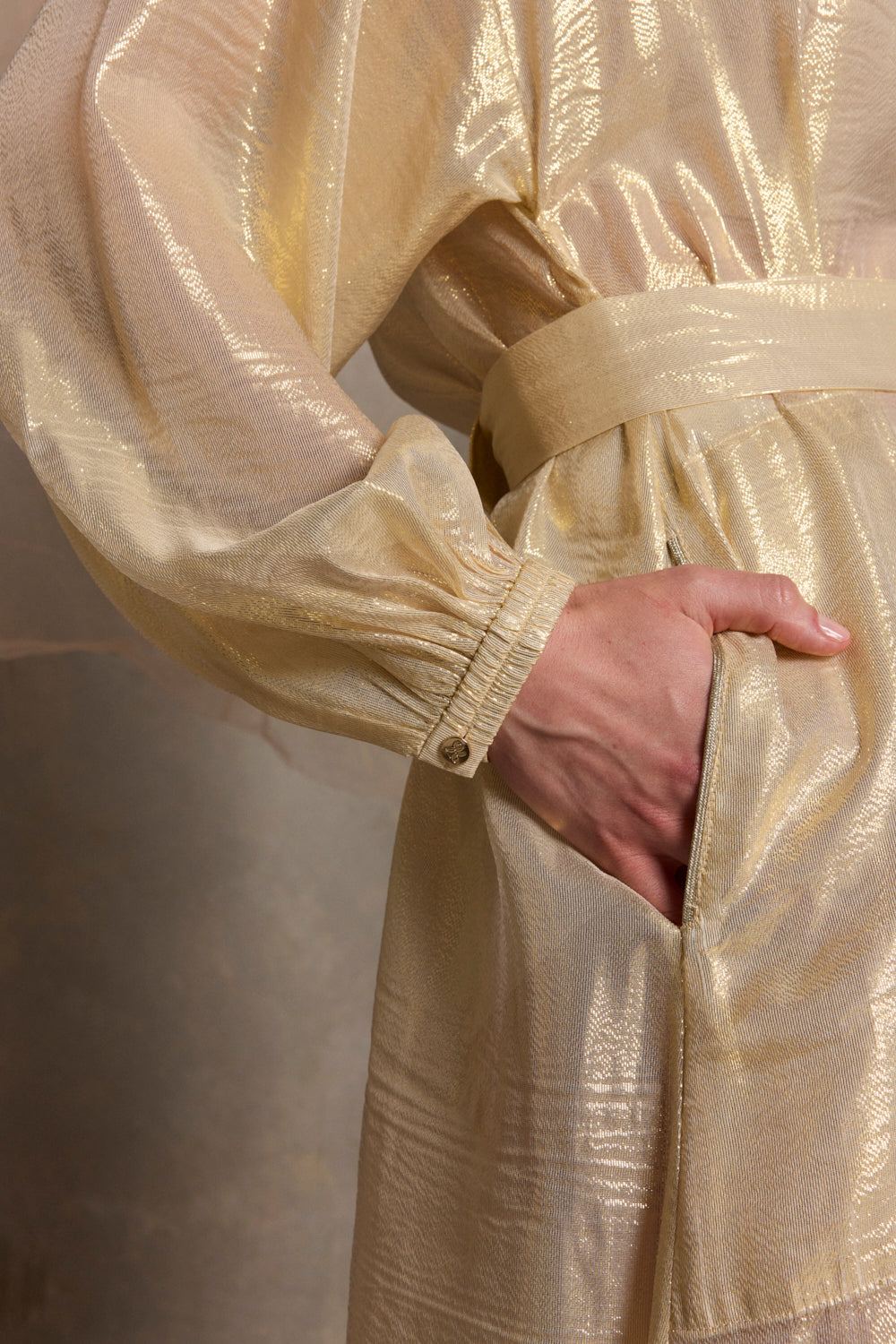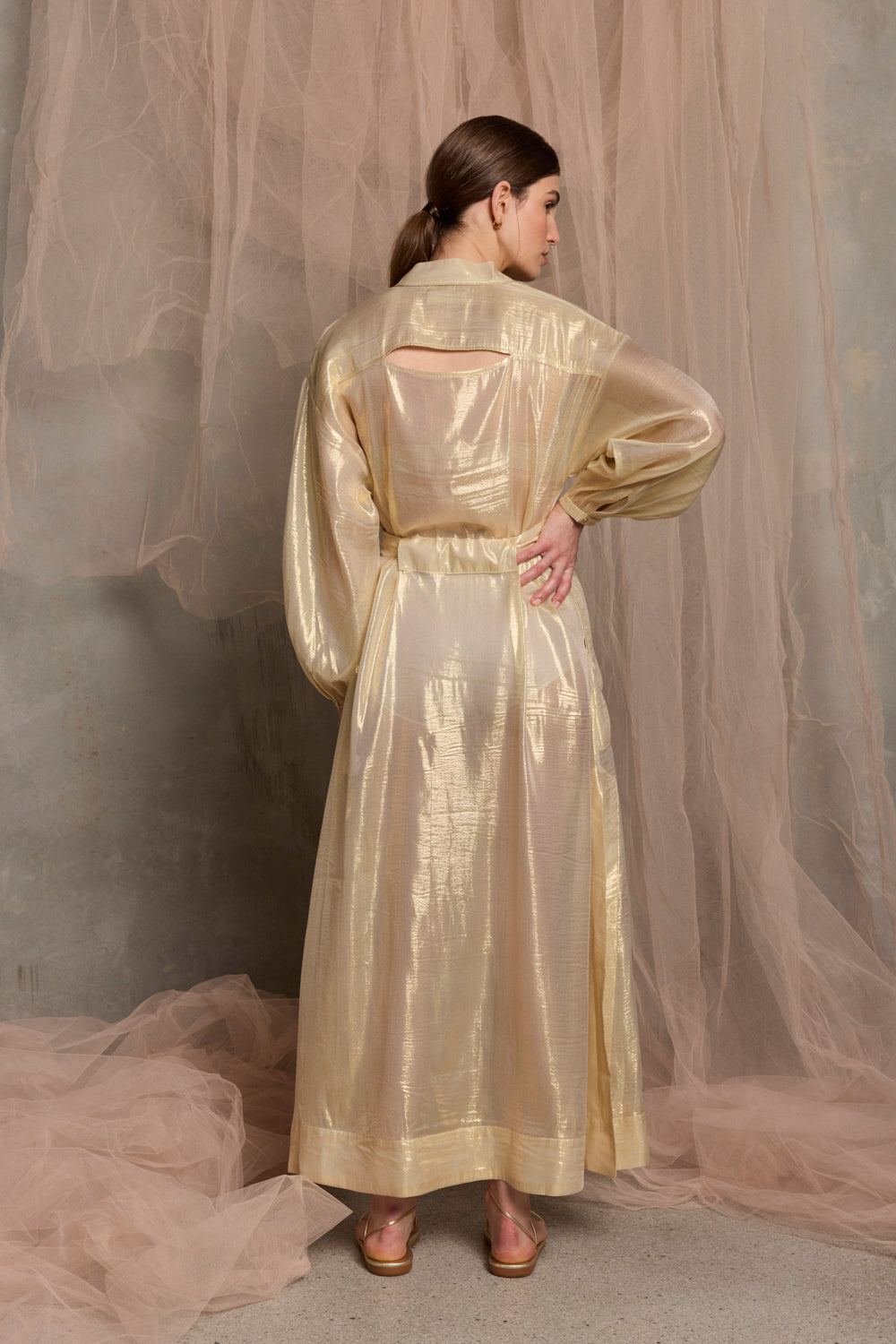 The Plaza Silk Kaftan in shimmering Gold Foil is a luxurious full-length piece made in fine silk metallic fabric that catches the light. The V-neckline features an elegant gold button detail, while the structured collar stand is trimmed with metallic piping. Voluminous balloon sleeves with elastic cuffs and matching gold buttons, side splits and a self-tie waist create effortless style. The open shoulder yolk adds contemporary flair. Wear it solo or layer over a slip for versatile elegance that transitions from day to evening.